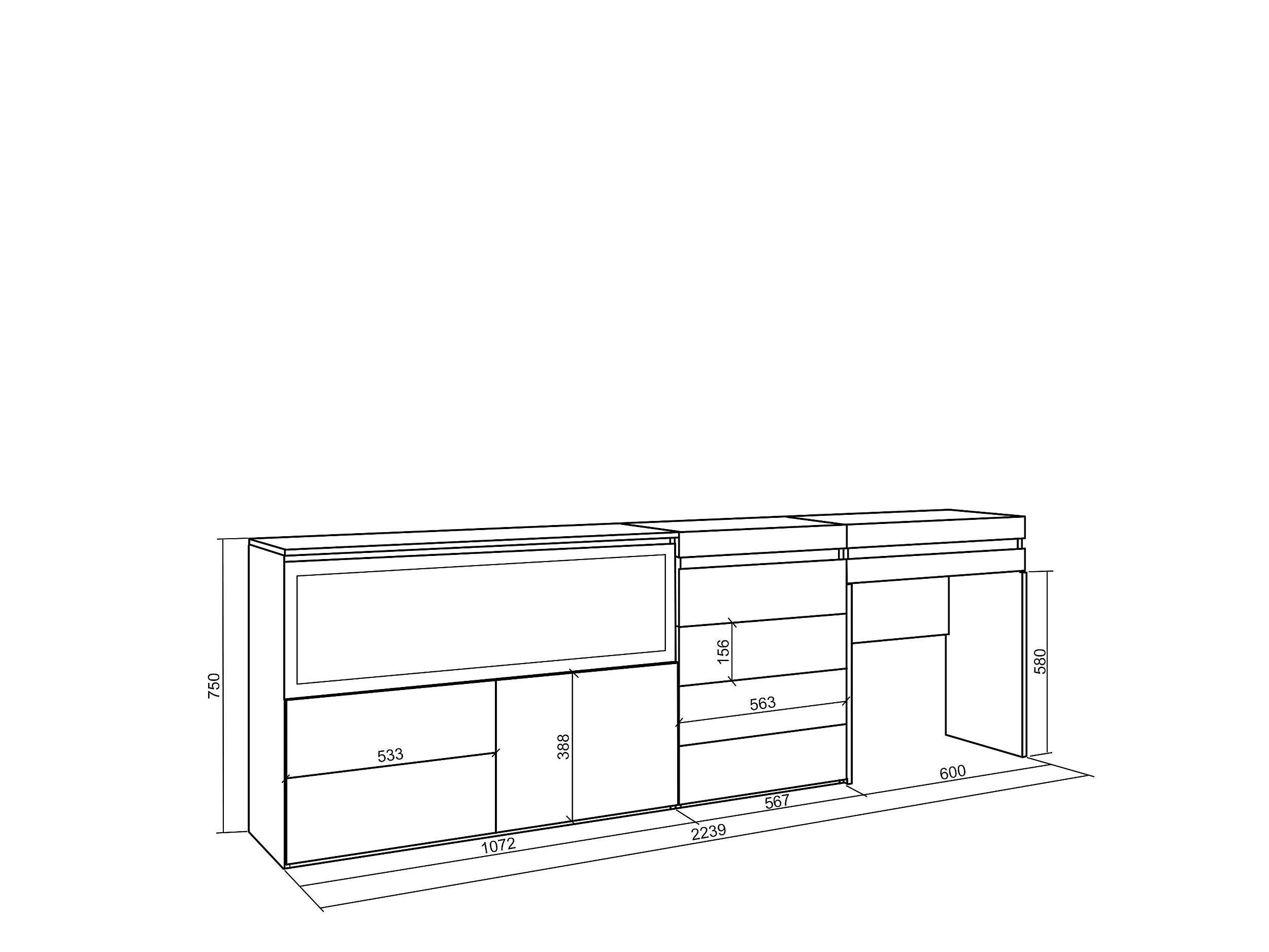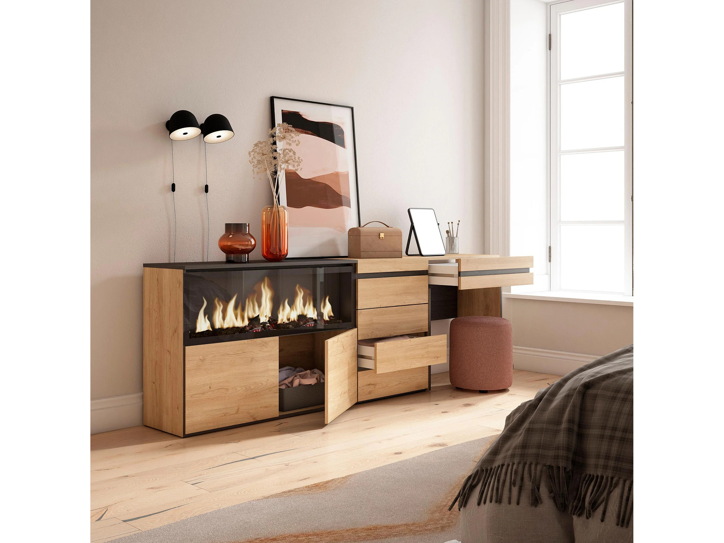 Kaptafel, Make-uptafel, 234x35x75cm, Met lade, Elektrische haard XXL, Ladekast, Commode, Eiken