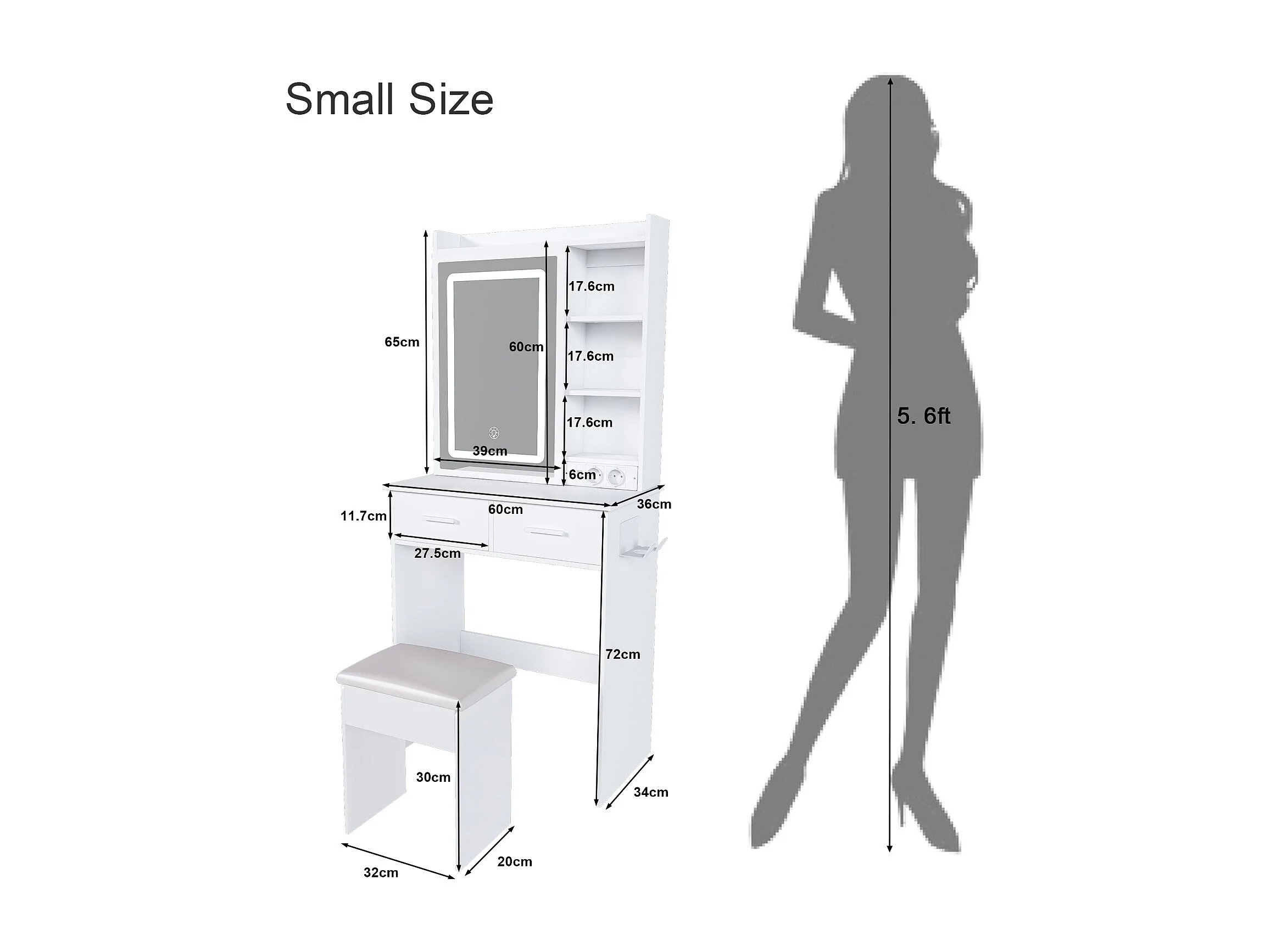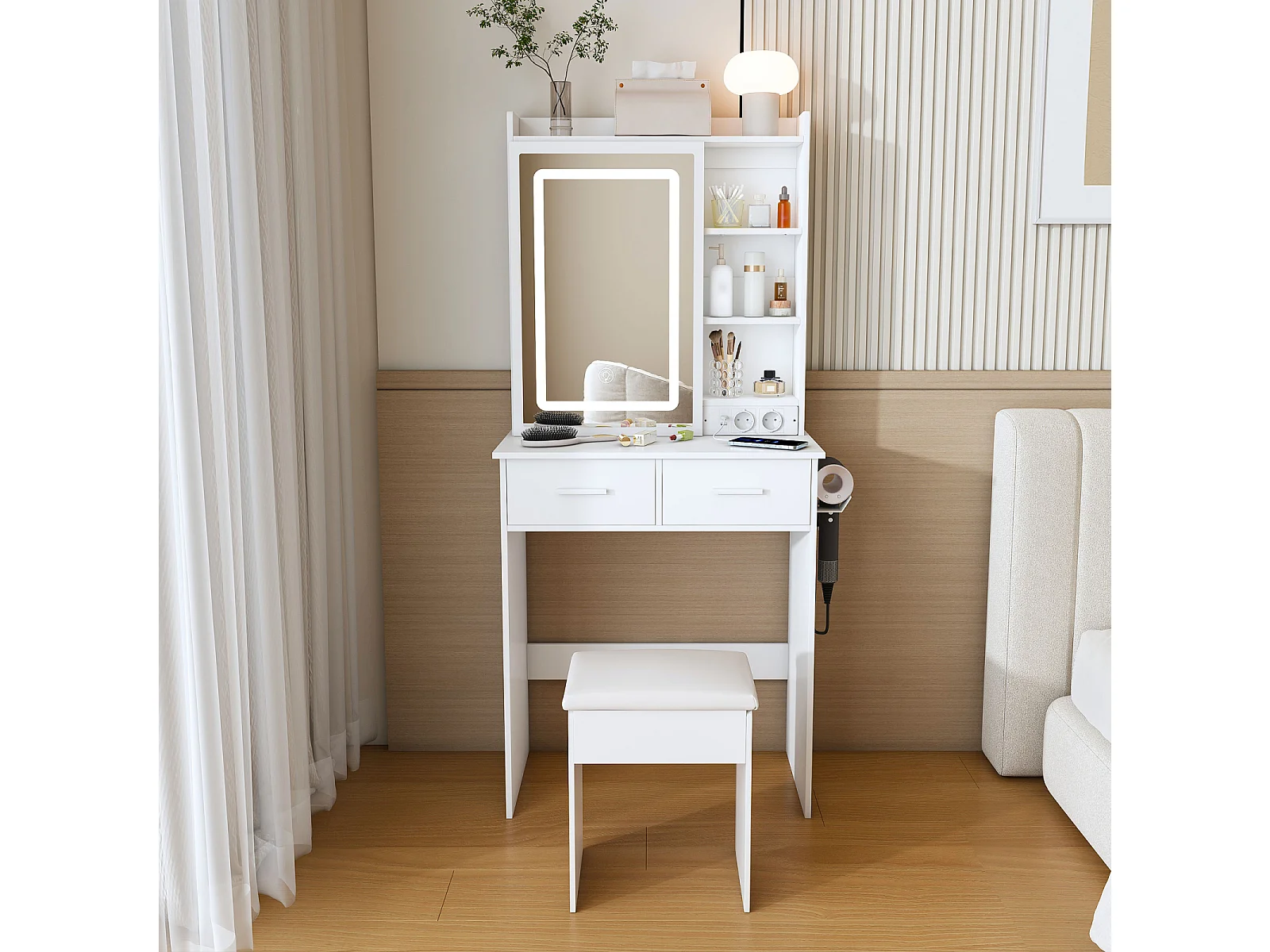 Kaptafel met spiegel, verstelbare ledverlichting en stopcontact, gestoffeerde kruk en opbergruimte - 60 x 136 x 36 cm
