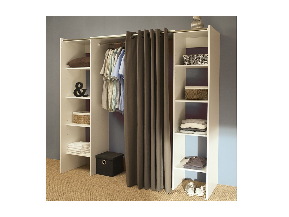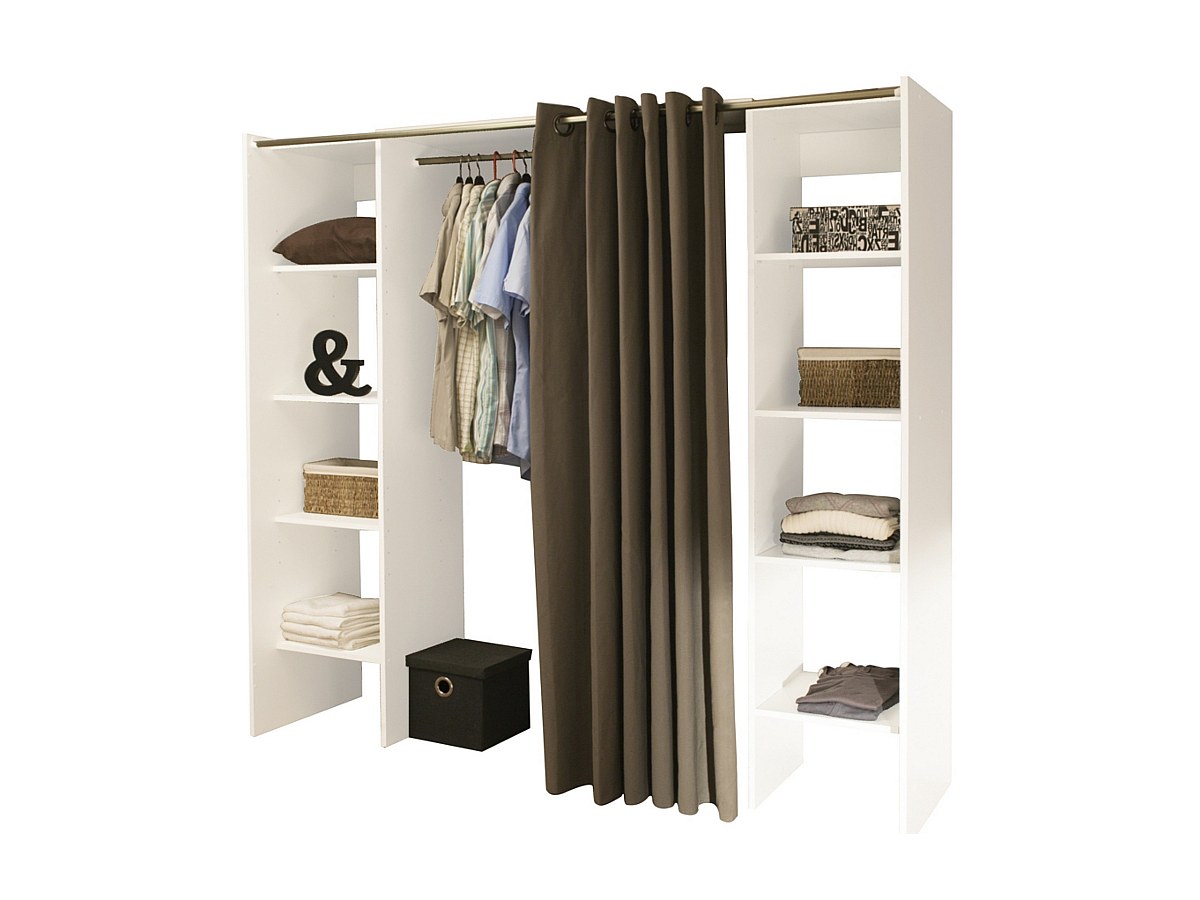 De twee kolommen samengesteld uit talrijke legplanken zijn ideaal om uw kleding, schoenen of nog dozen op te bergen. Wat betreft de jasjes, kleedjes en kostuums, zij zullen een plaatsje vinden in de grote centrale hangkast. Het taupekleurig of antraciet gordijn zorgt voor de final tocu van deze bijzonder praktische en stijlvolle dressing.