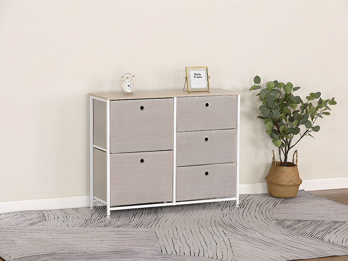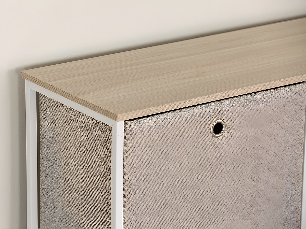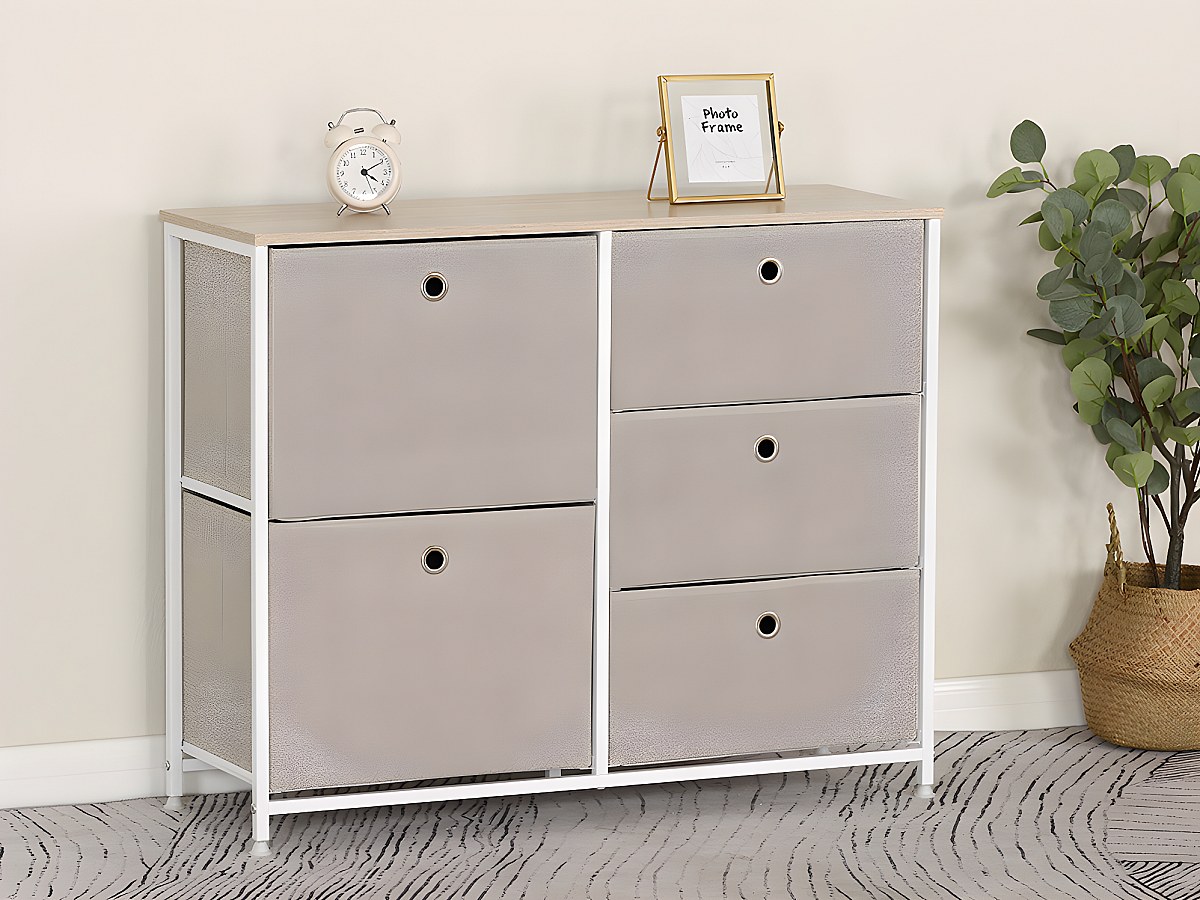 Kast WIMBLEDON - 5 lades - Metaal en stof - Wit en beige