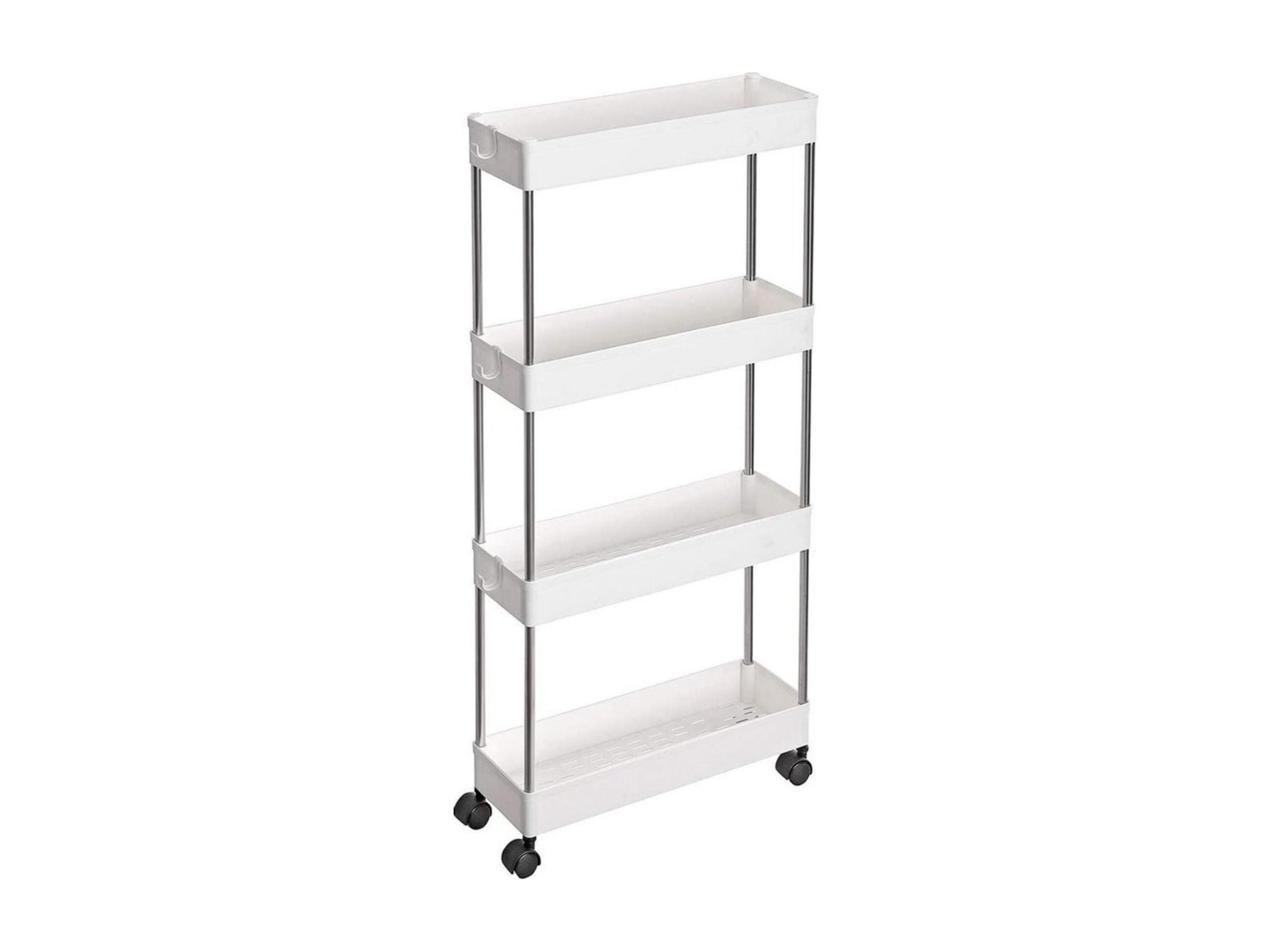 Opbergwagen met 4 planken, met wielen en remmen, compact design, staal, wit (40x19x90 cm)