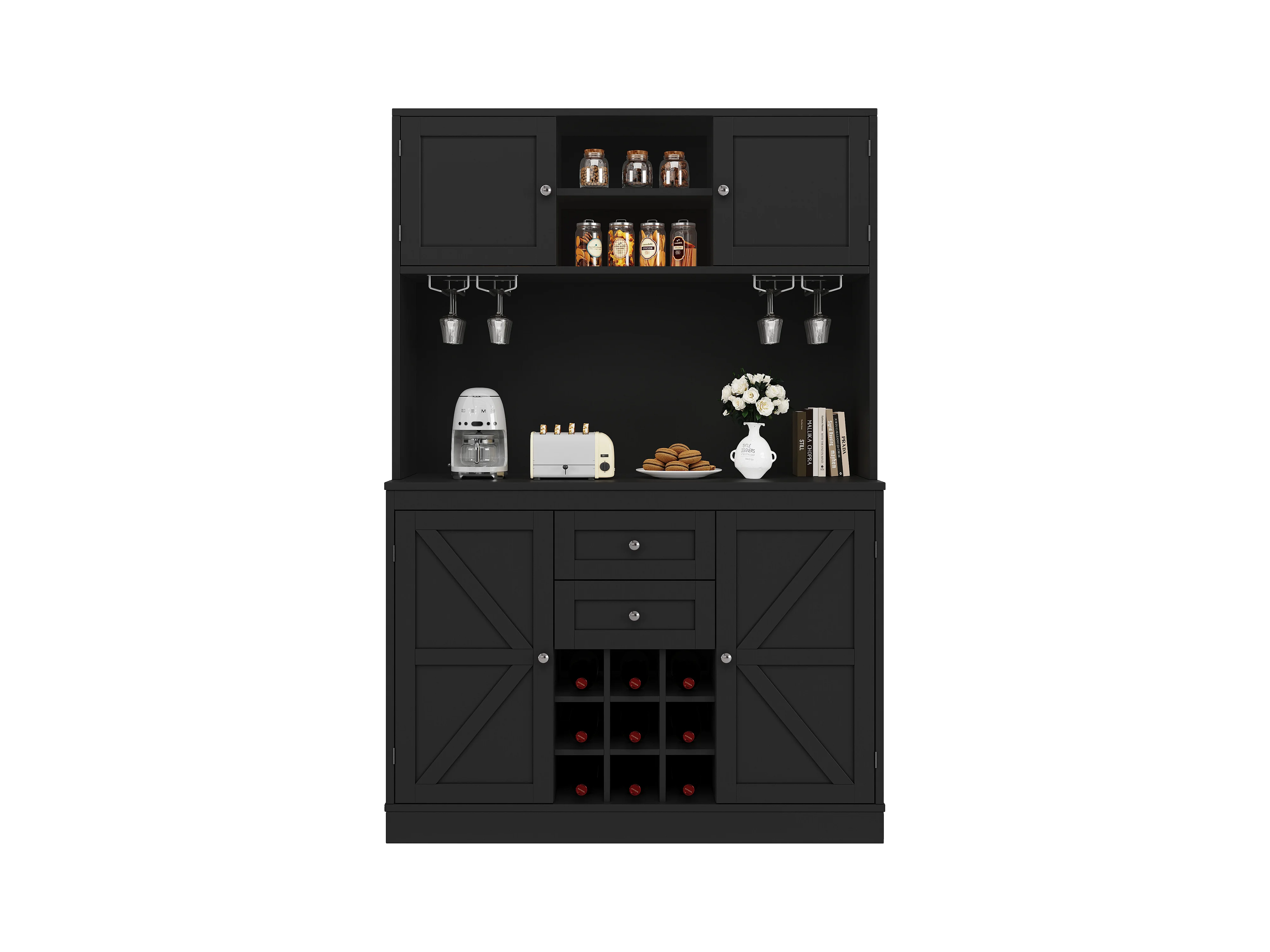 Keukenbuffet - 4 deuren en 2 laden - Verstelbare planken en wijnrekken - Zwart