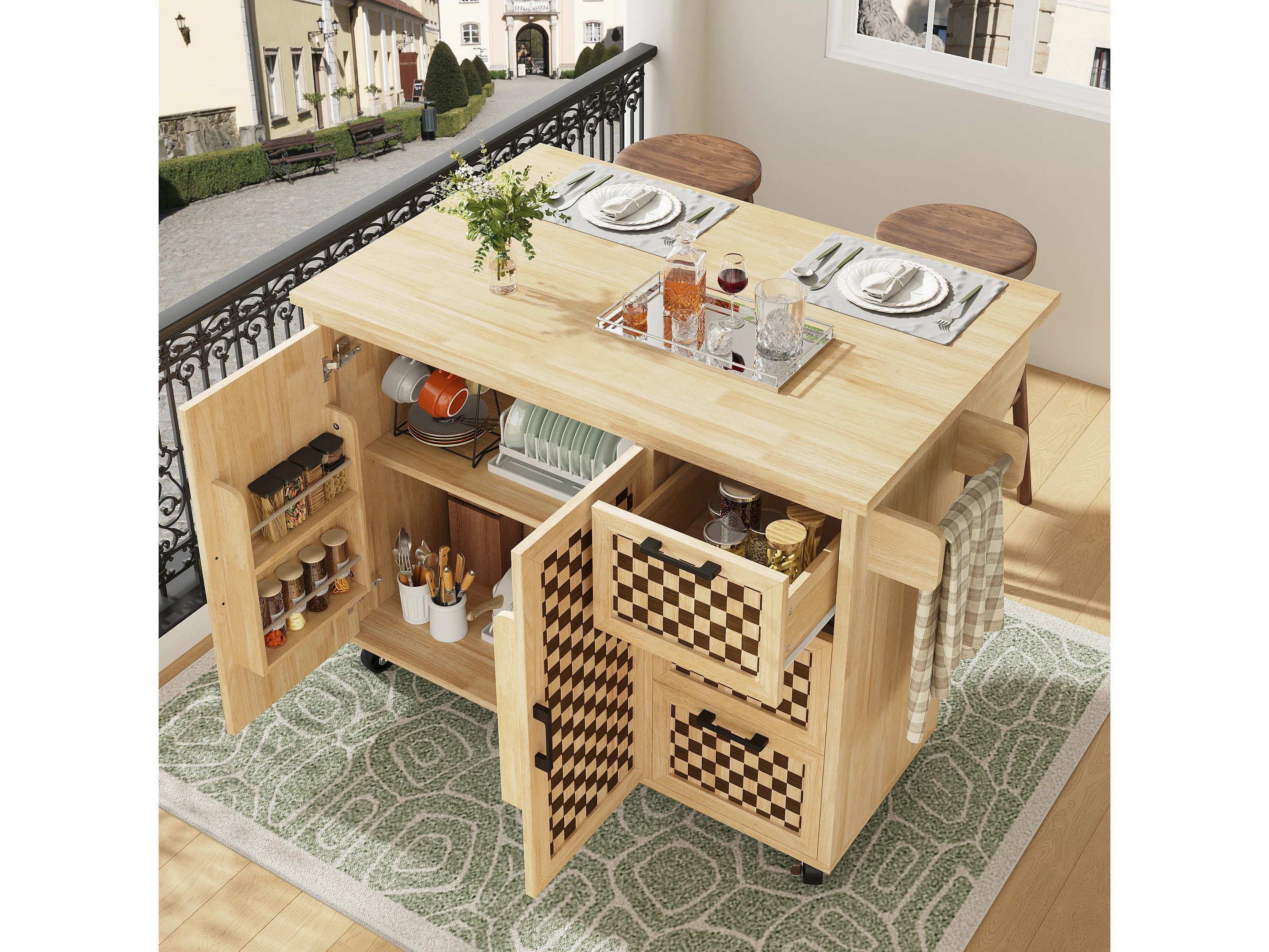 Keukeneiland met 2 deuren en 3 laden, uitschuifbaar blad, dambordpatroon, naturel