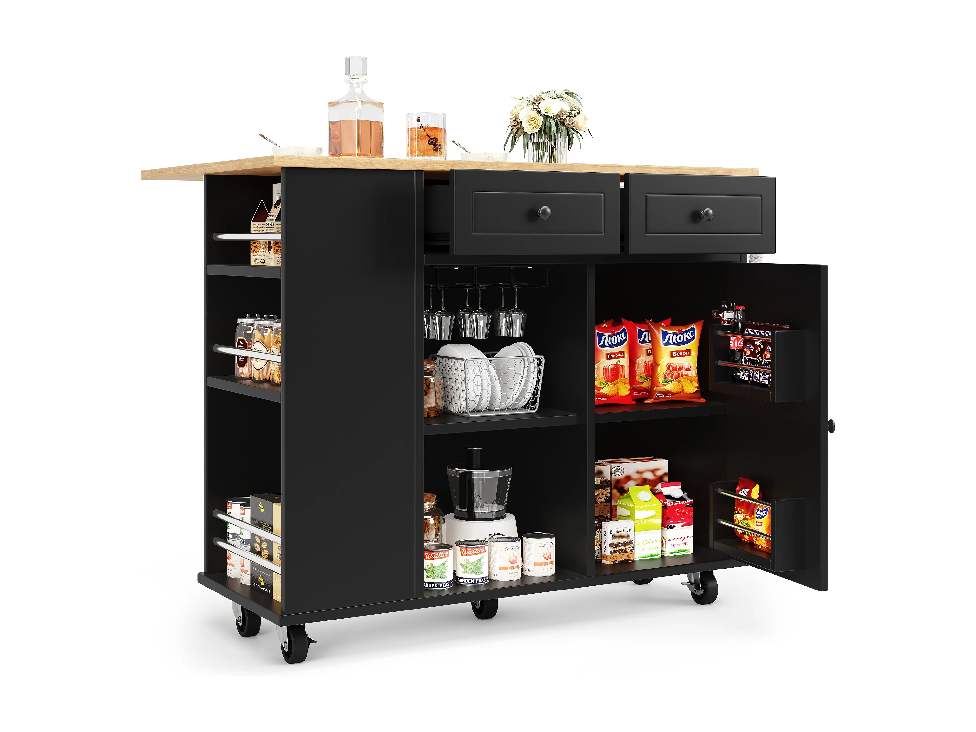 Keukeneiland met 2 lades, 1 deur en wijnglasrek - serveerwagen met houtnerfafwerking - Zwart