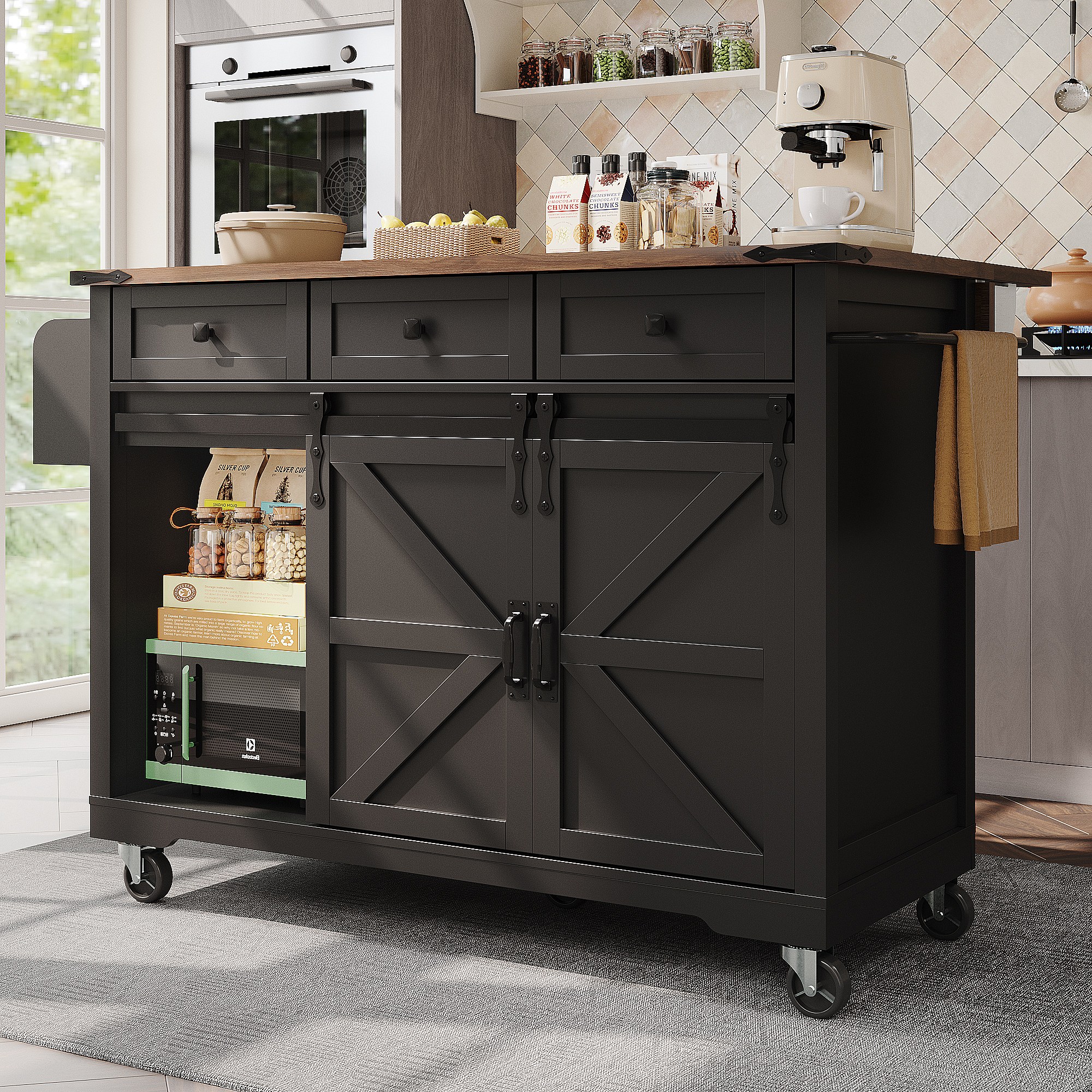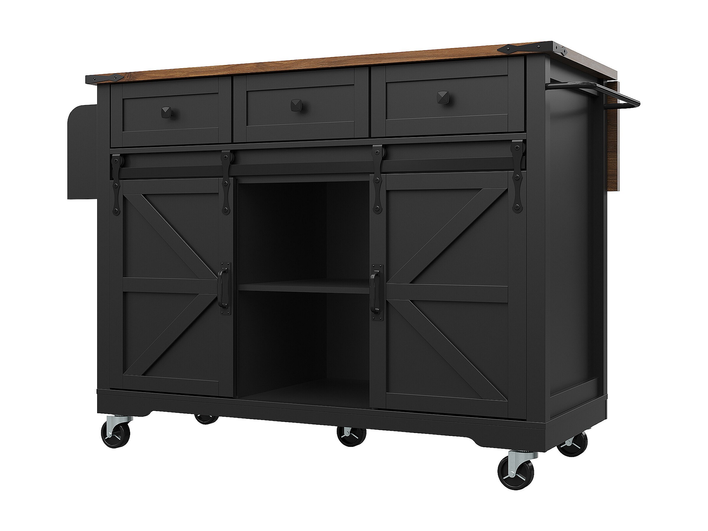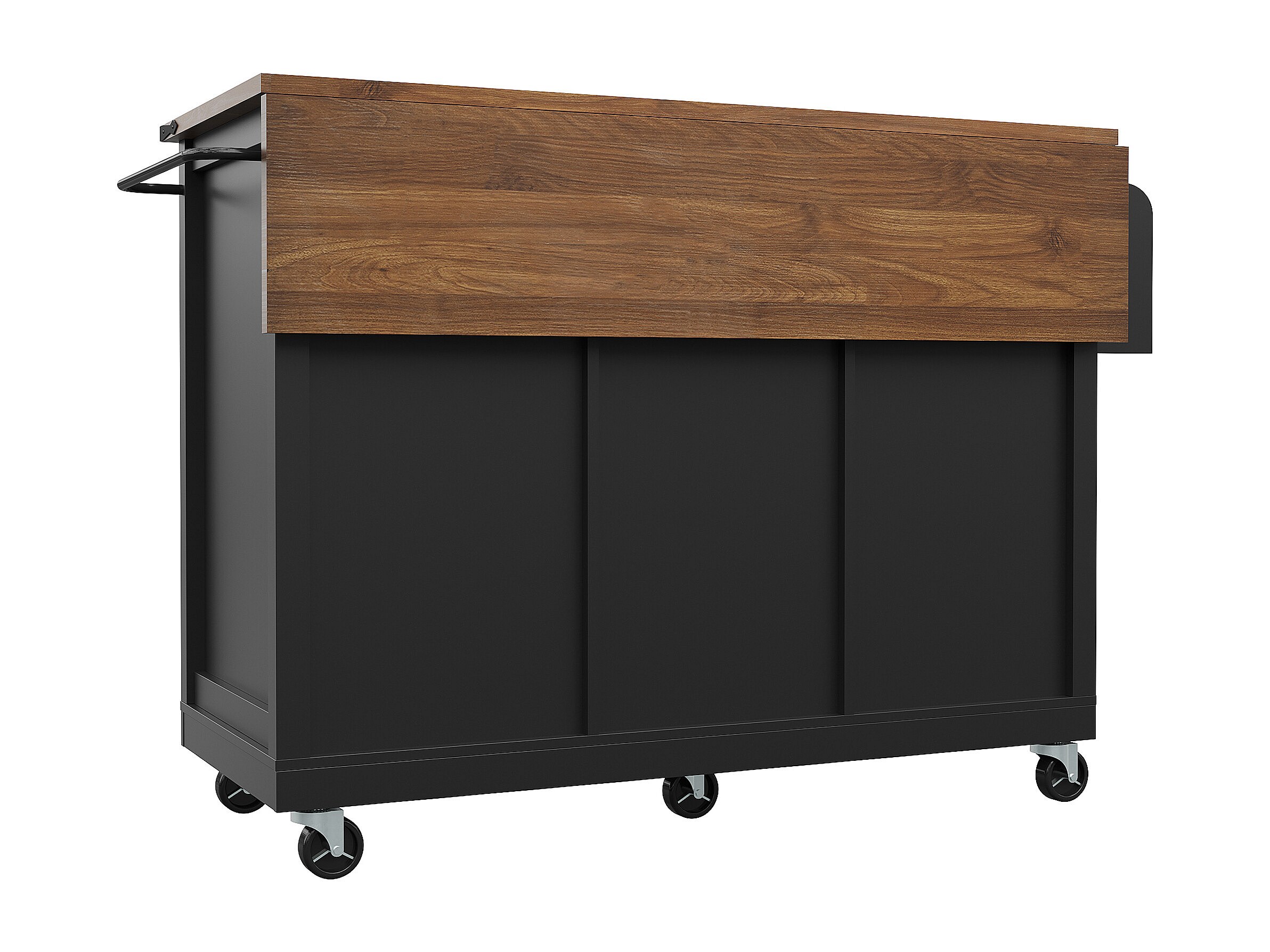 Zwarte keukentrolley met opklapbaar blad - Middeneiland met 2 deuren en 3 lades - Handdoekenrek en kruidenrek