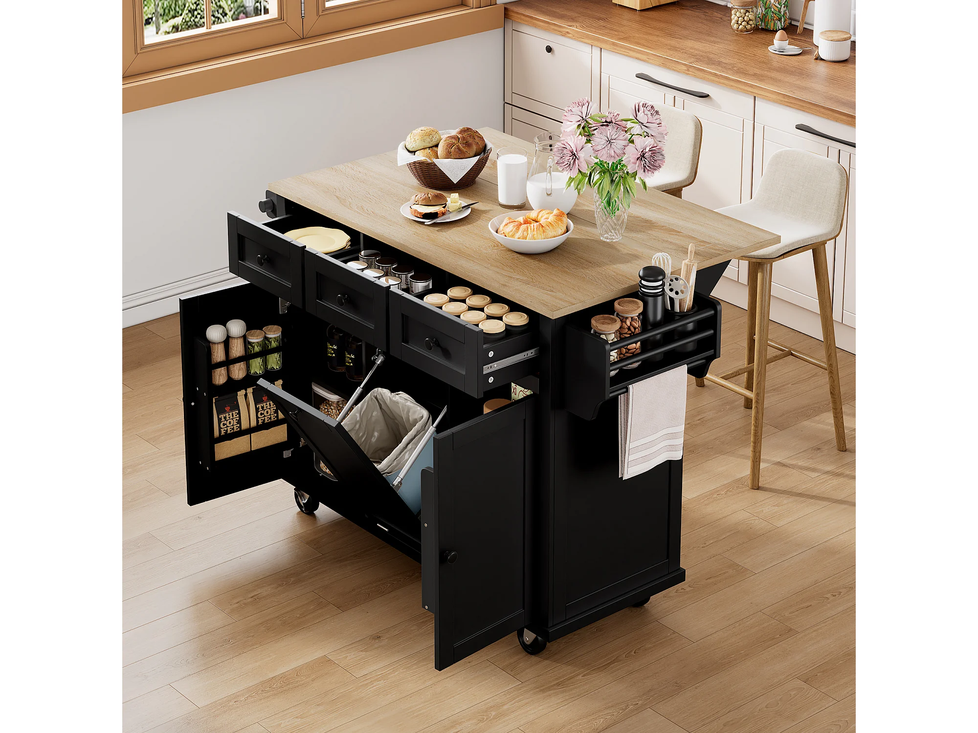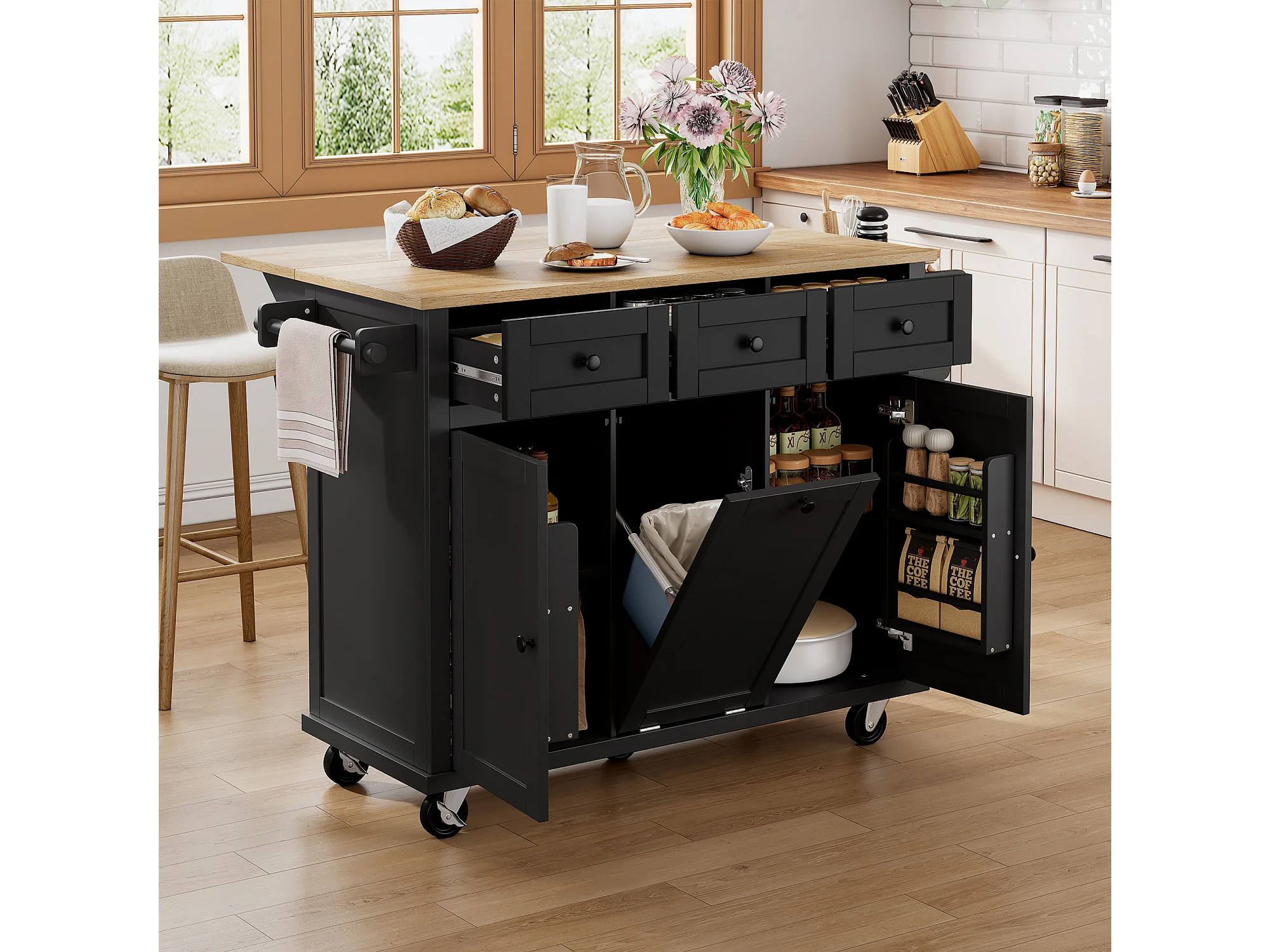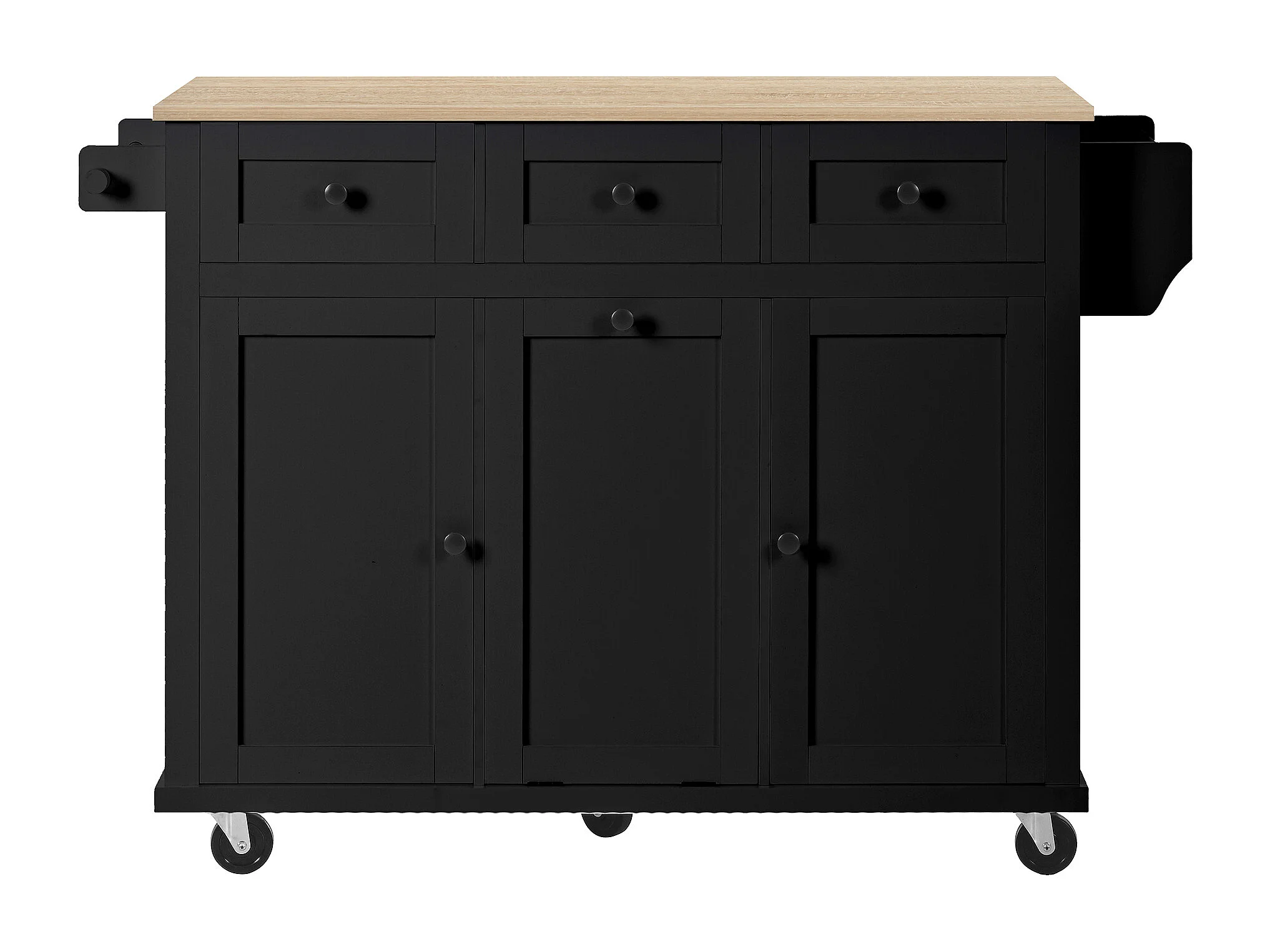 Keukeneiland op wielen - 131,2 x 46,2 / 76,2 x 92,7 cm - inklapbaar blad - met 3 deuren + 3 lades - MDF - zwart