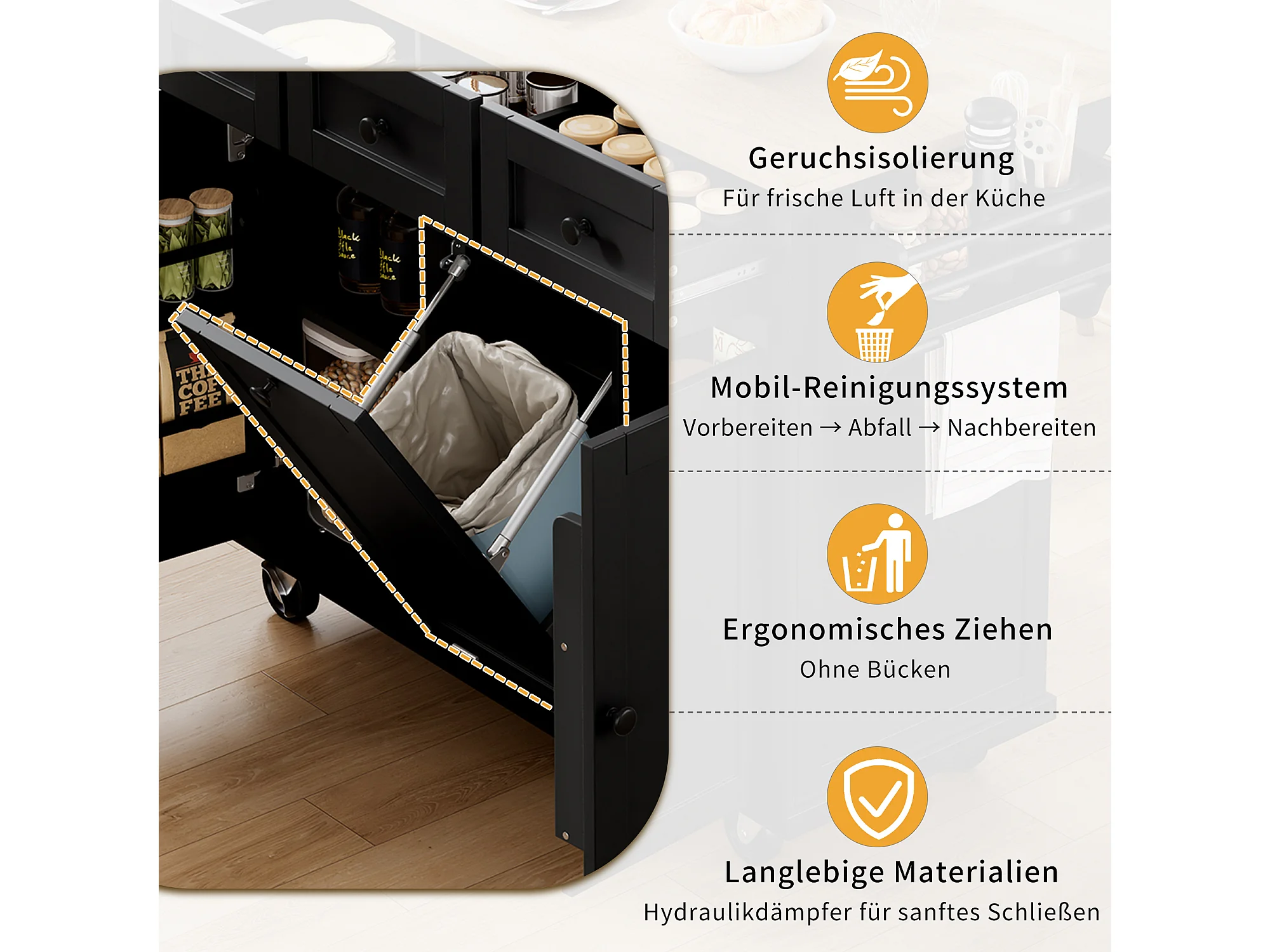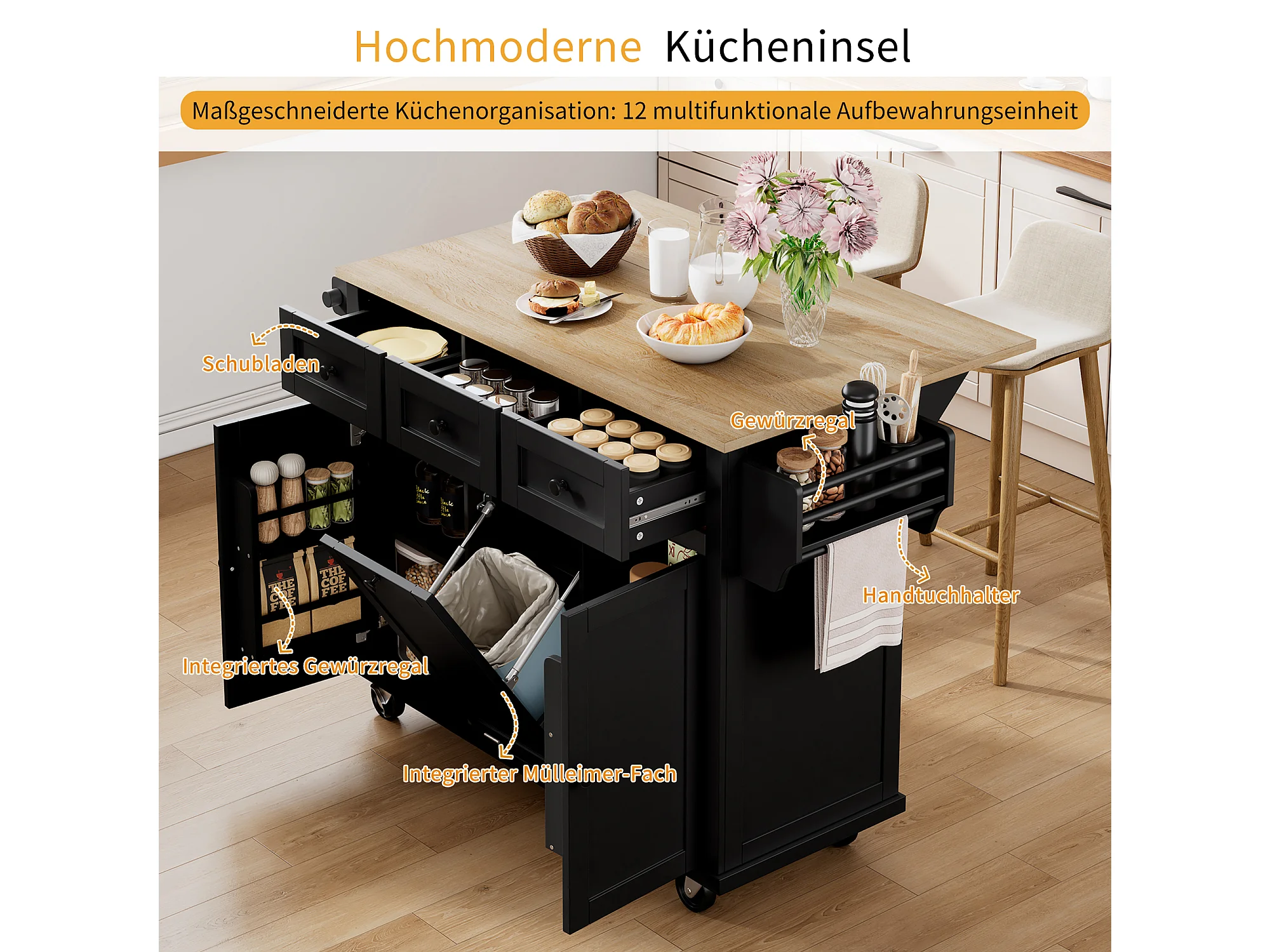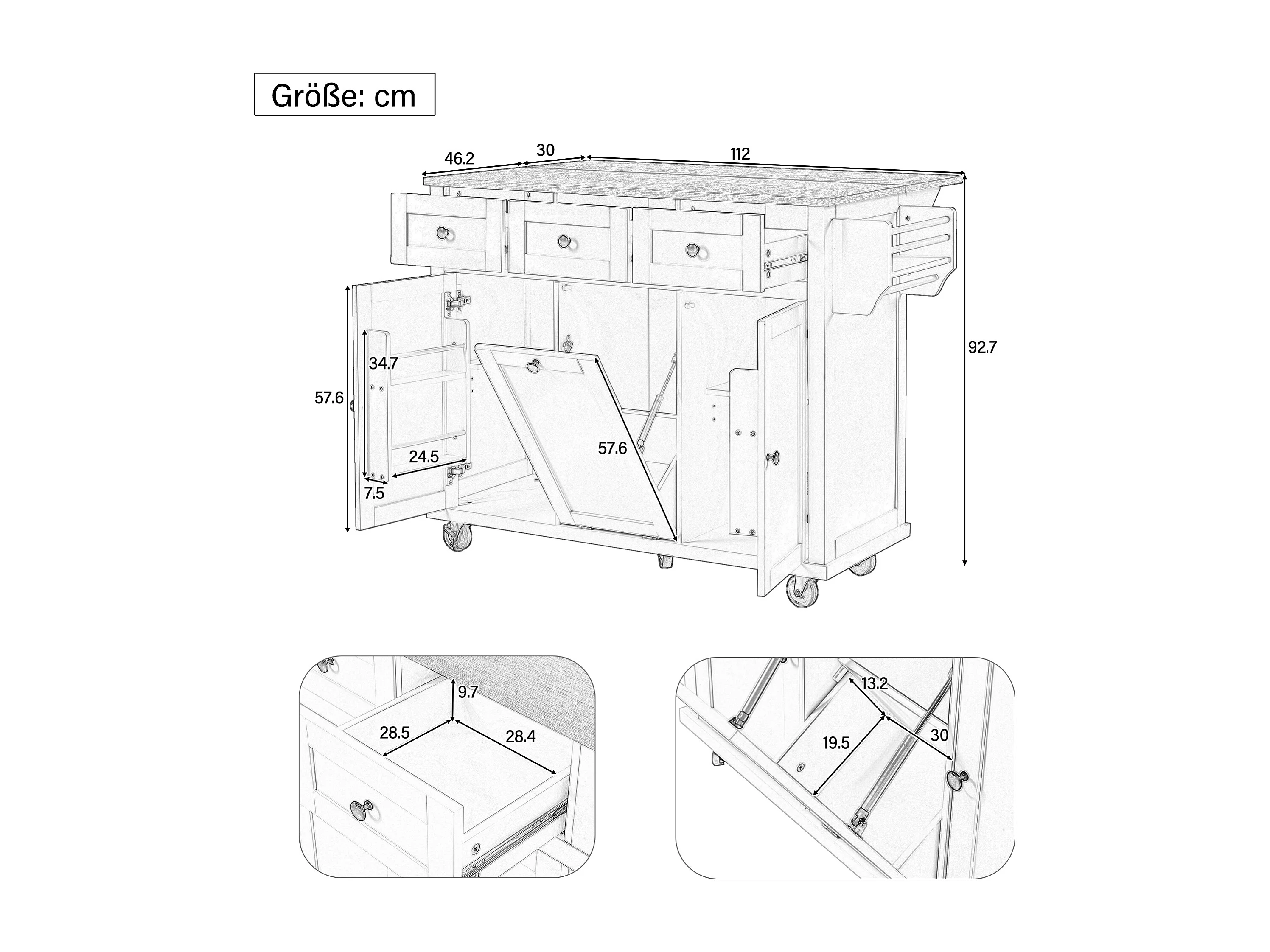 Keukeneiland op wielen - 131,2 x 46,2 / 76,2 x 92,7 cm - inklapbaar blad - met 3 deuren + 3 lades - MDF - zwart