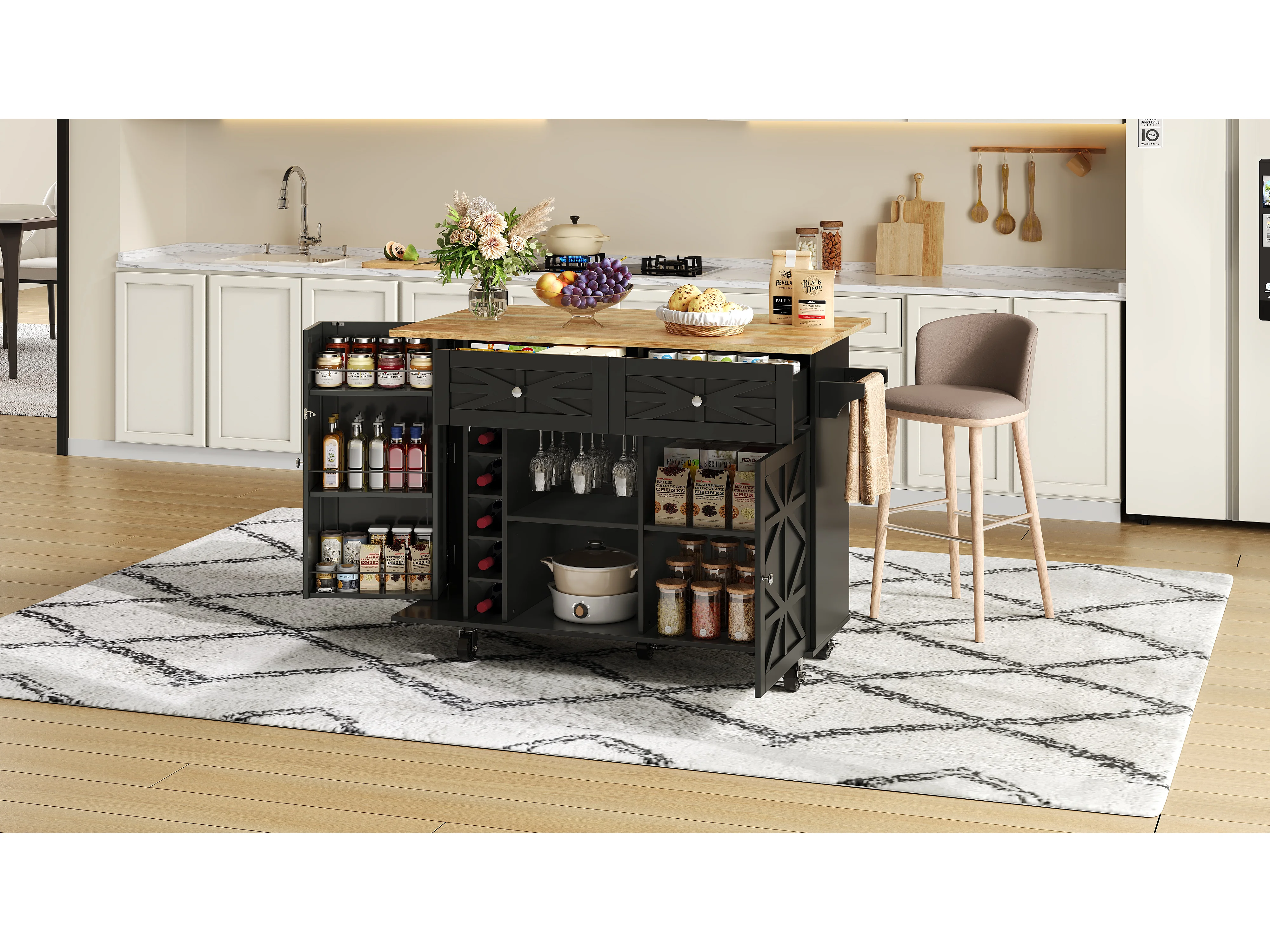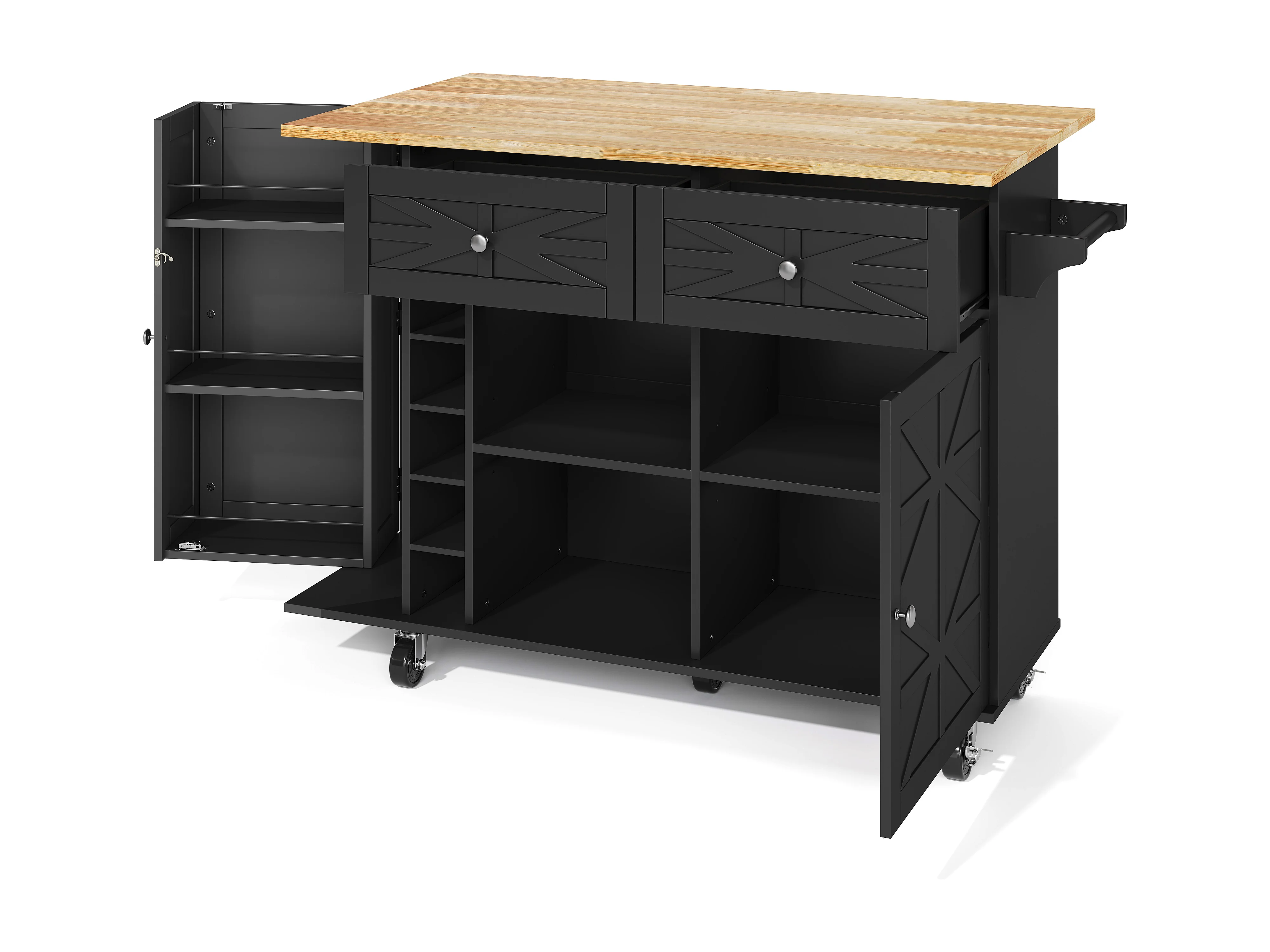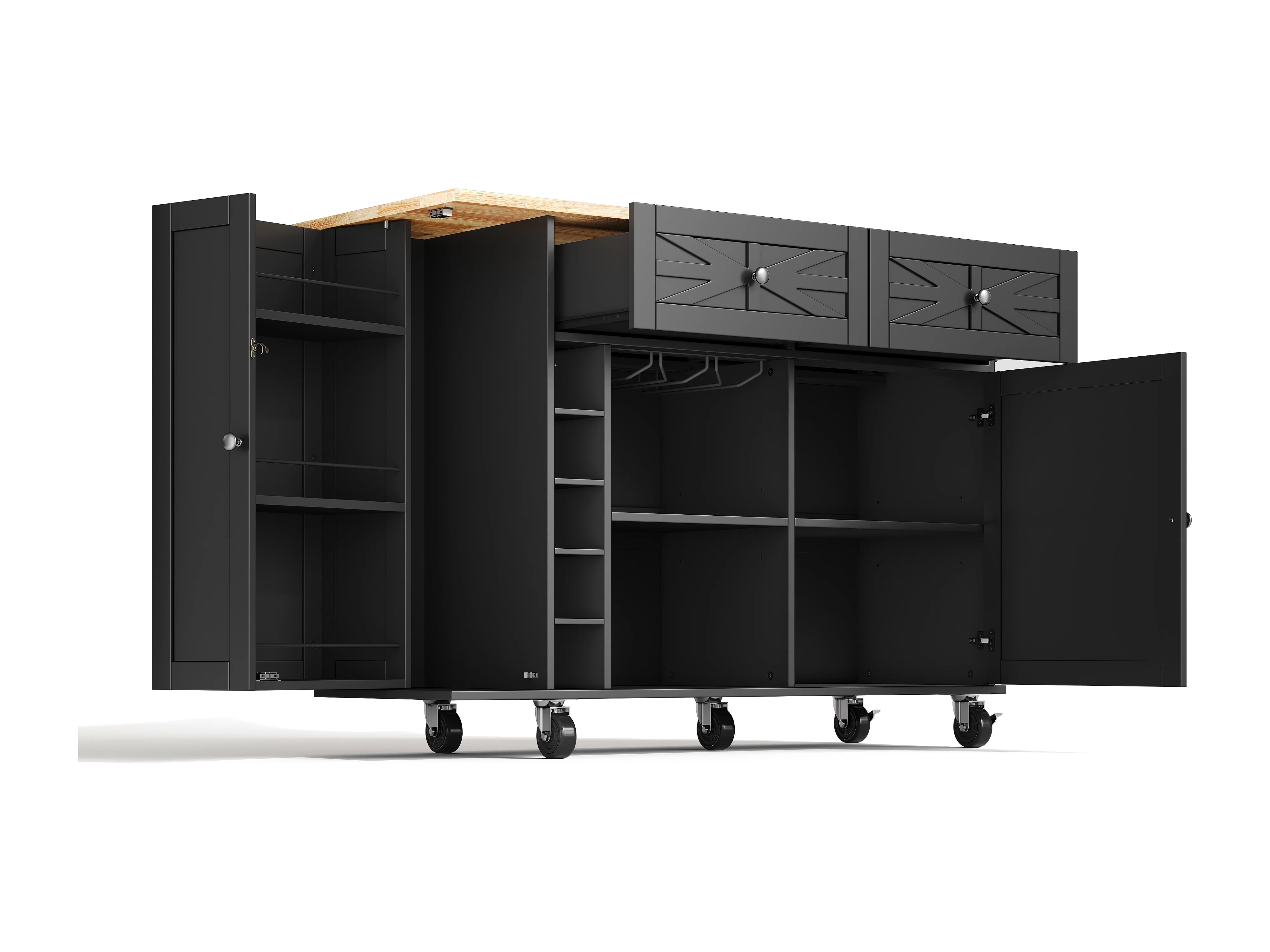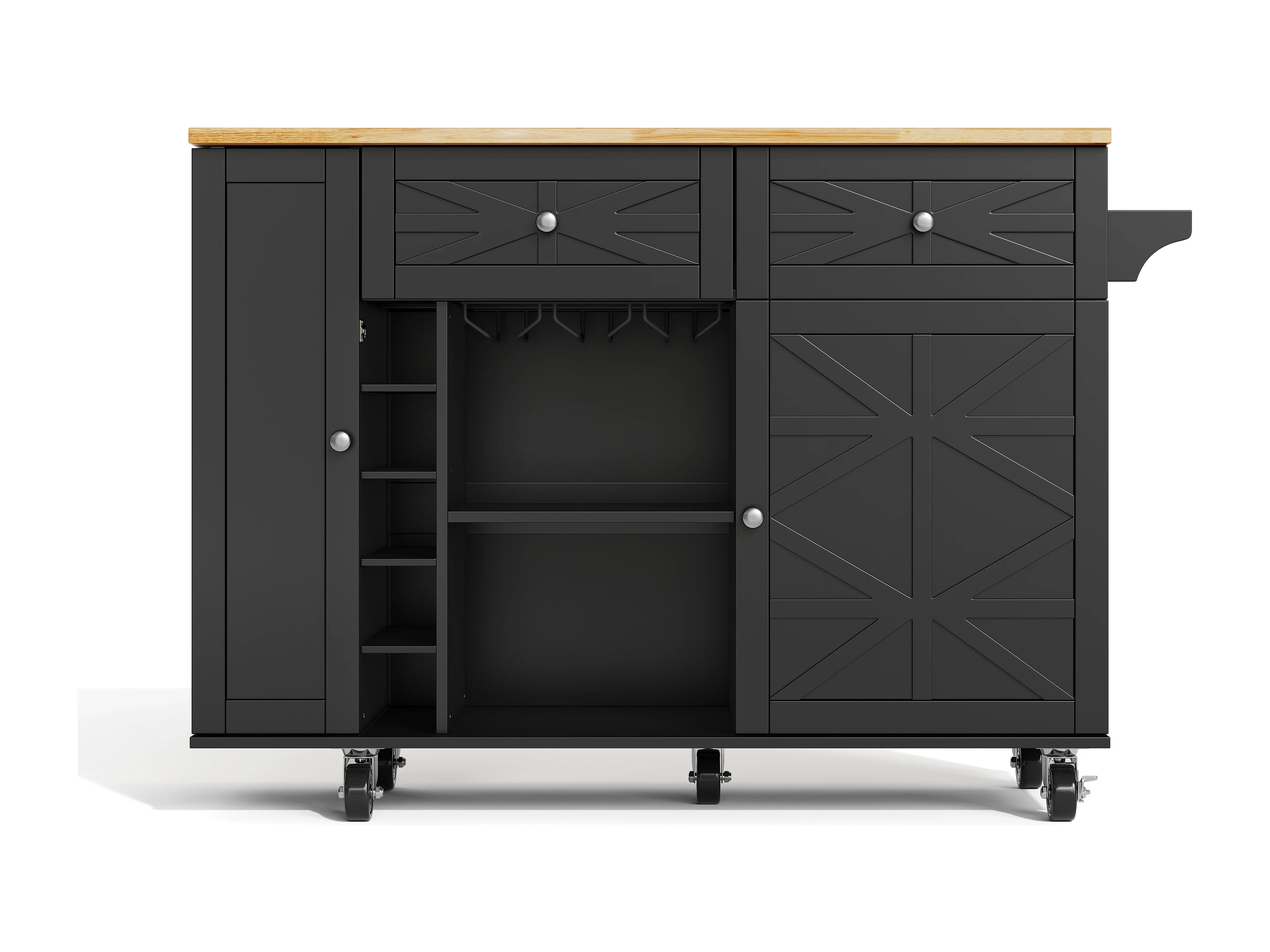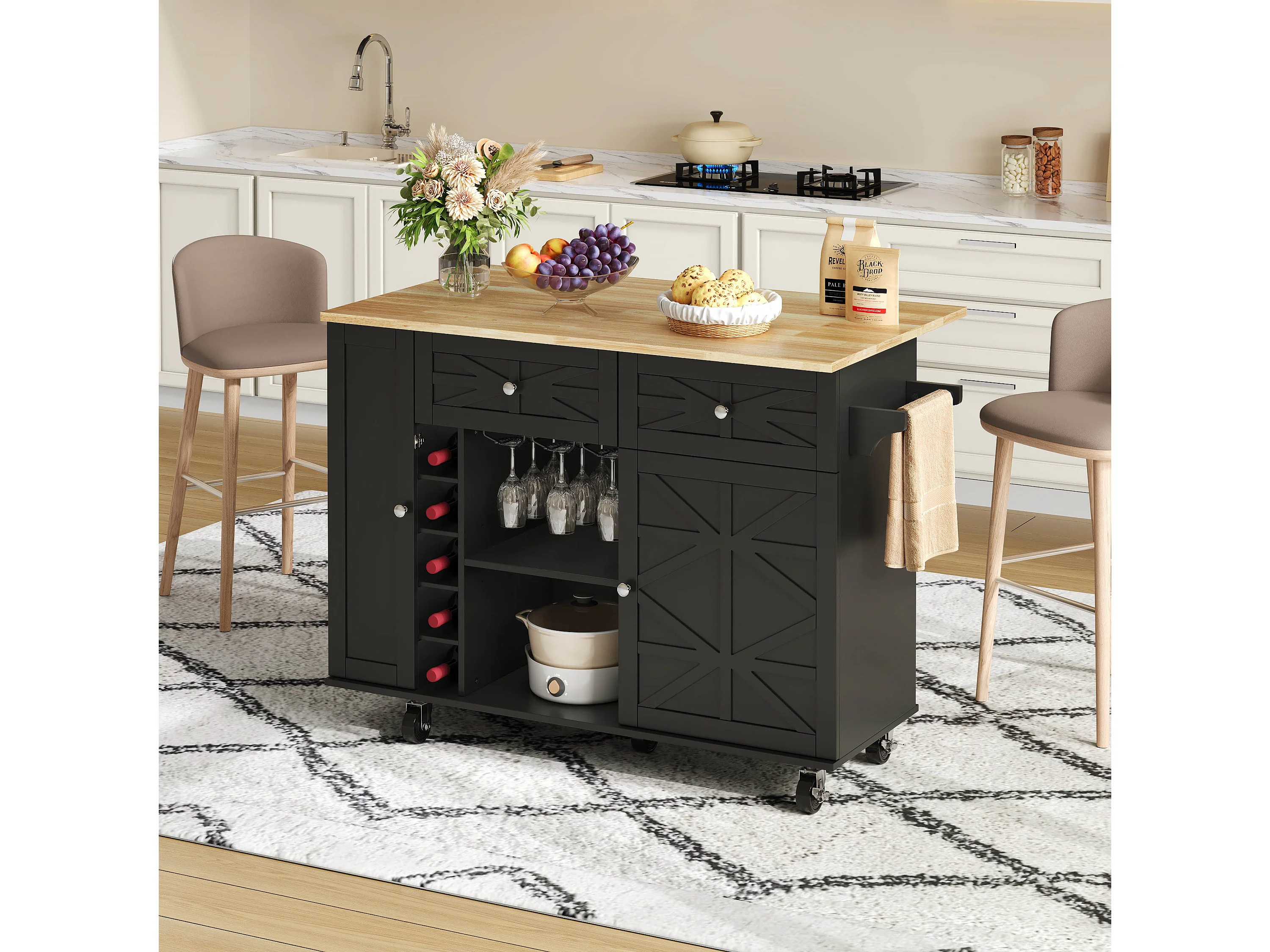 Keukeneiland op wielen - Met 2 lades, deur en wijnrek - Zwart 120 x 45(70) x 89 cm