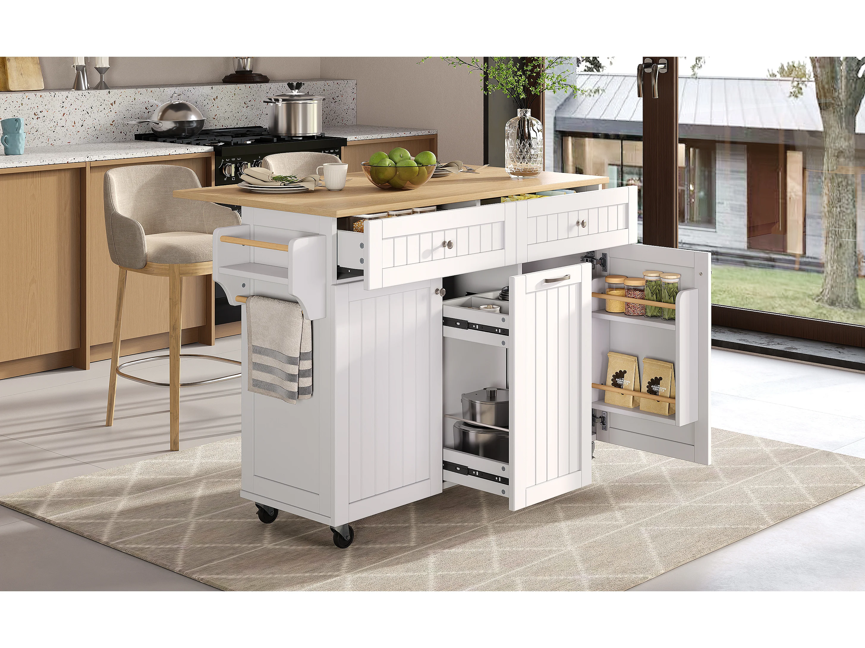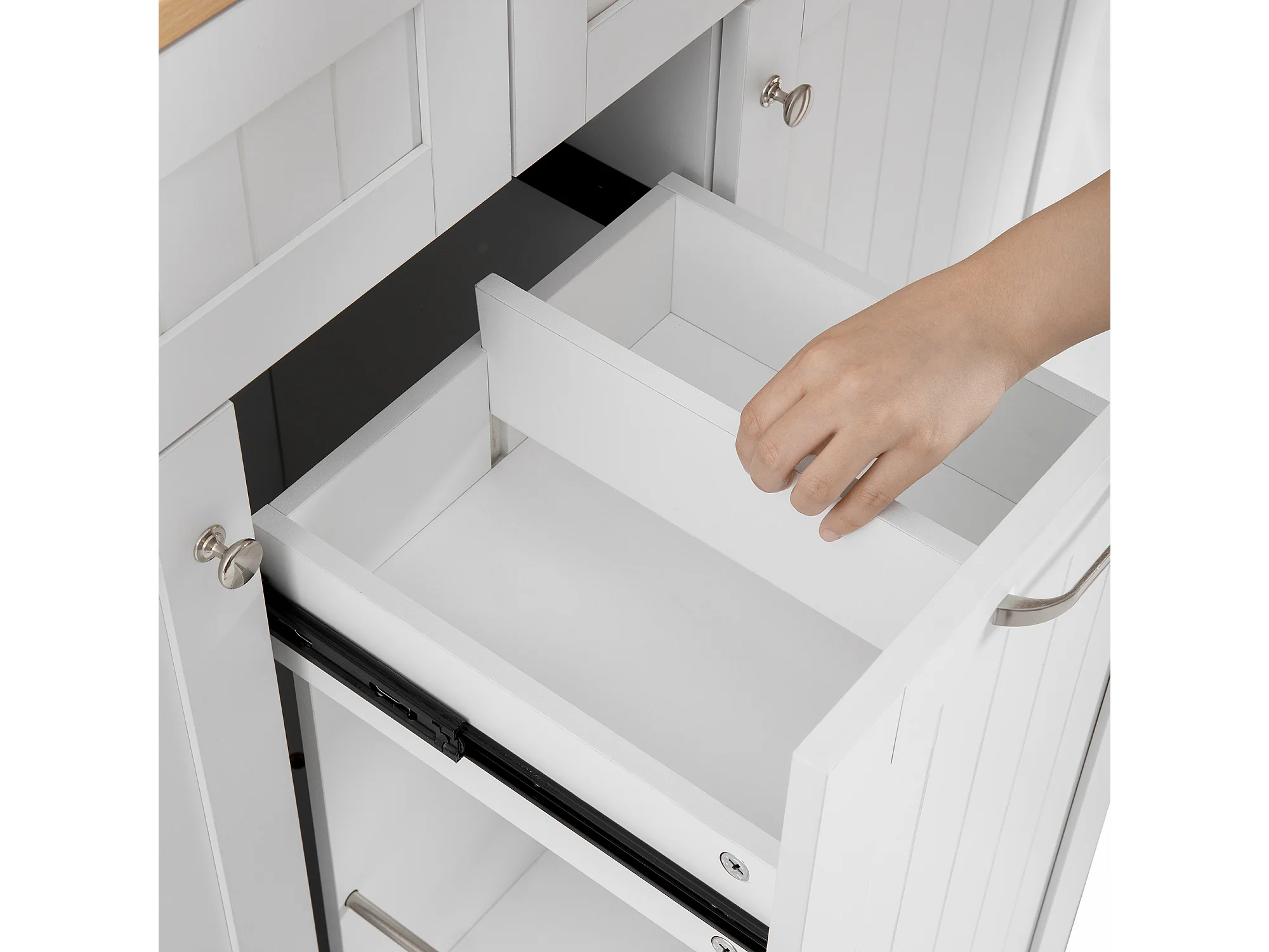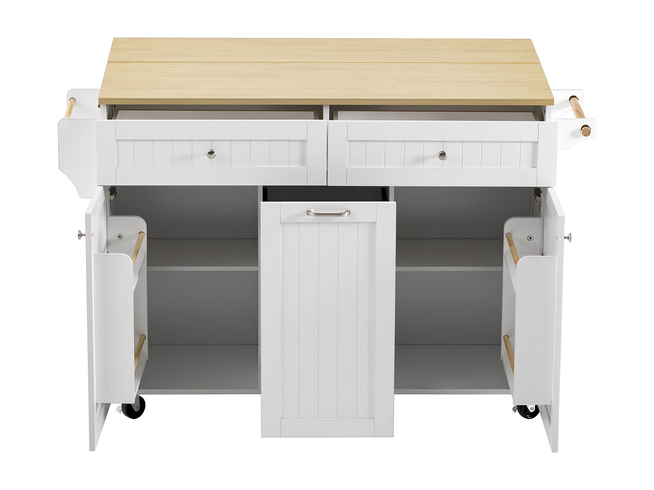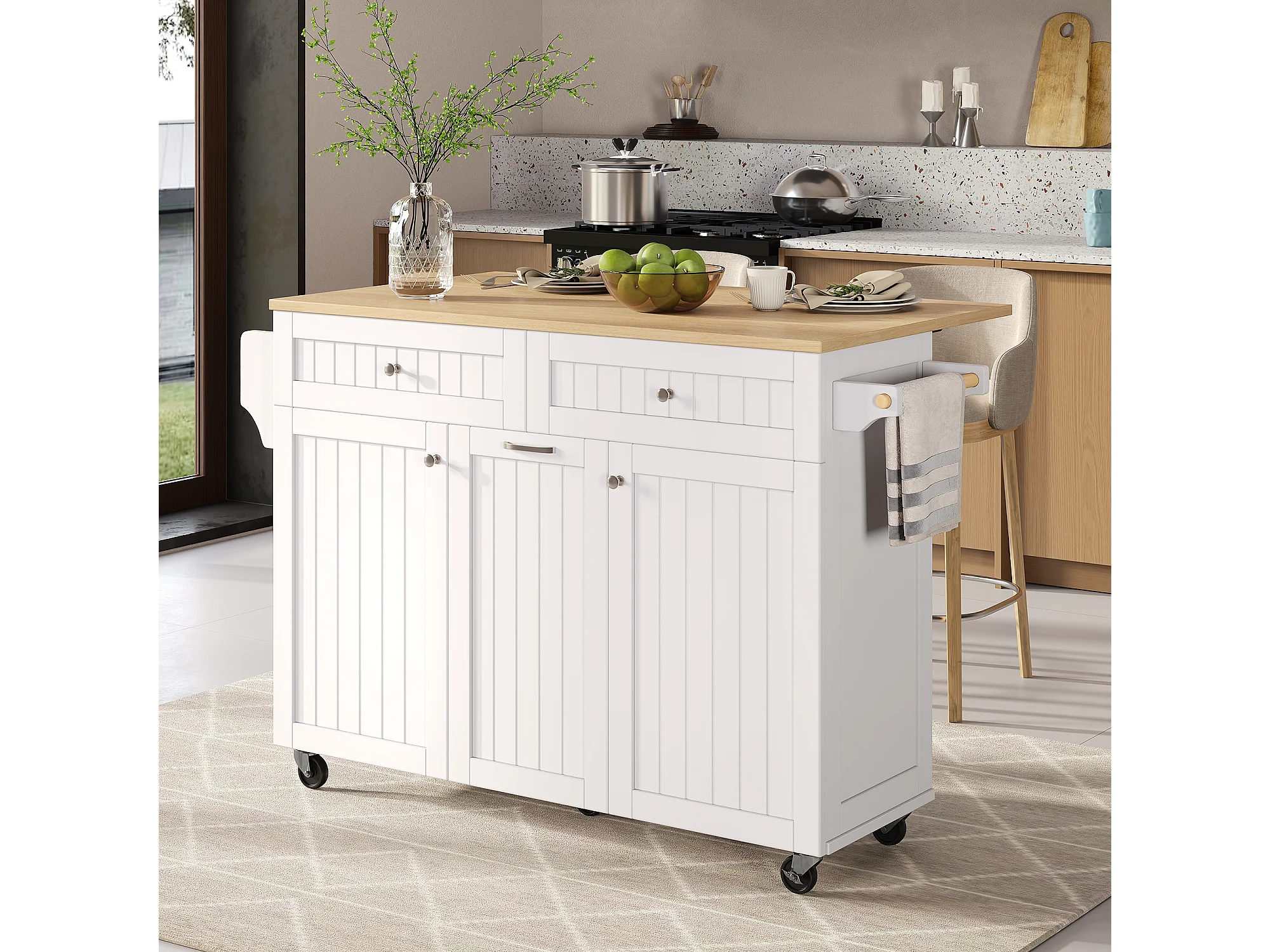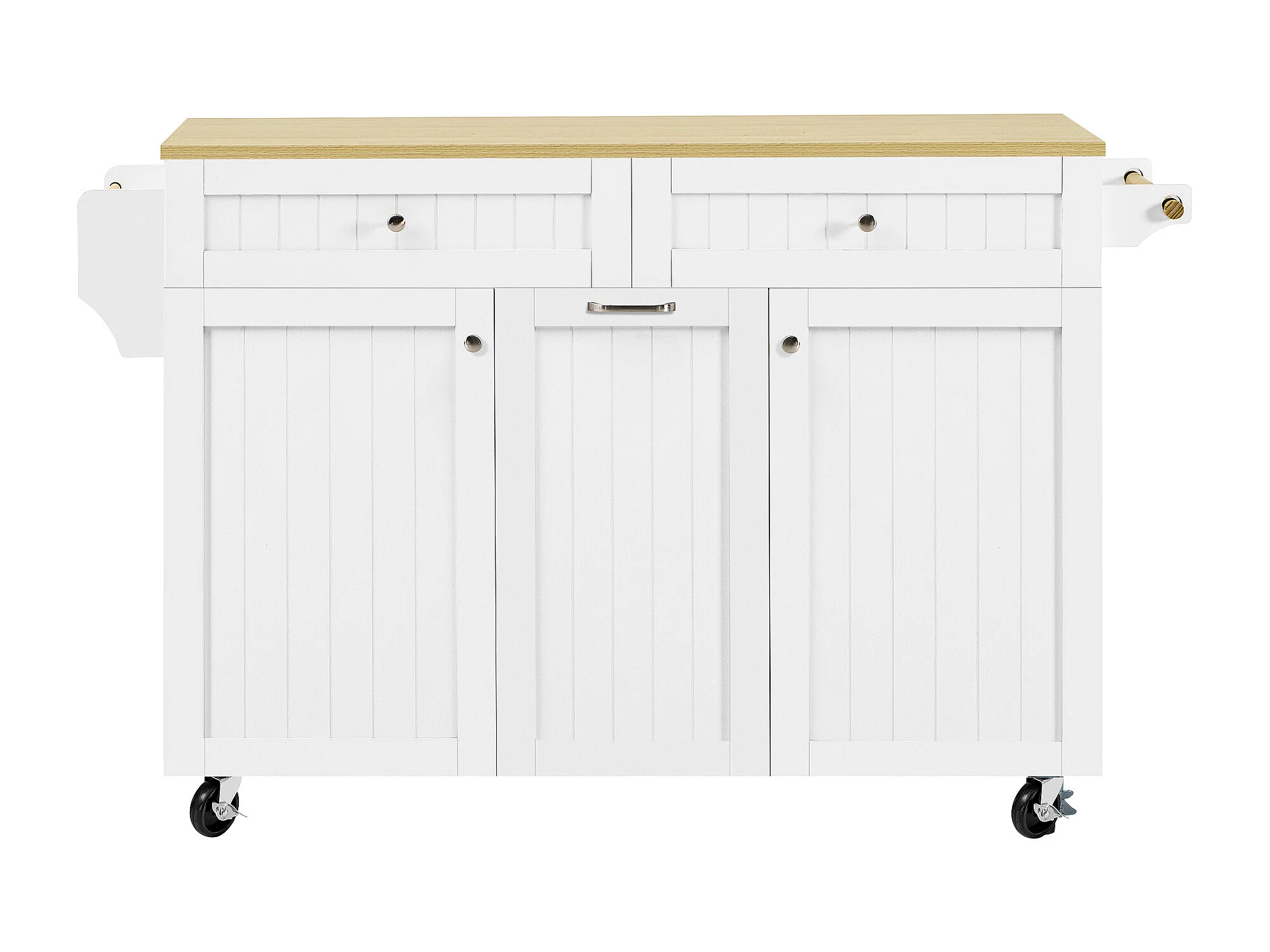 Keukeneiland op wielen met 2 lades en 2 deuren - Houtnerf bovenblad - Wit