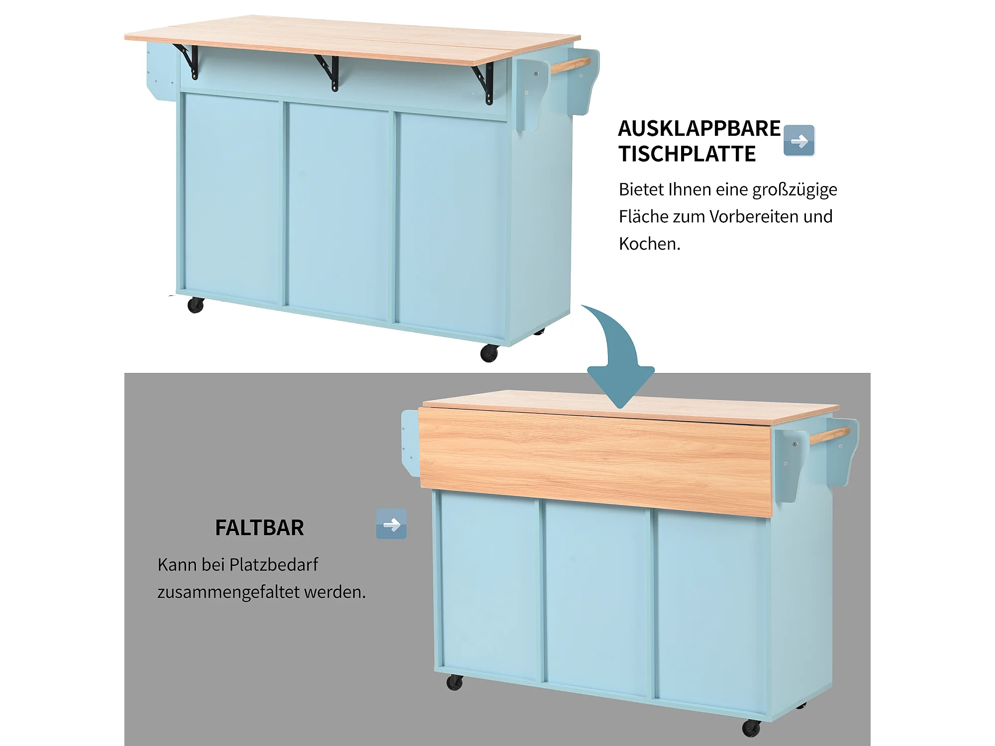 Keukeneiland op wielen met een inklapbaar blad - 139 x 46 (71) x 91,5 cm - met 2 deuren + 3 lades + planken - MDF - blauw