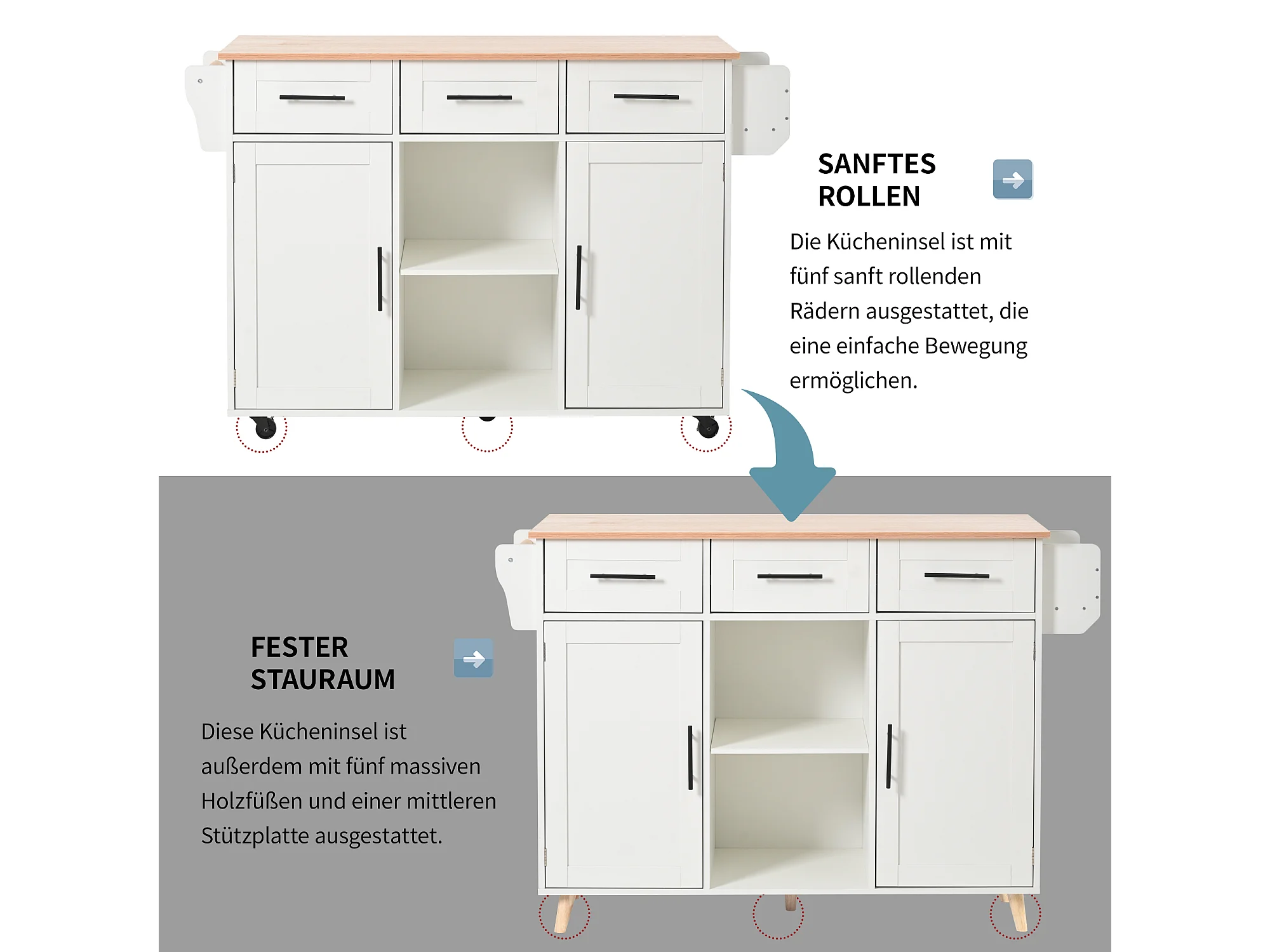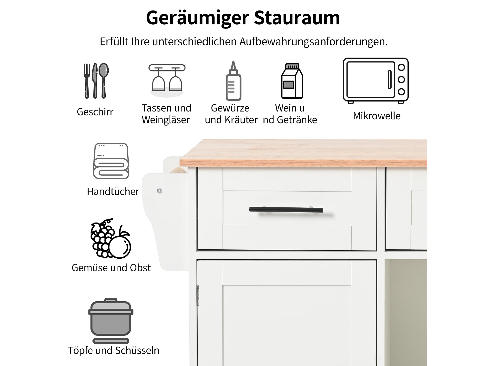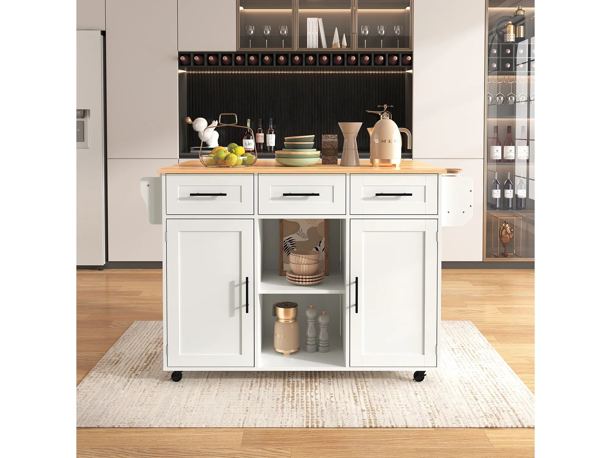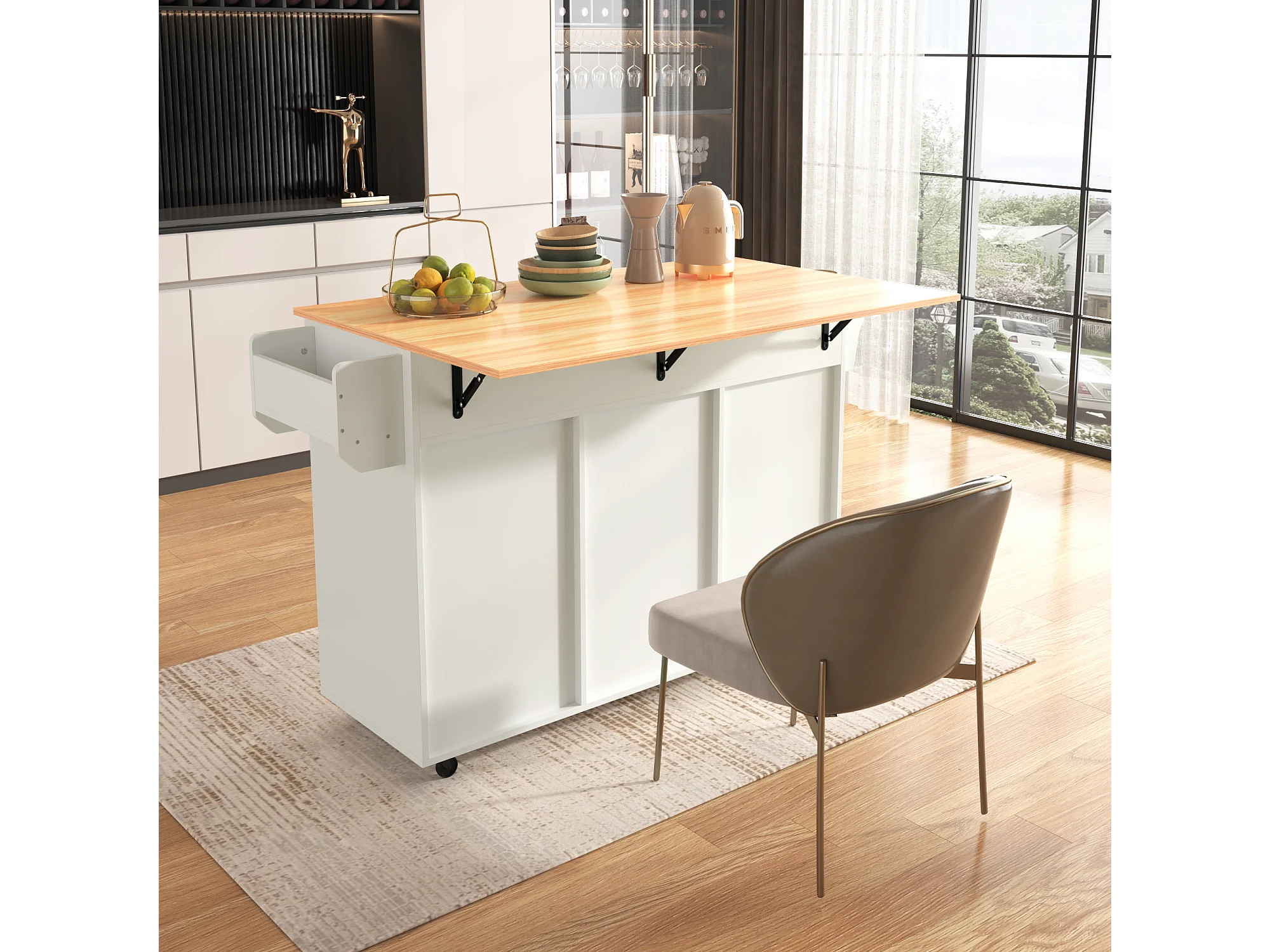 Keukeneiland op wielen met een inklapbaar blad - 139 x 46 (71) x 91,5 cm - met 2 deuren + 3 lades + planken - MDF - wit