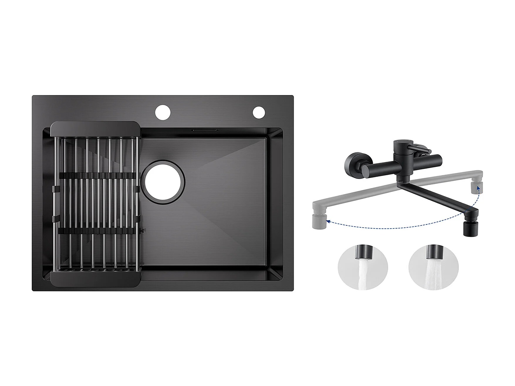 kom keukenspoelbak 60×45×18CM zwarte roestvrijstalen spoelbak met afvoermand + geborsteld opvouwbare keukenmengkraan