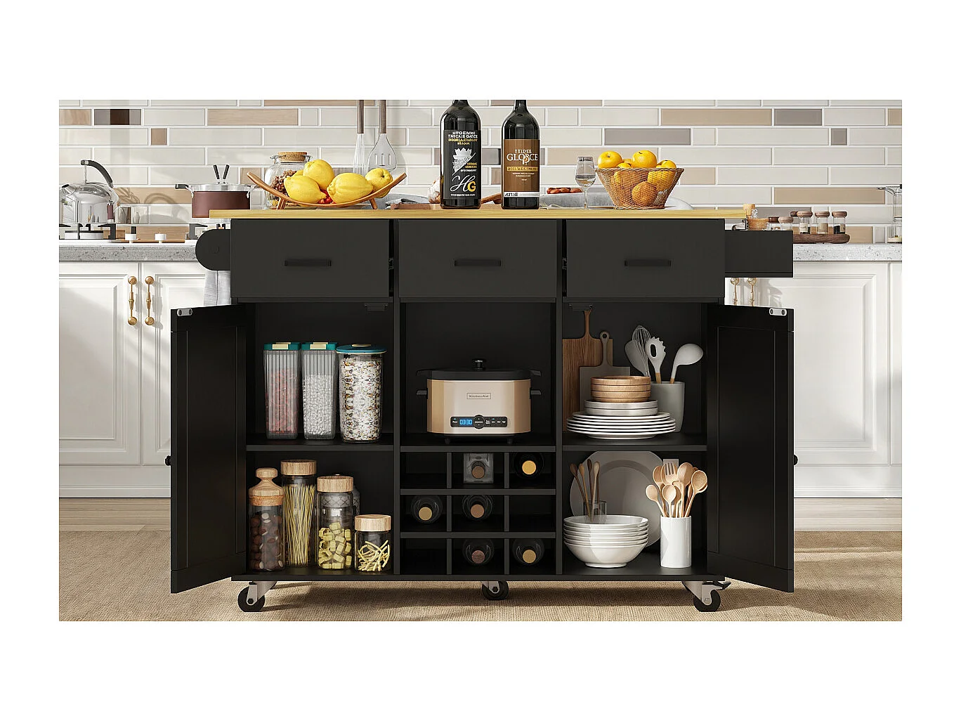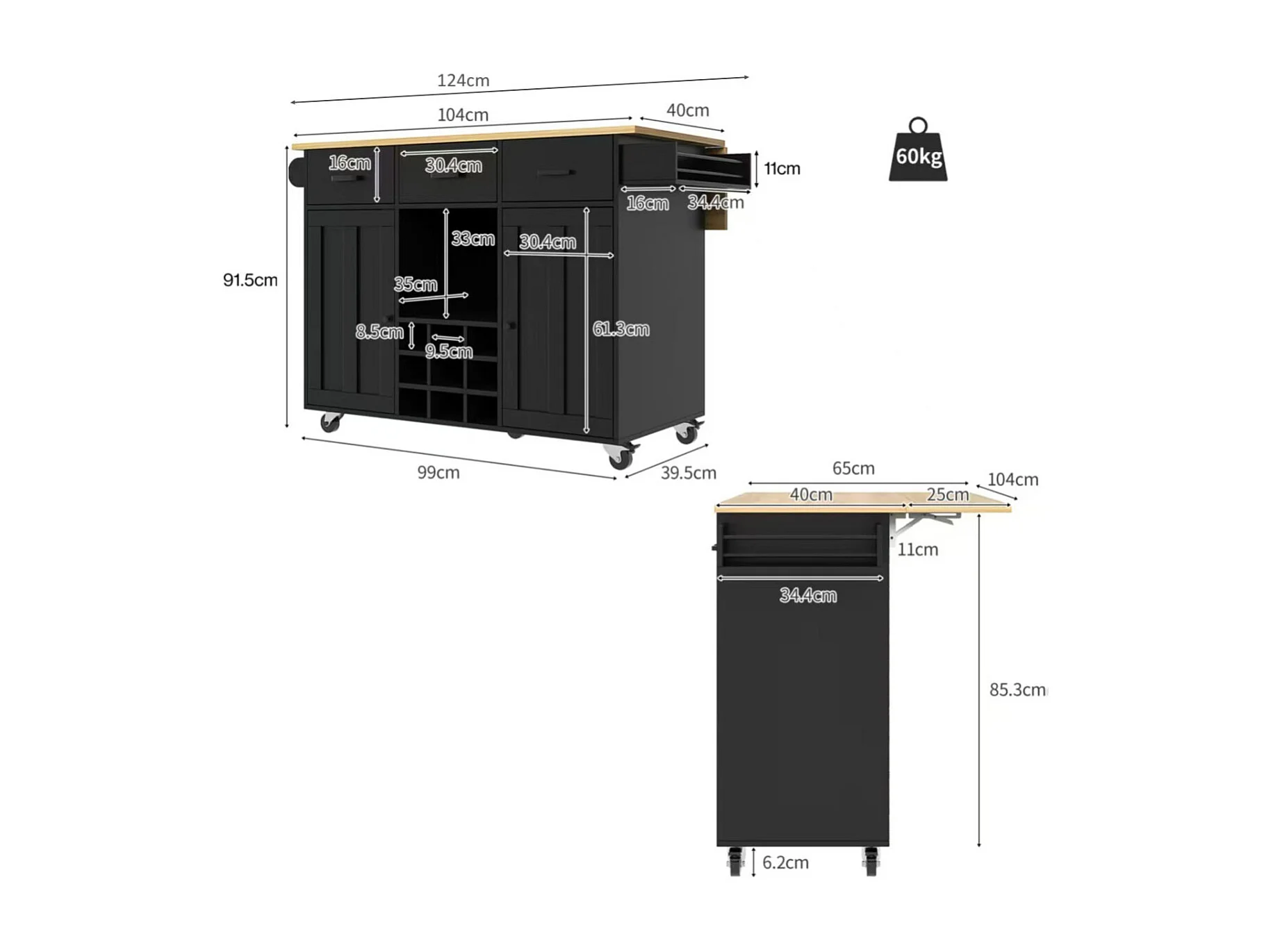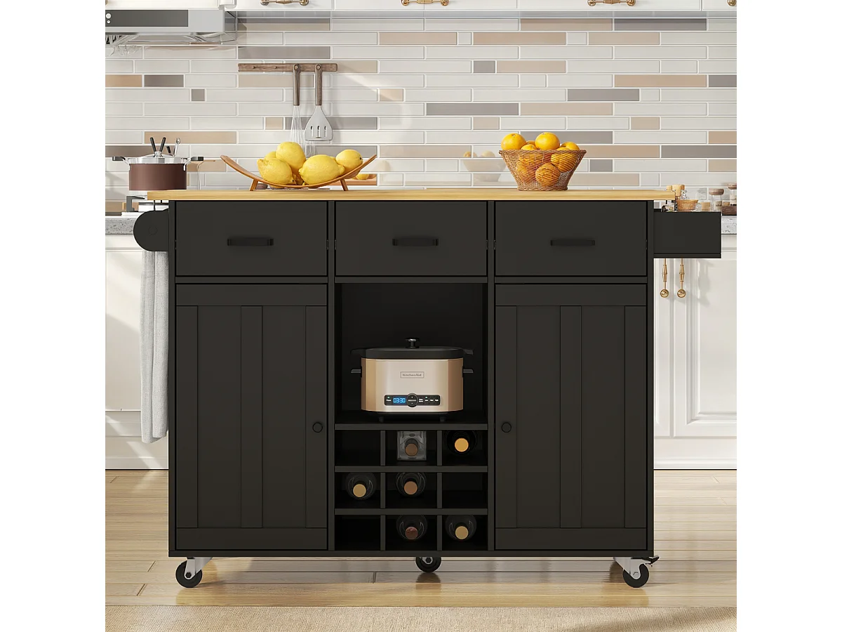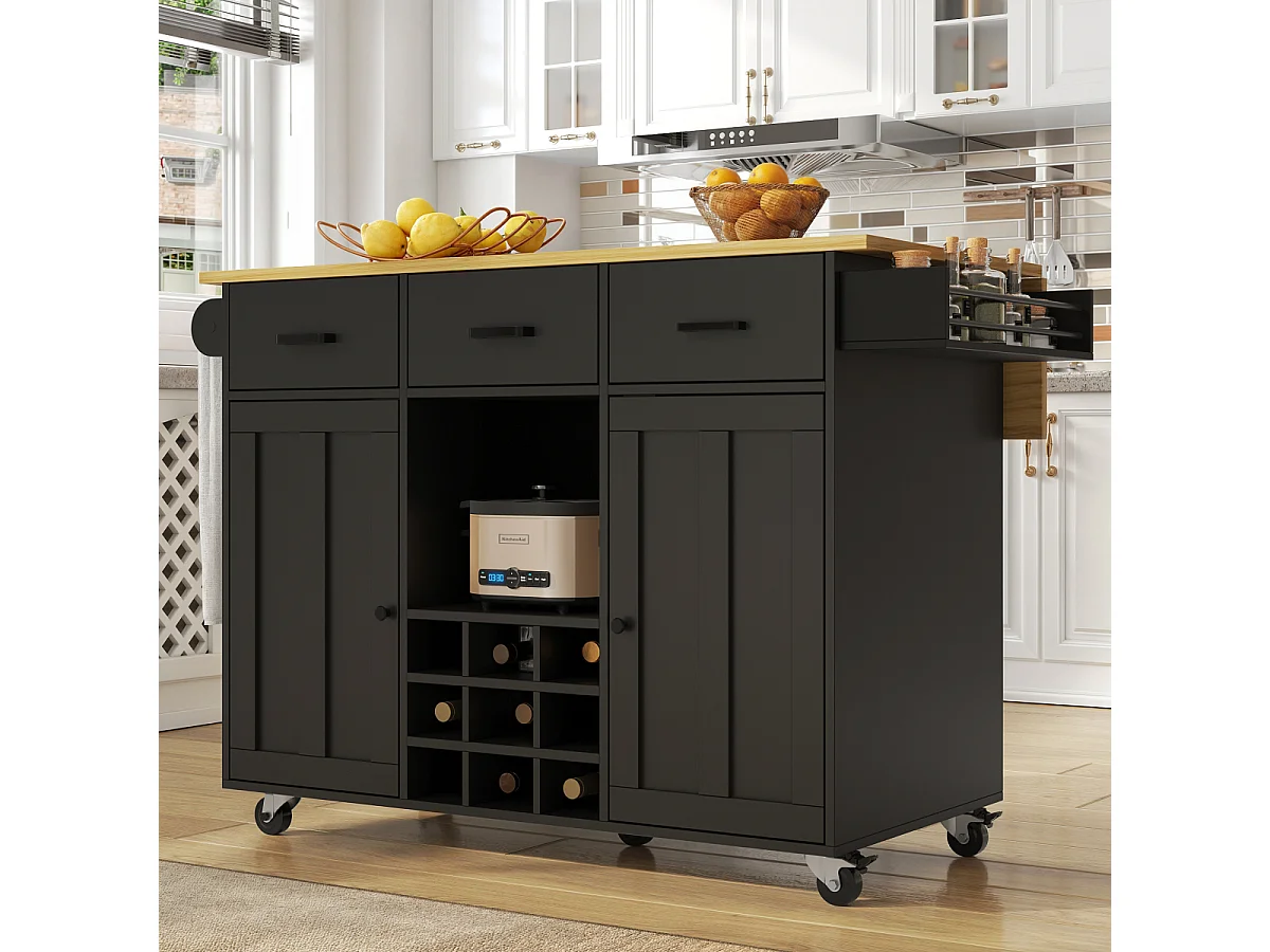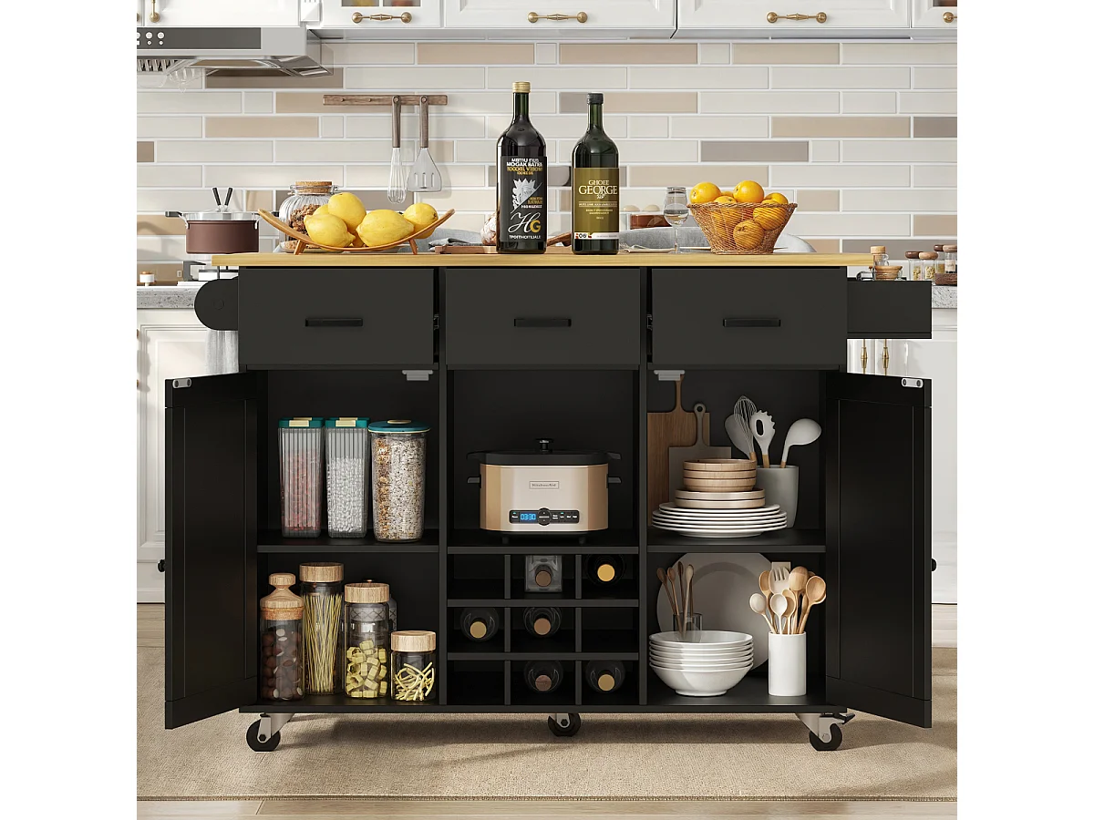 Keukentrolley met werkblad, handdoekrek, kruidenrek, zwart