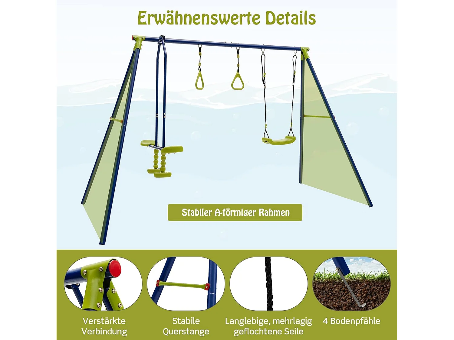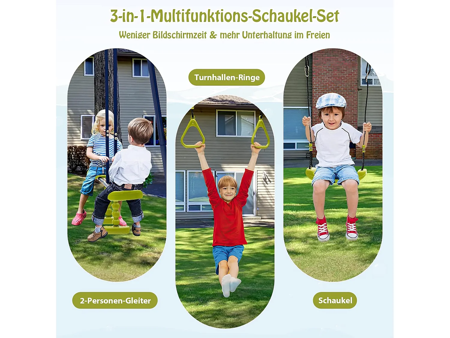 Kinder Schommel voor in de Tuin tot 200 kg, 3-in-1 Schommelstandaard, Schommel, Turnringen, Buiten Speeltoestel voor Achtertuin, Tuin, Park, 3+ Jaar Oud ZB32988