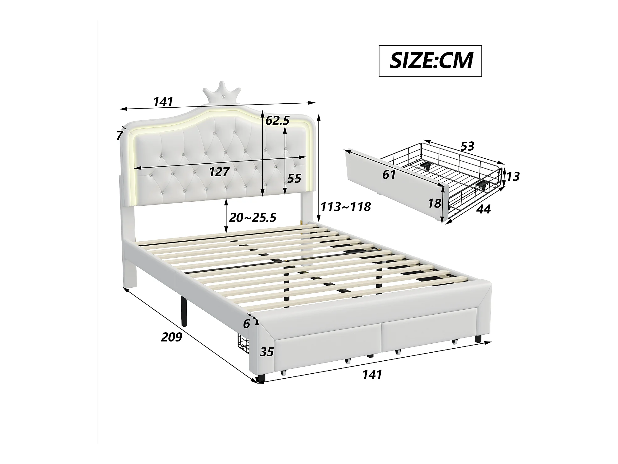 Kinderbed 140x200 cm gewatteerd, verstelbaar hoofdeinde, 2 laden, kroonvorm met LED, prinsessenstijl, wit (zonder matras)