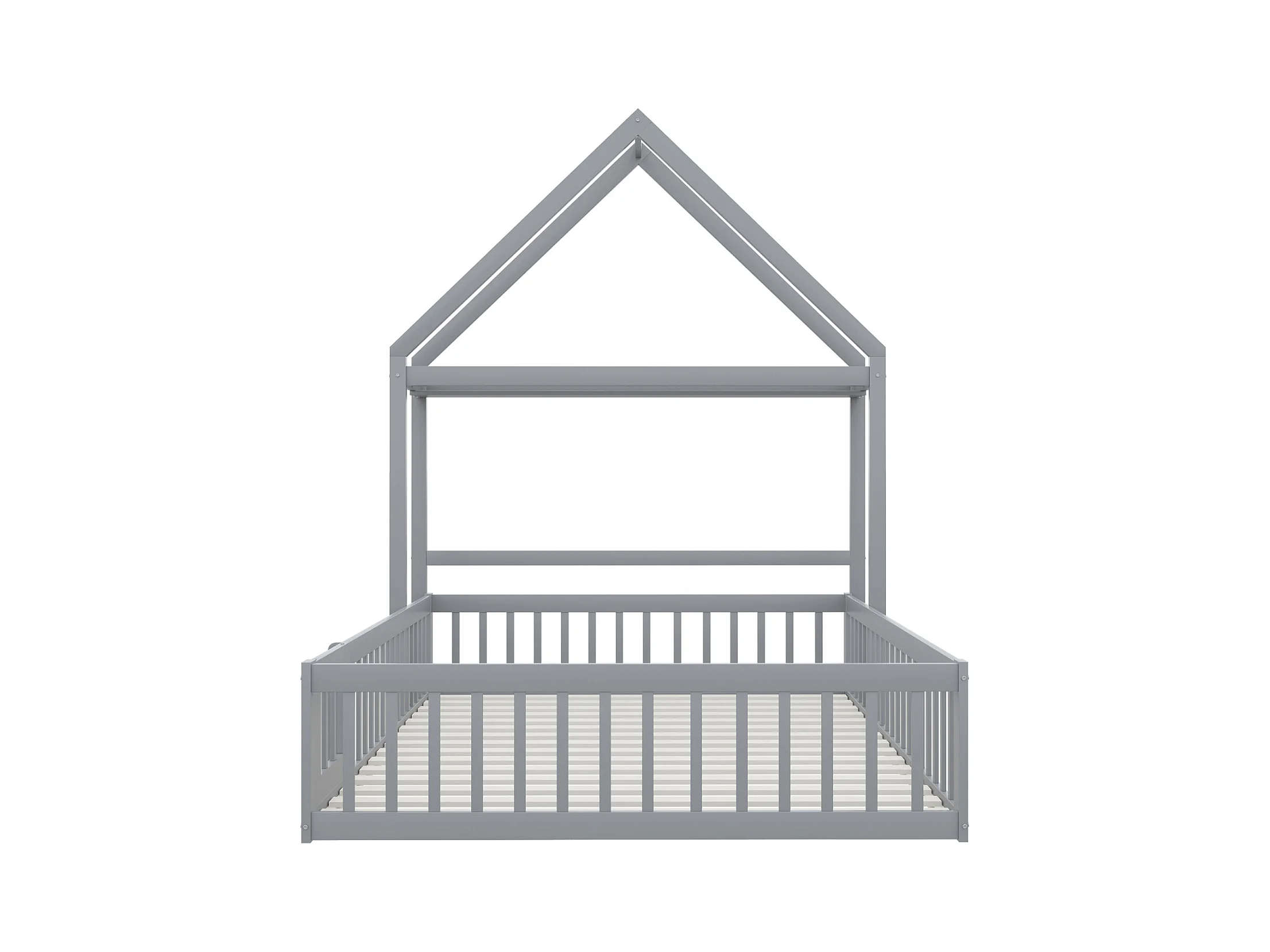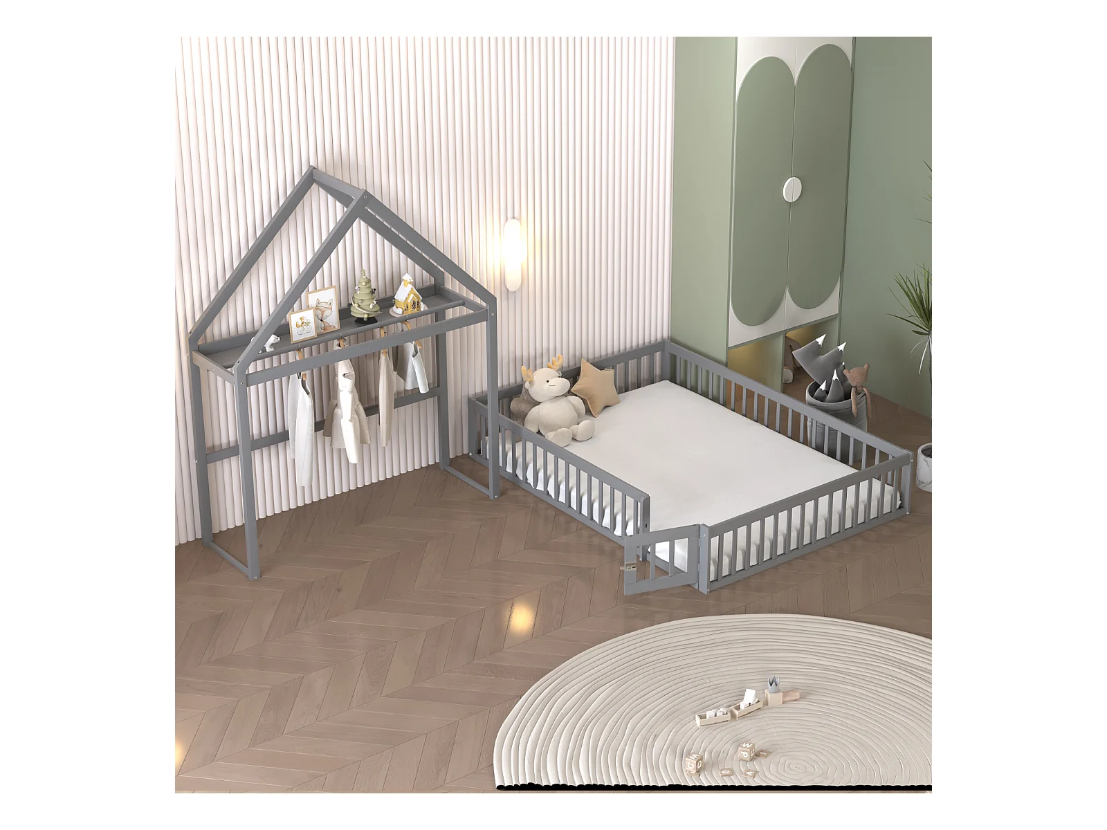 Kinderbed 140x200 cm grijs – Houten frame met lattenbodem, spijlen en deur