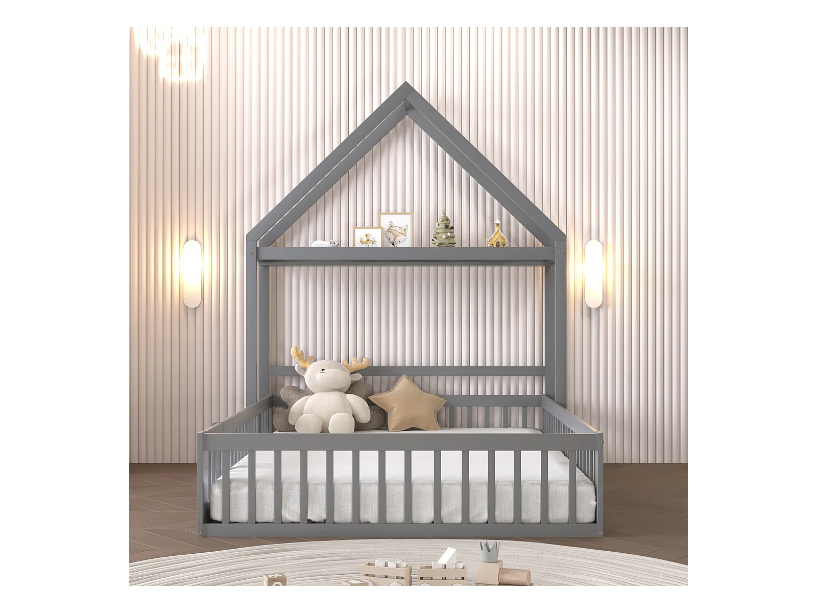 Kinderbed 140x200 cm, massief houten frame, huisbed met planken, opbergruimte, uitvalbeveiliging, deur, boekenplank, lattenbodem, grijs