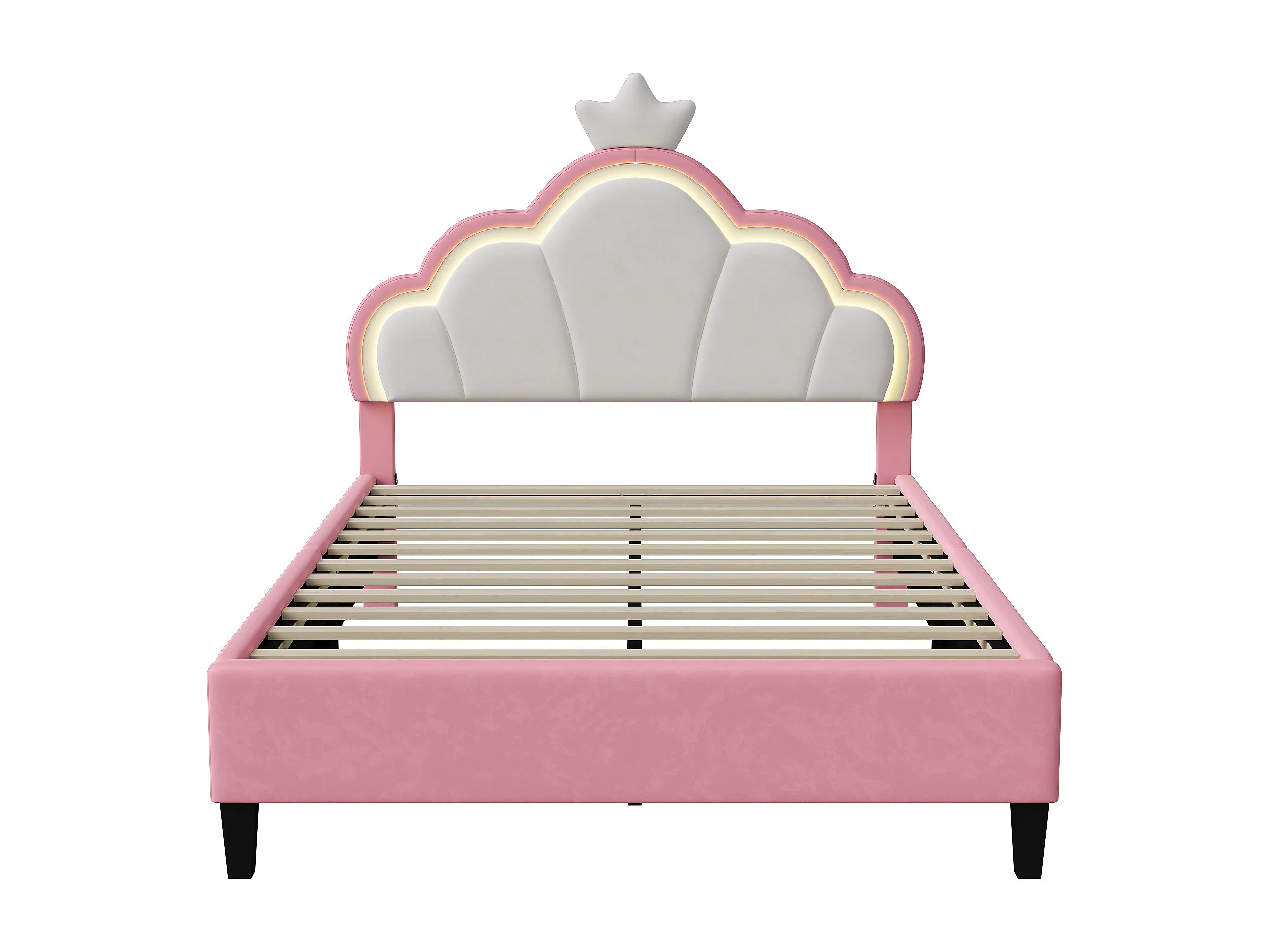Kinderbed 140x200cm - prinsessenbed met lattenbodem, kroonvormig hoofdeinde - in roze flanel