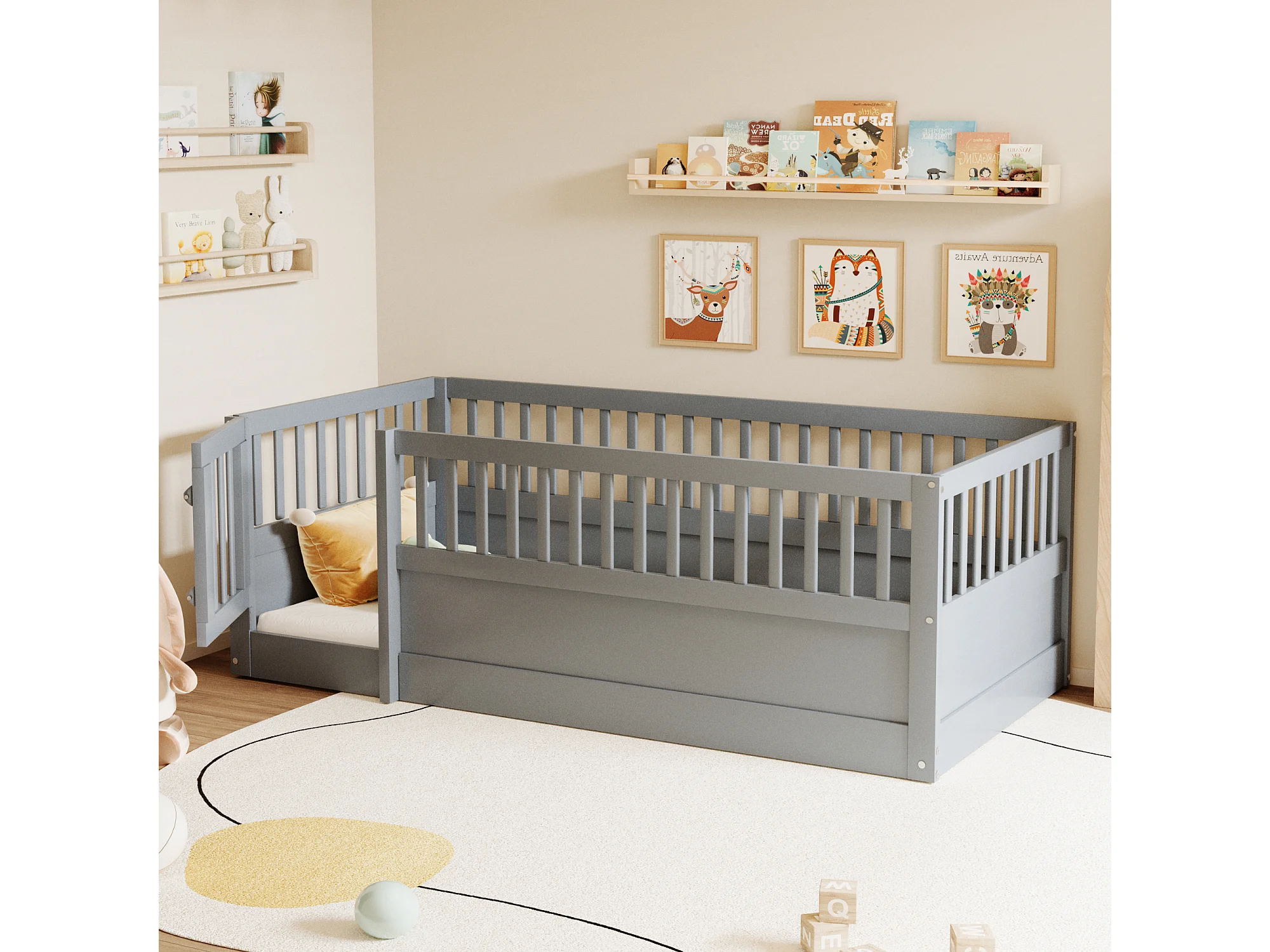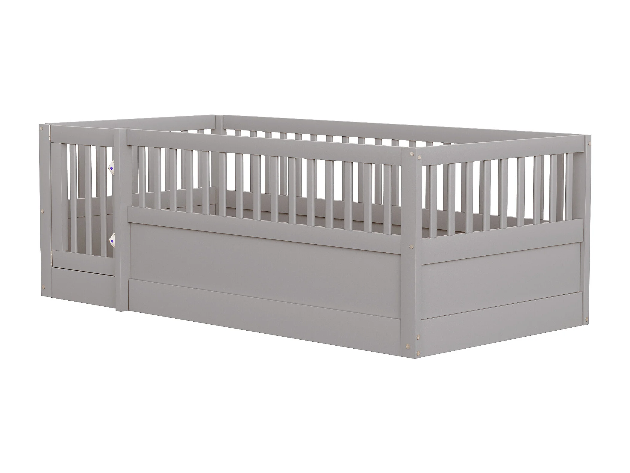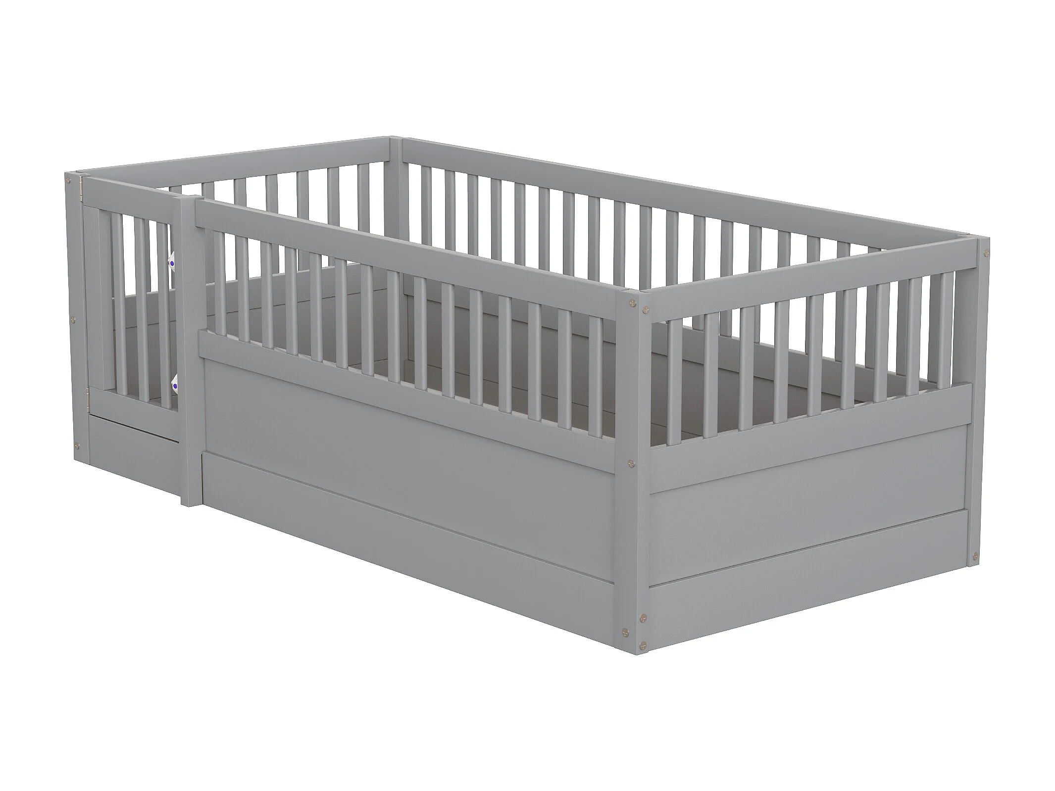 Kinderbed 90 x 200 cm - houten bedframe - met veiligheidshekken - met deur - grijs (lattenbodem niet inbegrepen)