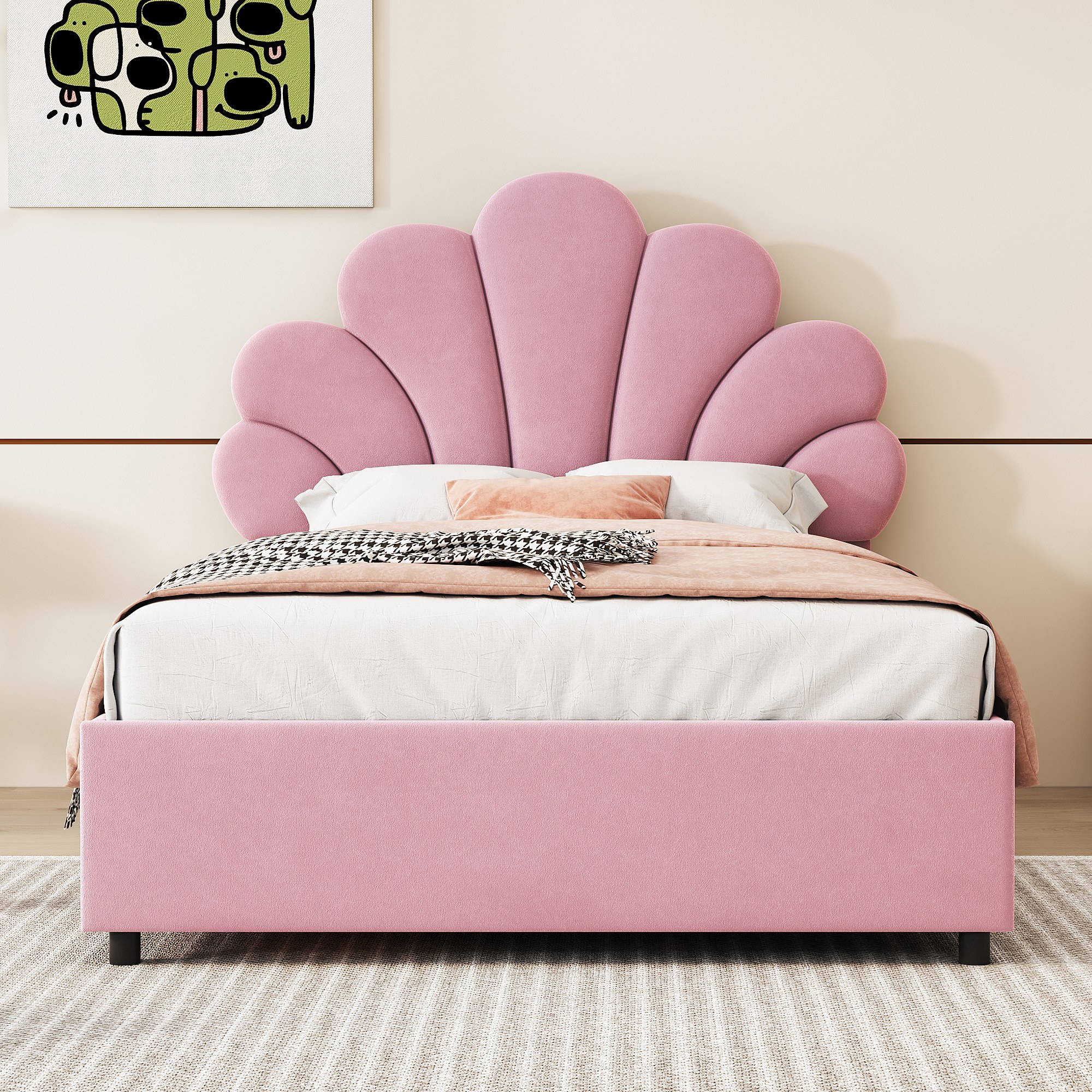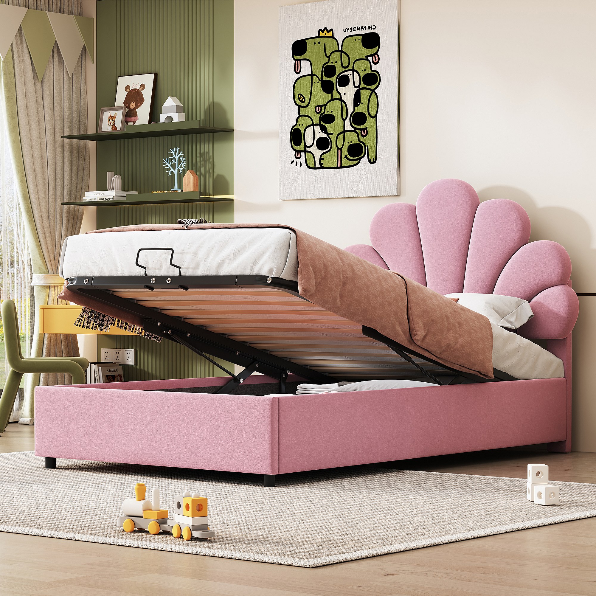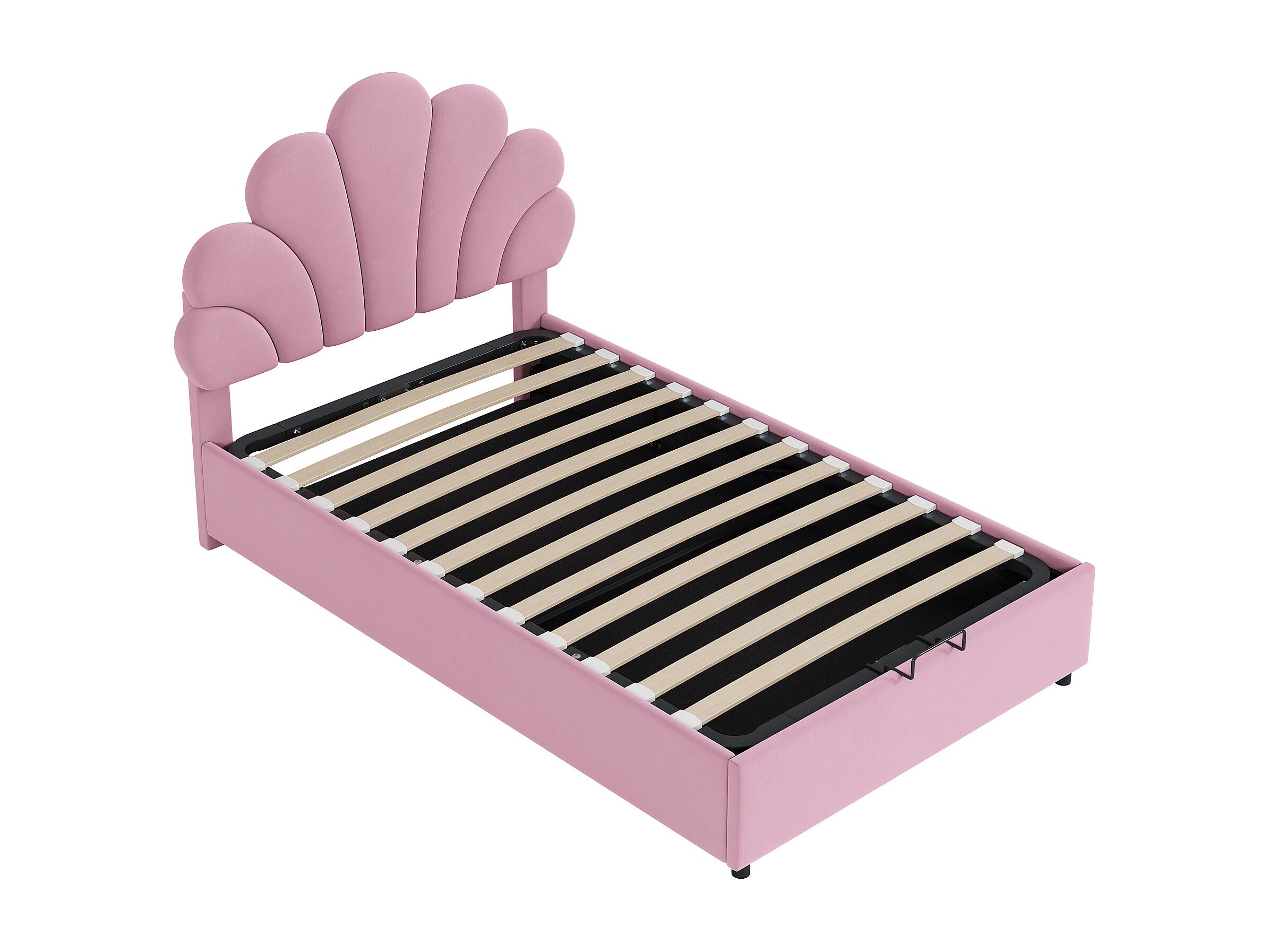 Kinderbed 90 x 200 cm, met bloemenhoofdbord, lattenbodem, verstelbaar en hydraulisch, roze fluwelen stof (203x94x115 cm)
