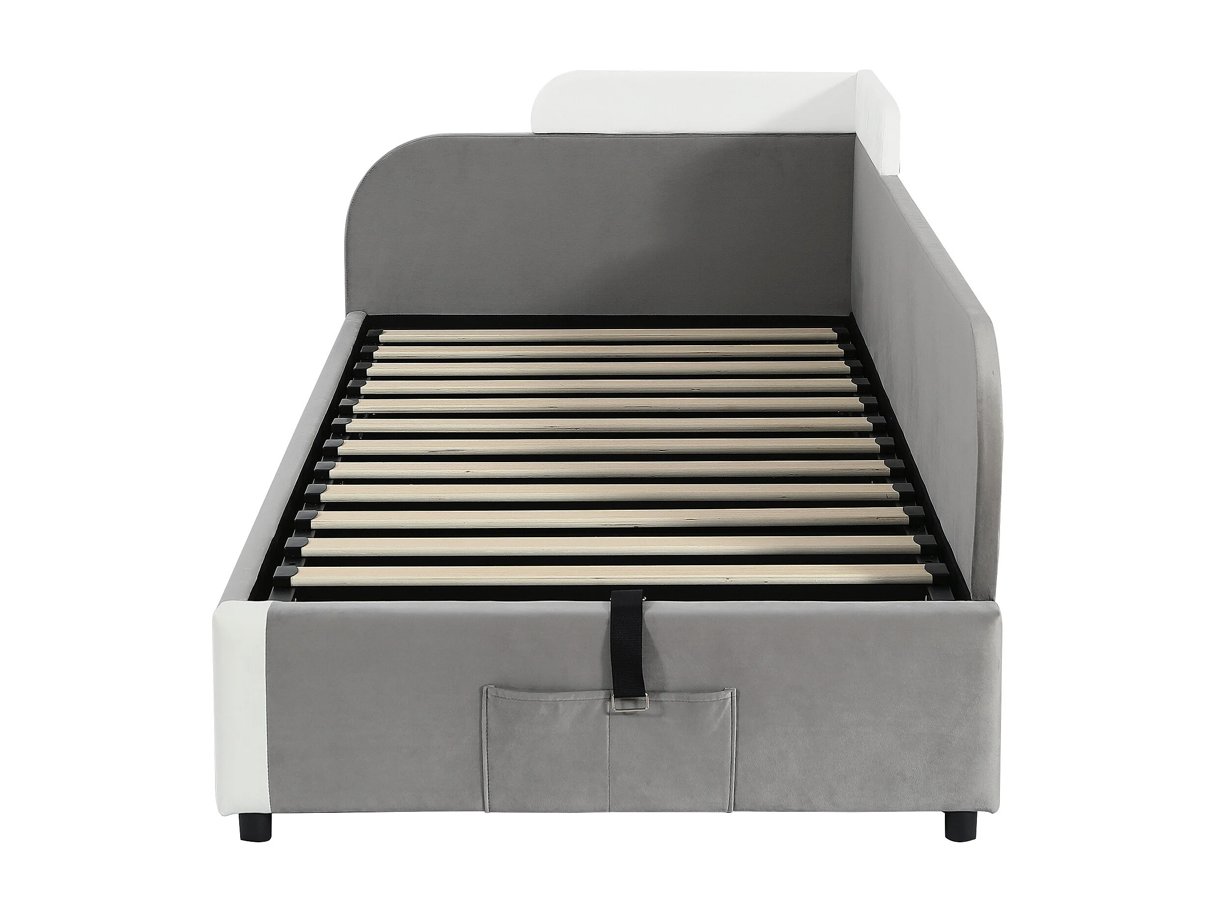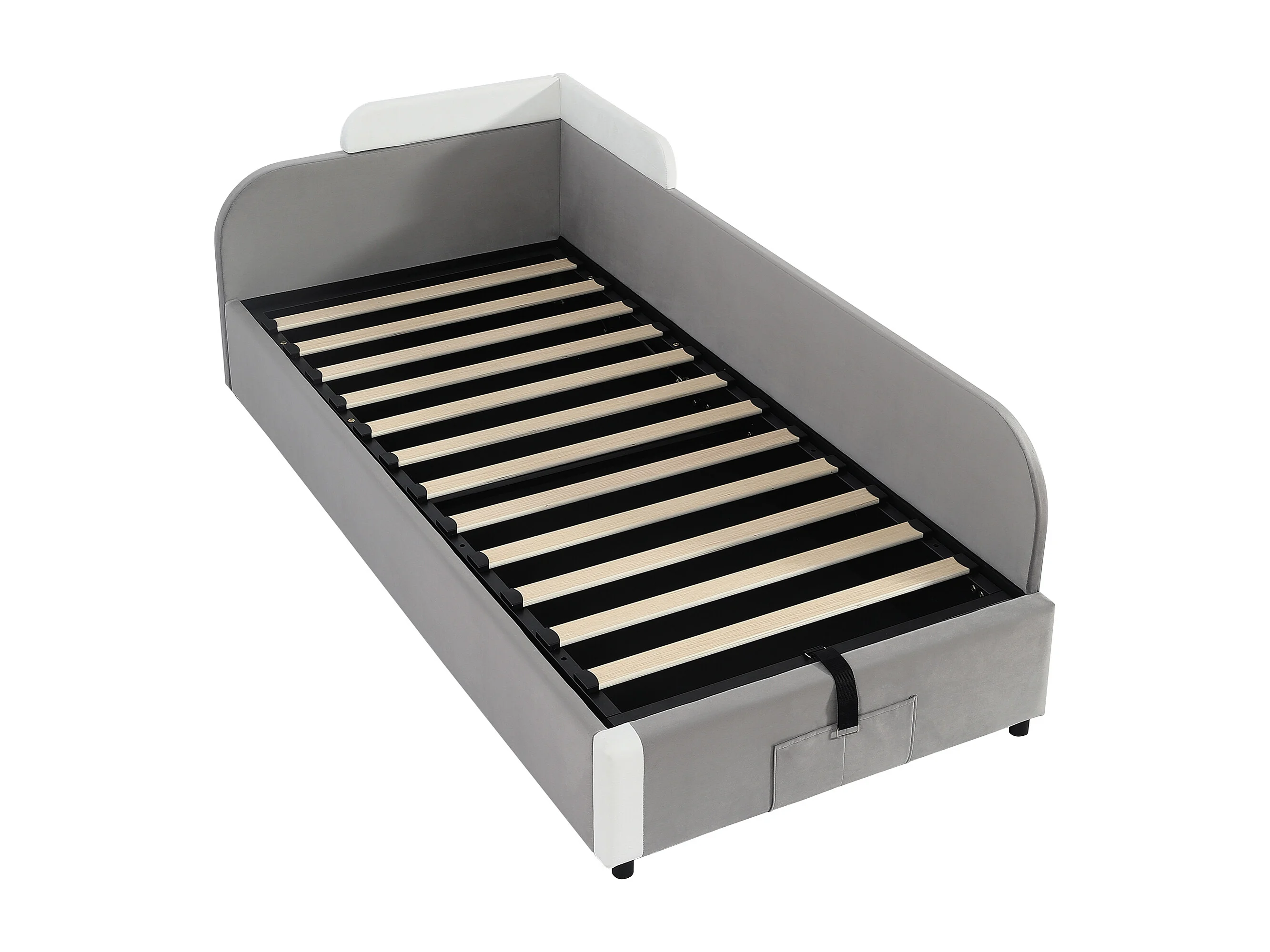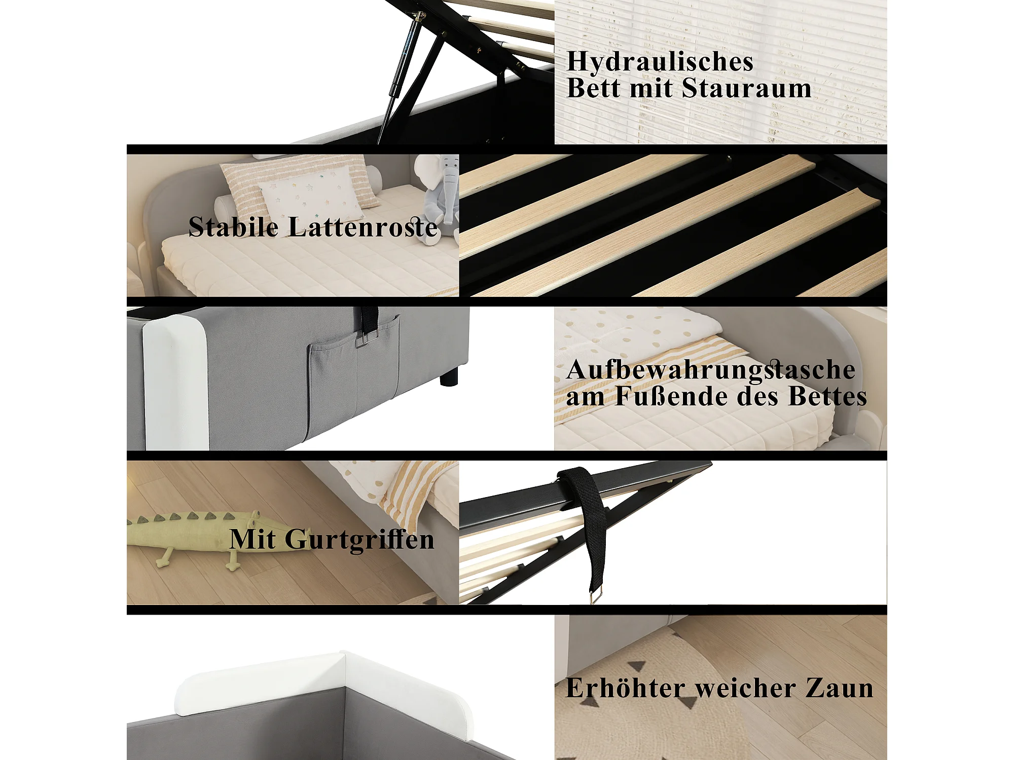 Kinderbed 90x200 cm met hydraulische opberging, uitvalbeveiliging, grijze fluwelen stof (205x93,5x71 cm)