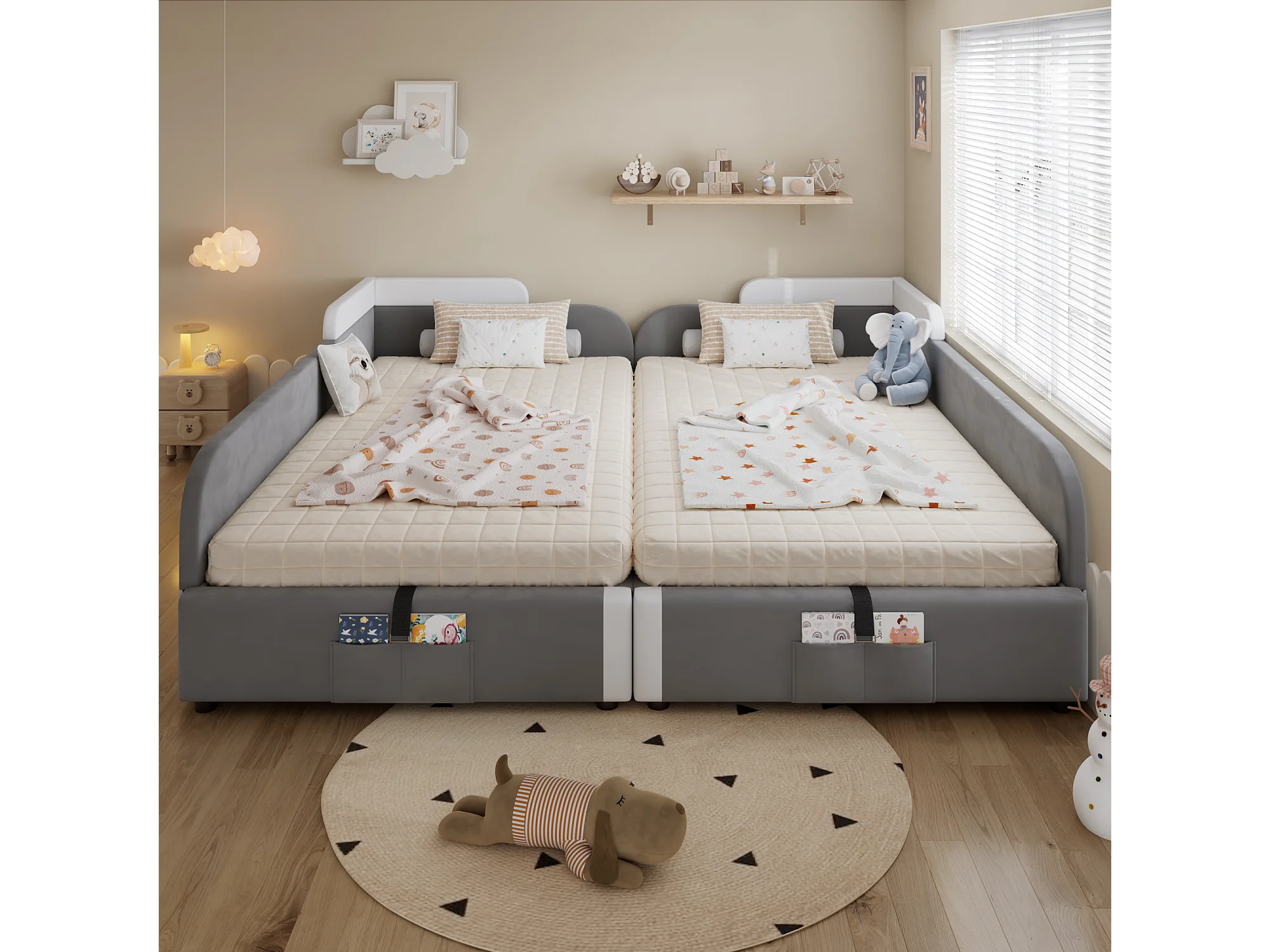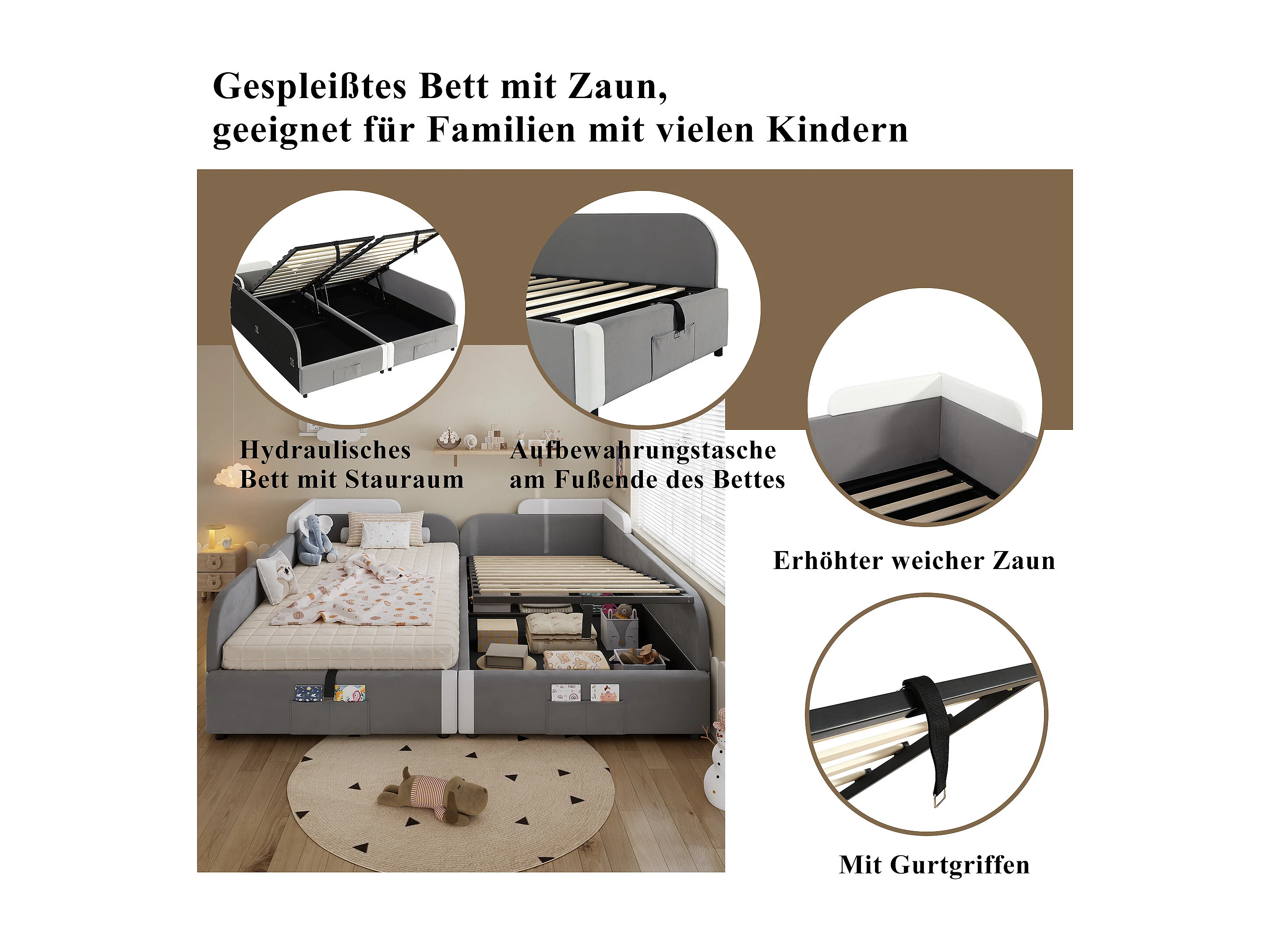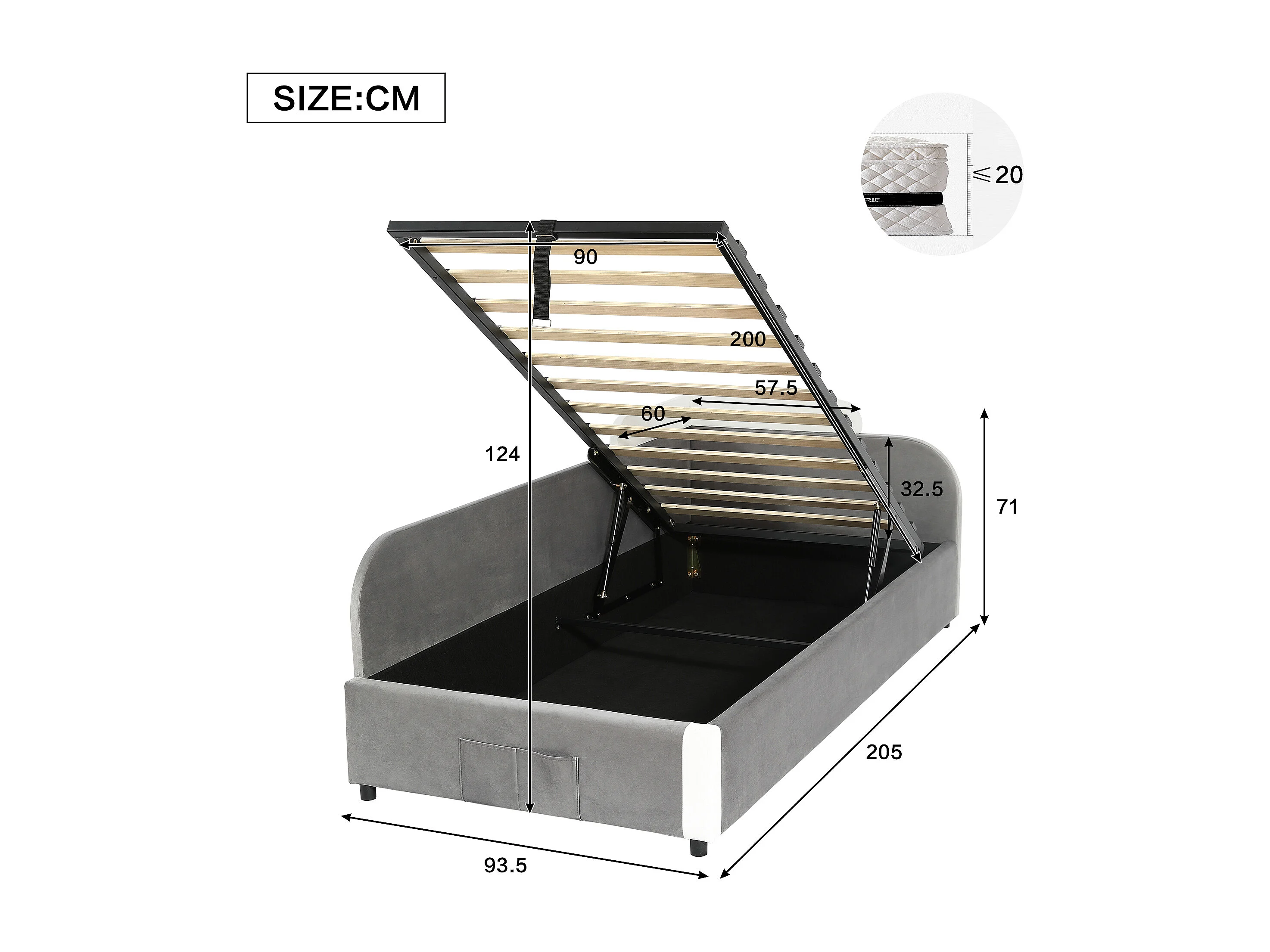 Kinderbed 90x200 cm met hydraulische opbergruimte, uitvalbeveiliging, grijze fluwelen stof, 205x187x71 cm