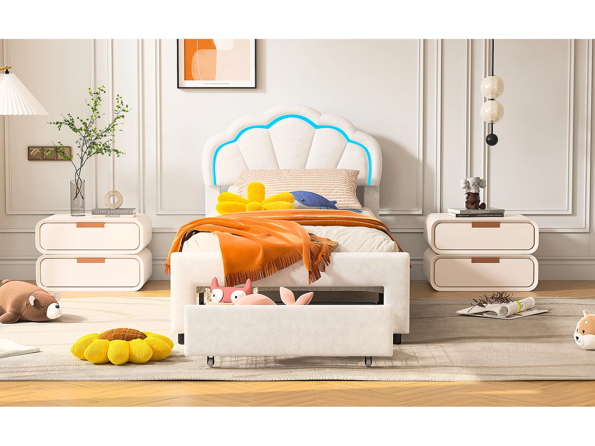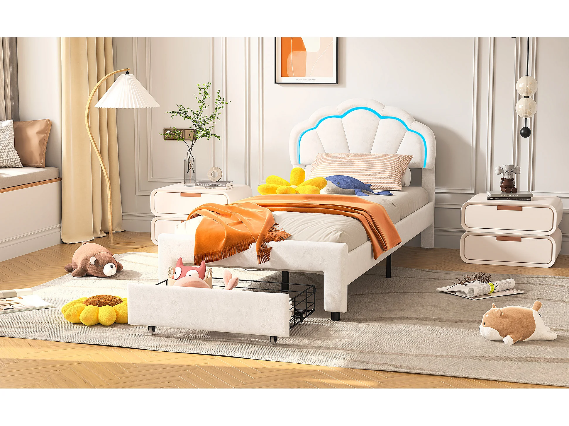 Kinderbed 90x200 cm met opberglade, gestoffeerd meisjesbed met ledverlichting, in hoogte verstelbaar bloemvormig hoofdeinde, fluweel