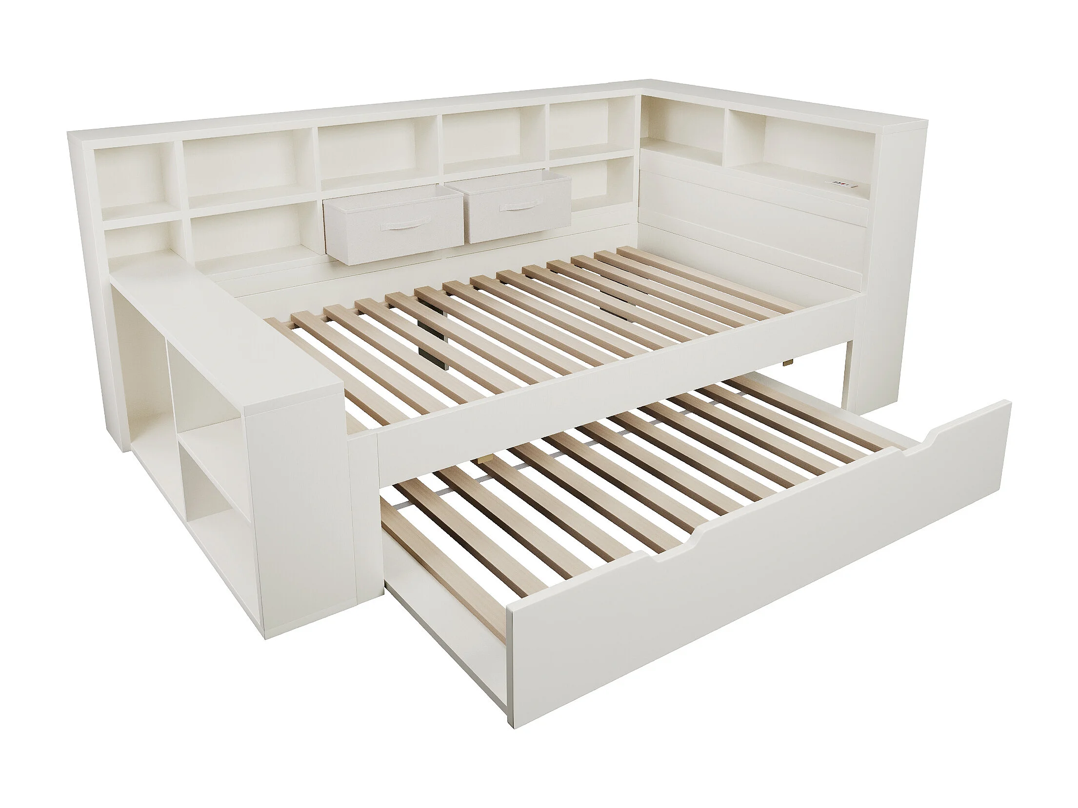 Kinderbed 90x200 cm met uitschuifbed 90x190 cm, wit hout - USB/Type-C-poorten en opbergruimte