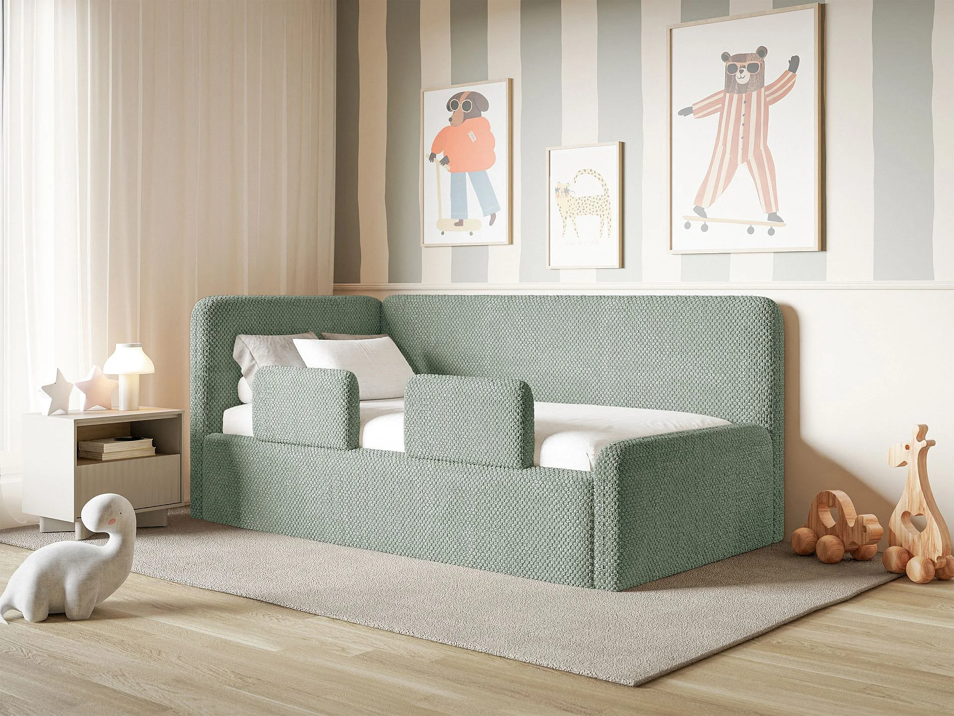Kinderbed 90x200 met uitvalbeveiliging en hoofdbord links – pluche – saliegroen – FANKO