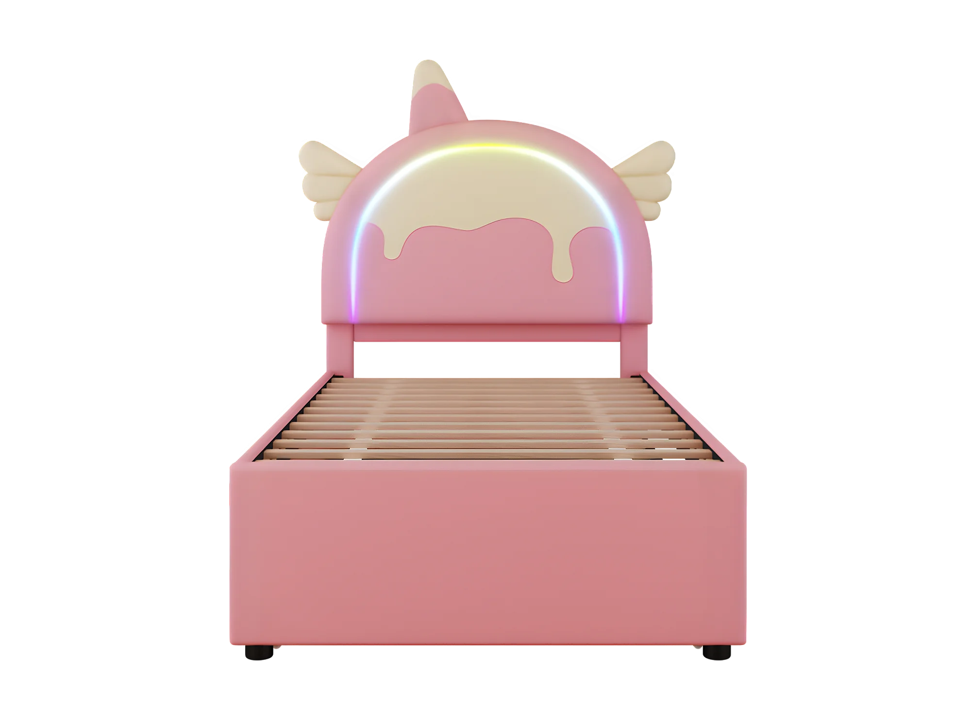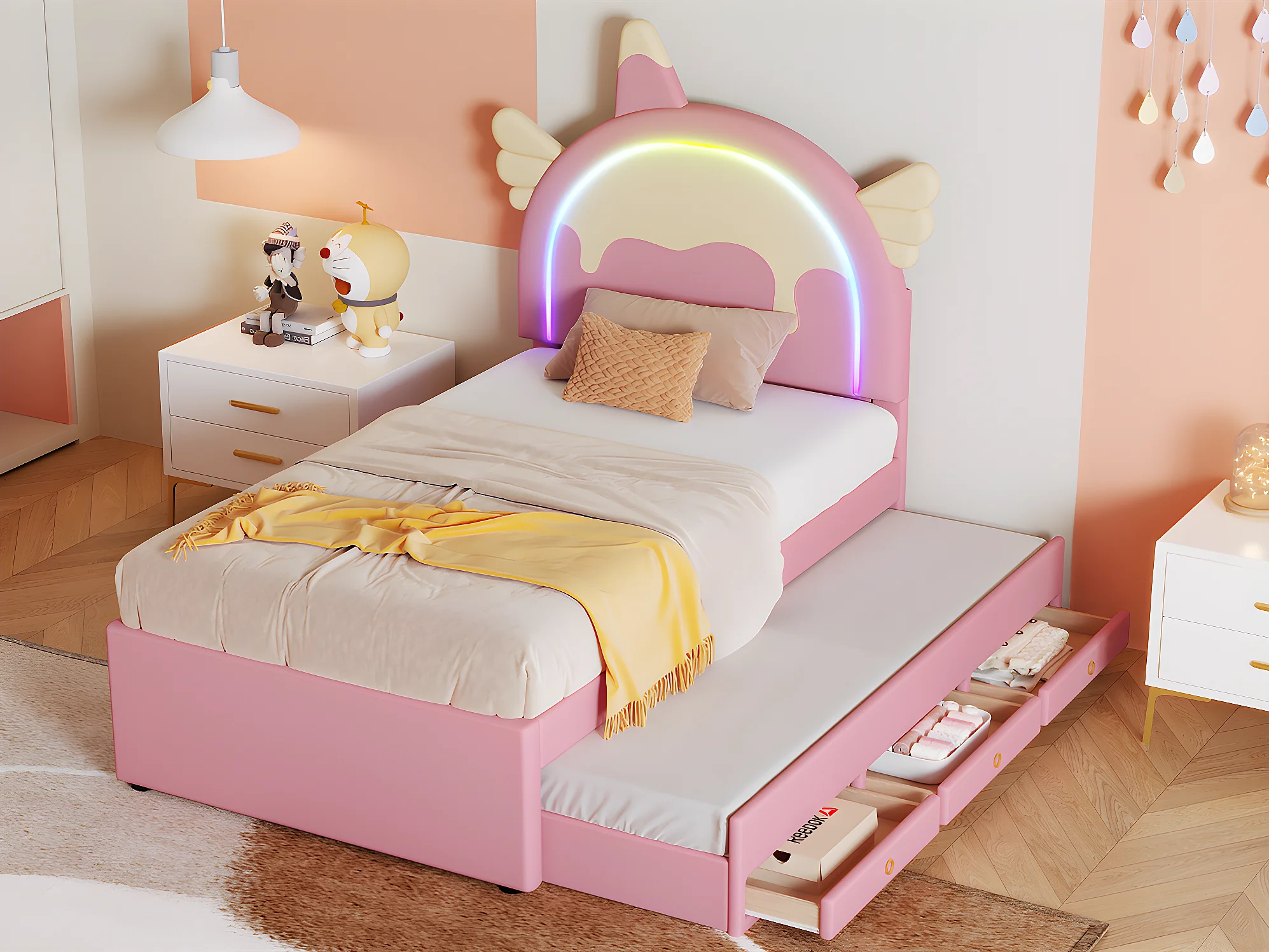 Kinderbed 90x200cm met onderschuifbed 90x190cm - eenhoornvormig hoofdeinde met LED - in kunstleer - Roze