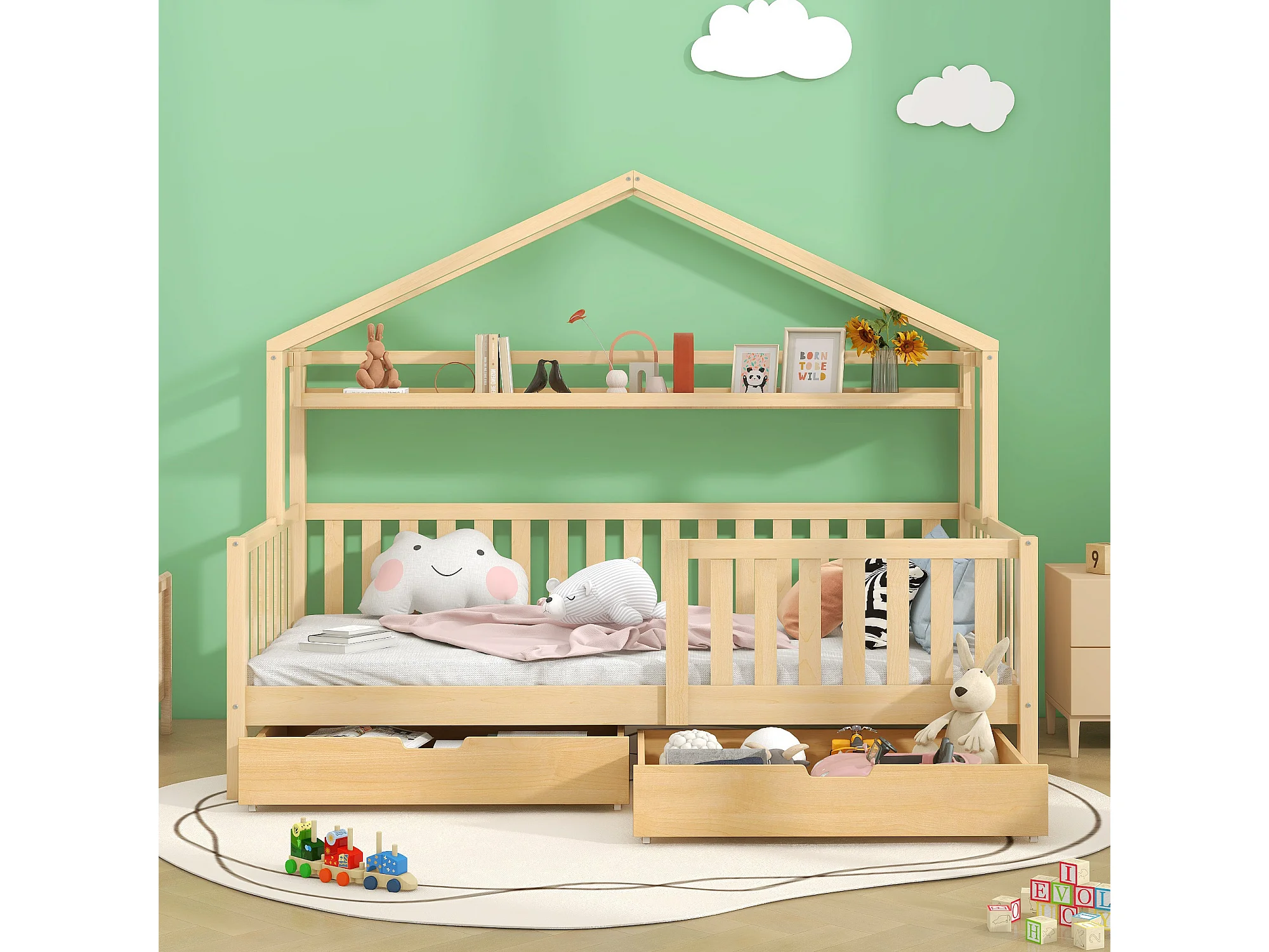 Kinderbed 90x200cm met valbeveiliging - 2 lades en opbergplank - hout - naturel (zonder matras)
