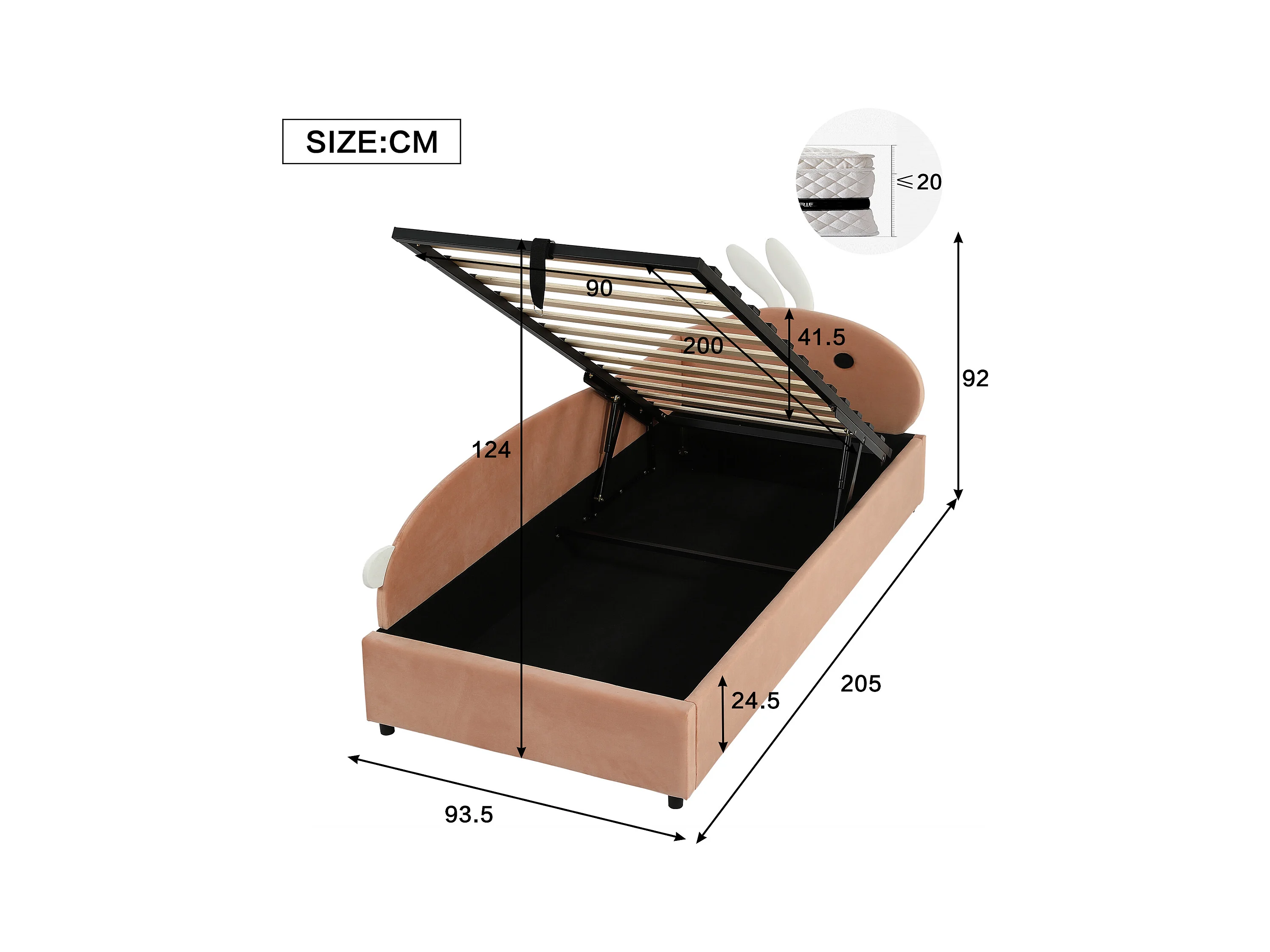 Kinderbed met hydraulische opbergruimte - 90 x 200 cm - met konijnenhoofdeinde - fluweel - knoprood (linkerpaneel)