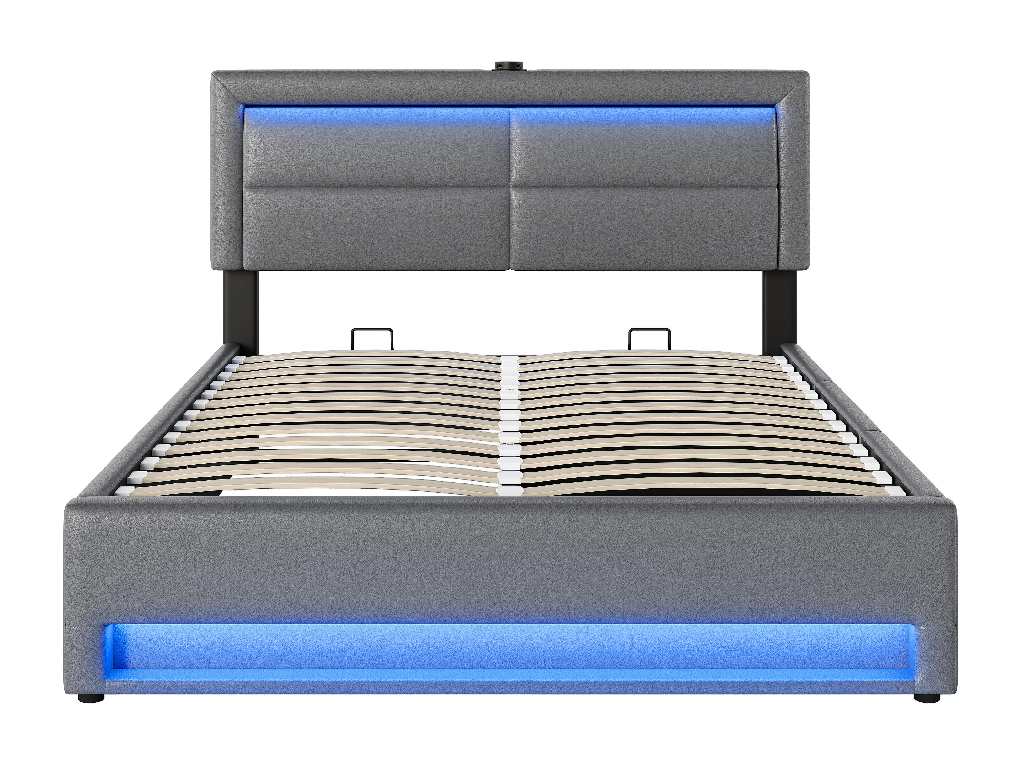 Kinderbed met opbergruimte 140x190cm met lattenbodem en 3 laden - gewatteerd hoofdbord met USB en LED - kunstleer - grijs (zonder matras)