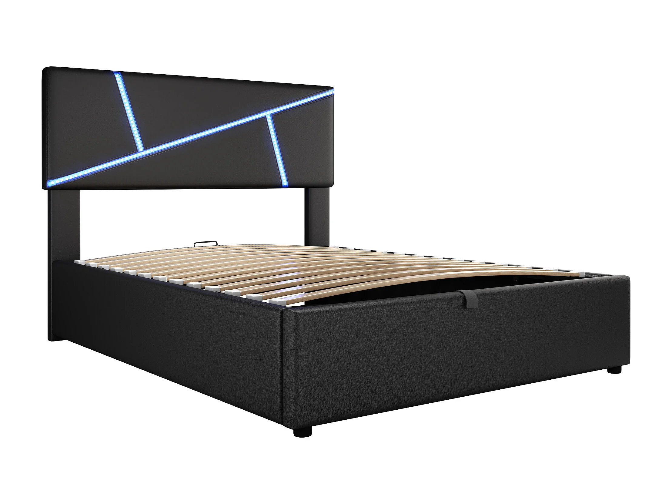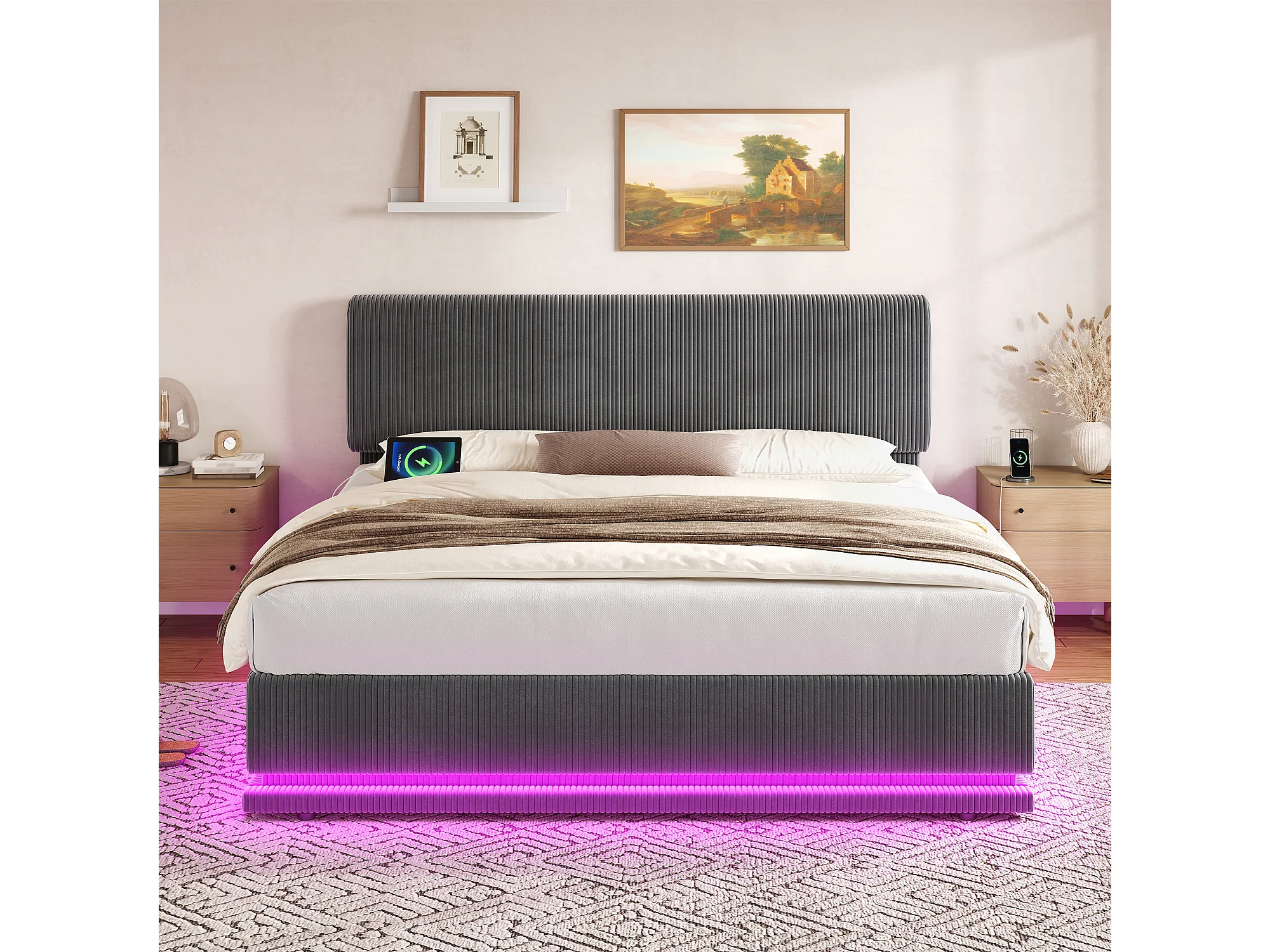 Opbergbed van 160x200 cm met ledverlichting, USB-C-oplaadfunctie en verstelbaar hoofdeinde in grijs, geschikt voor volwassenen en kinderen (matras niet inbegrepen).