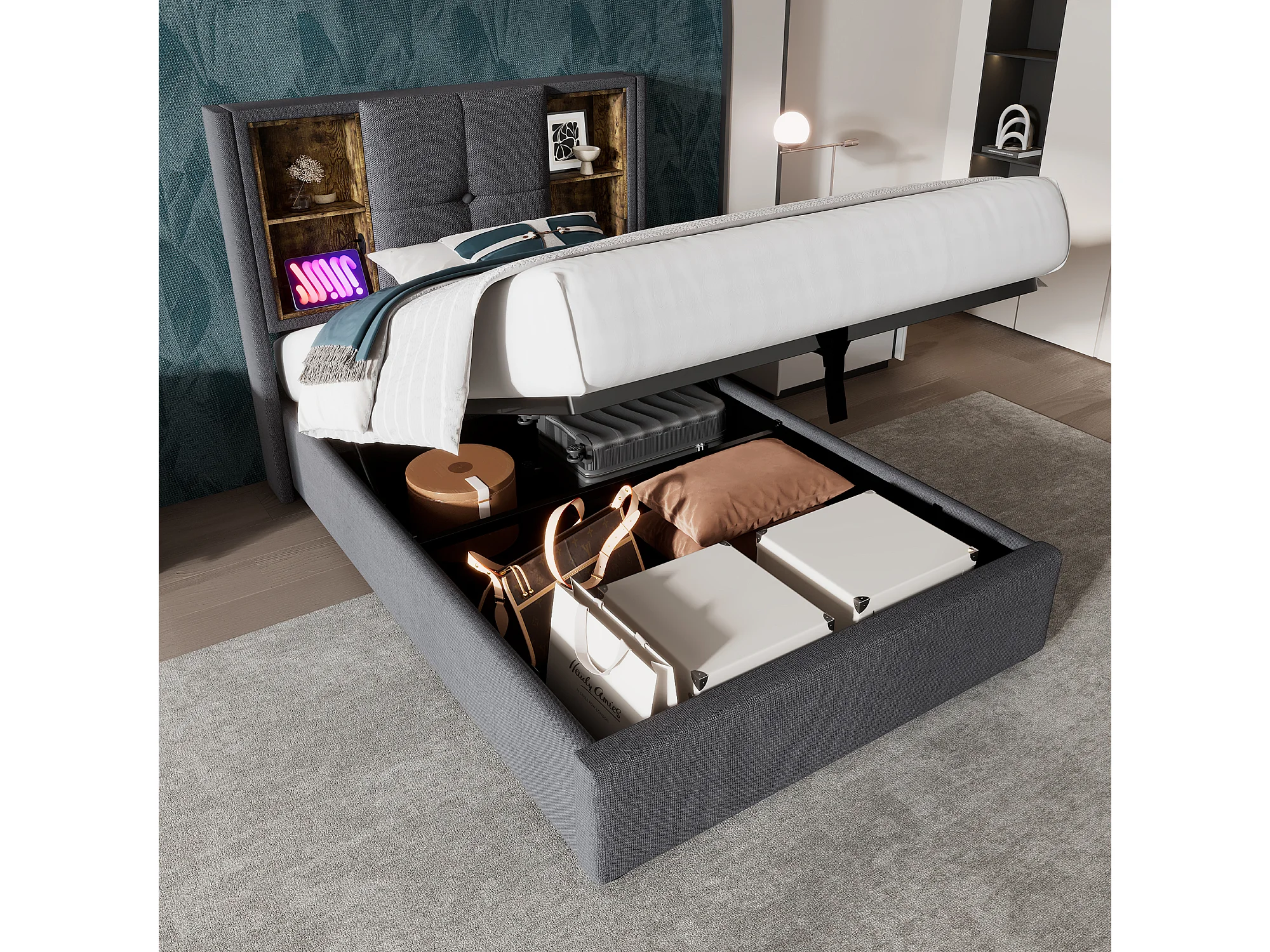 Opbergbed 90x200 cm met opbergruimte en hoofdbord met draadloos opladen, USB en Type C in grijs katoen (zonder matras)