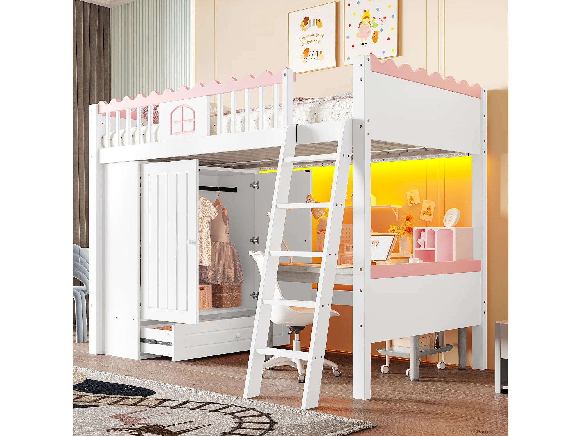 Kinderhoogslaper - 90 x 200 cm - met kledingkast en opberglade - LED-verlichting - grenenhout - wit
