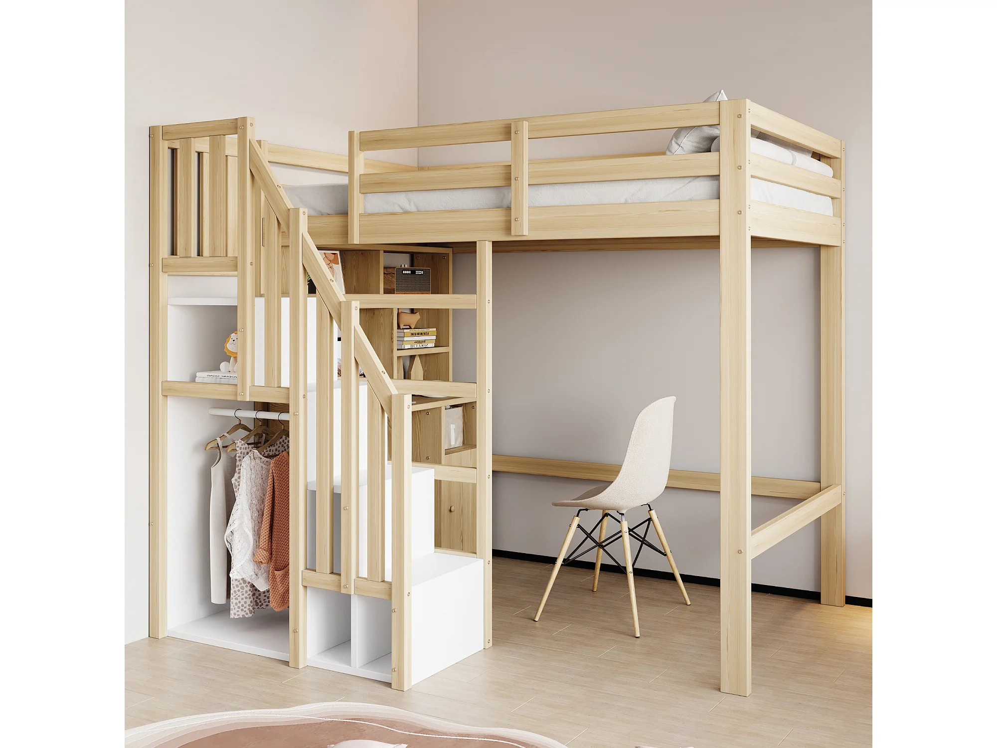 Kinderhoogslaper - 90 x 200 cm - met opbergtrap + kledingkast - hout - naturel