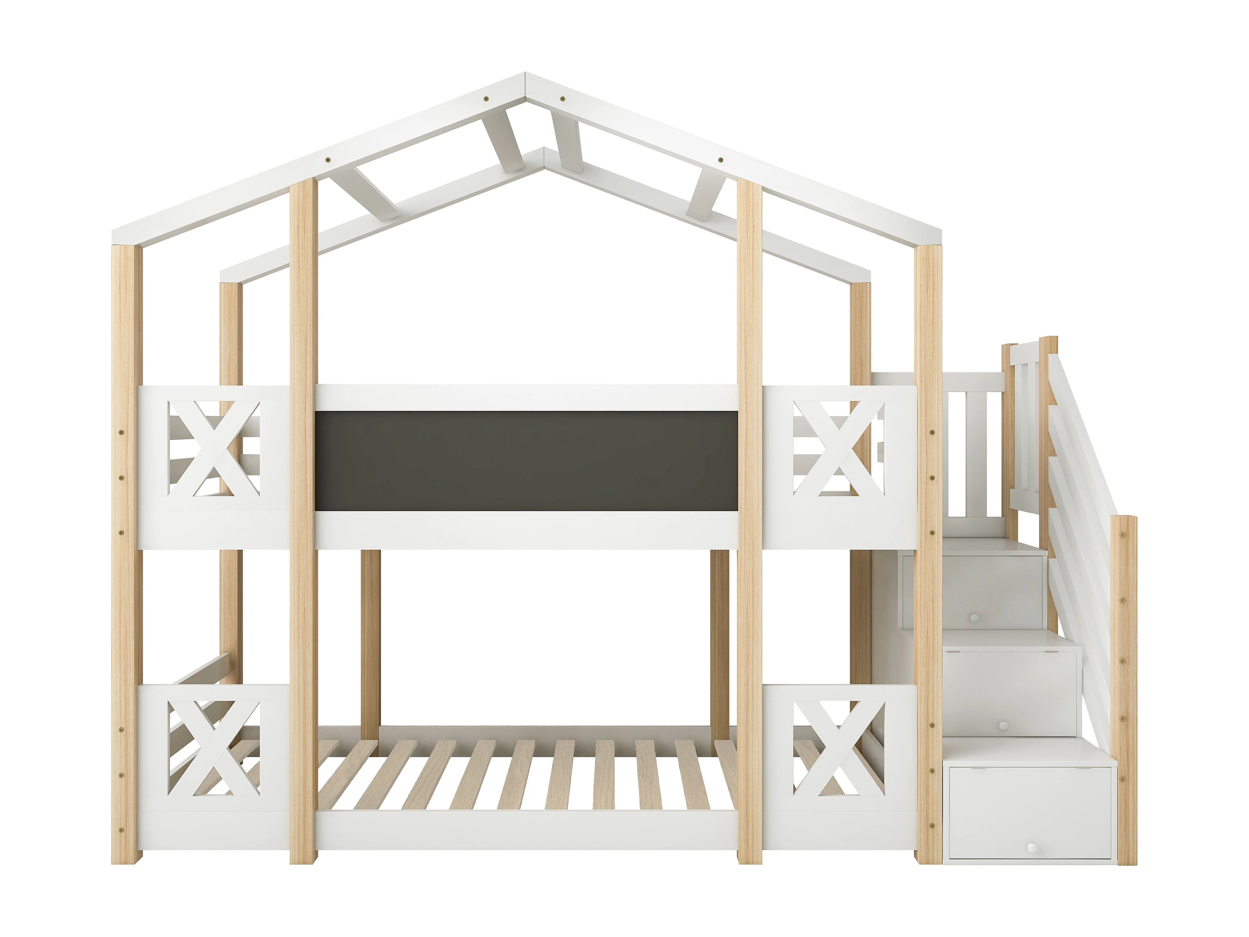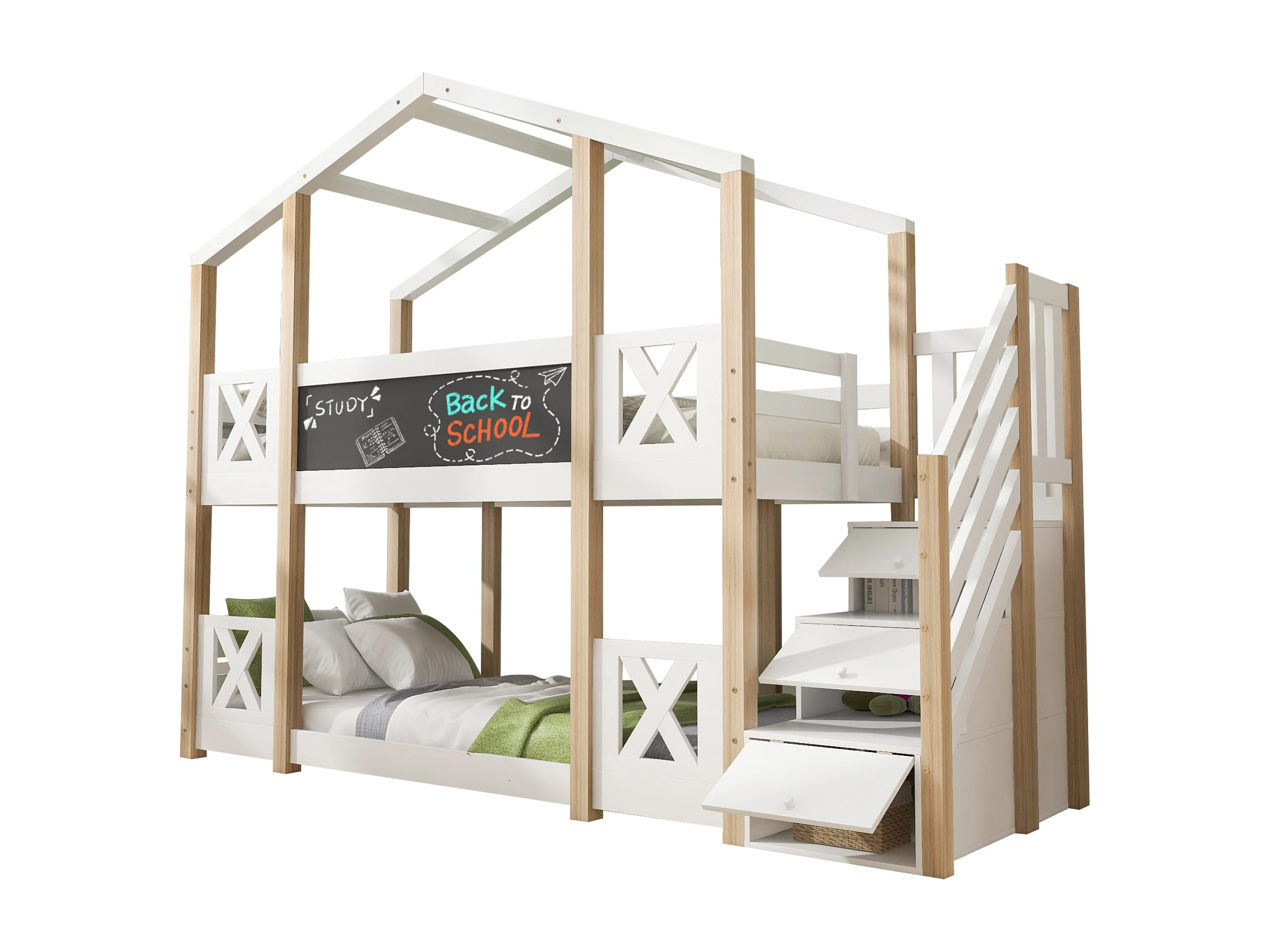 Kinderhuisbed 90x200 cm - Boomhuis met Schoolbord en Opbergruimte - Trap Met Kastjes Veiligheidsleuning - Hout - Wit+Lichtbruin - Zonder matras