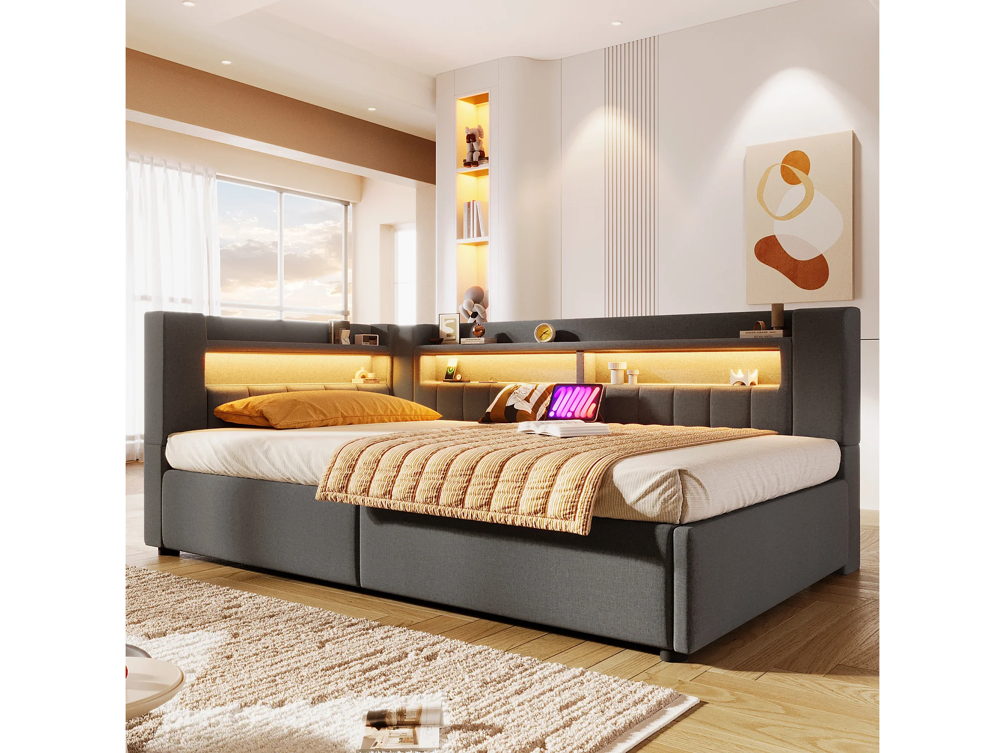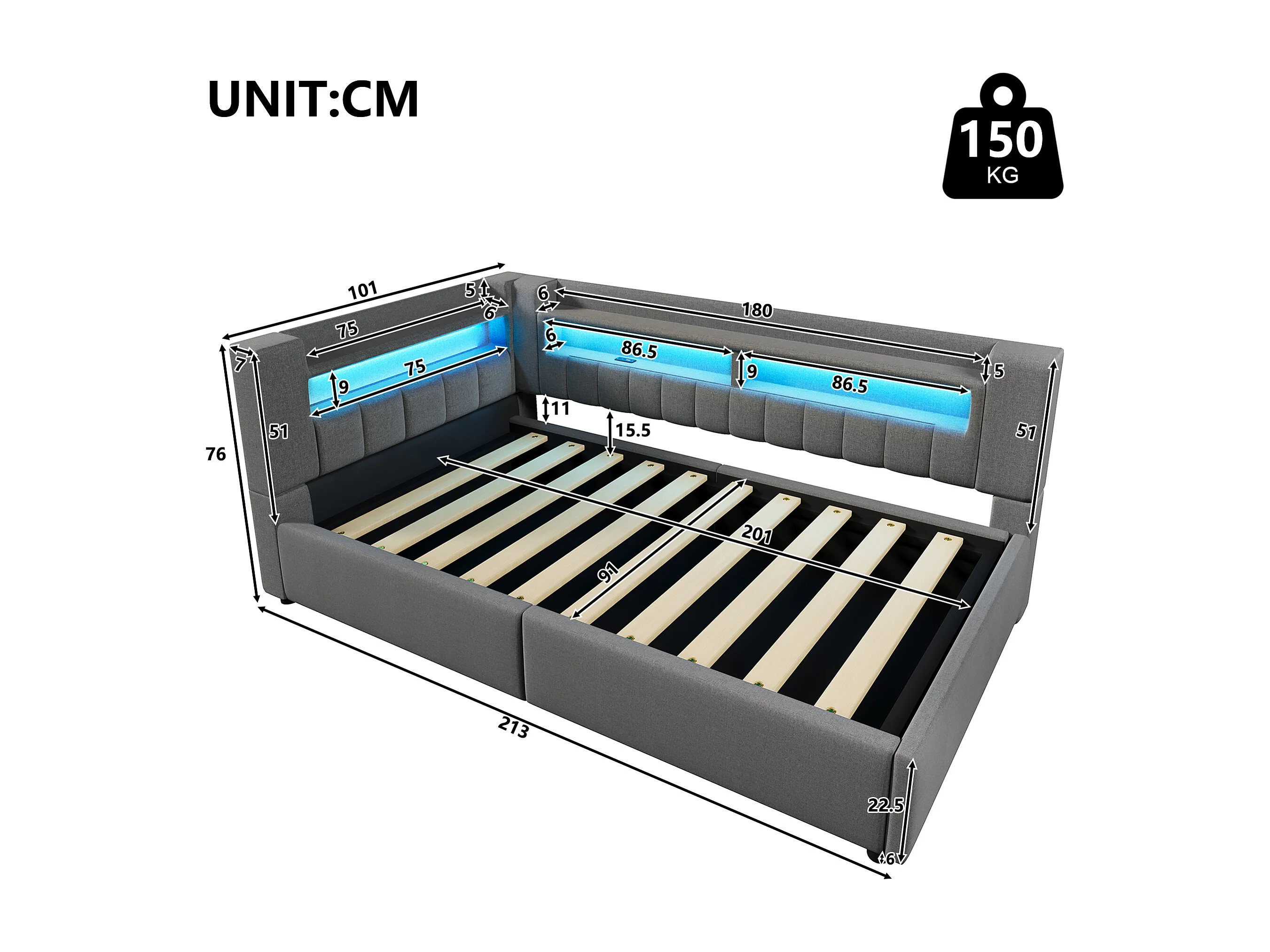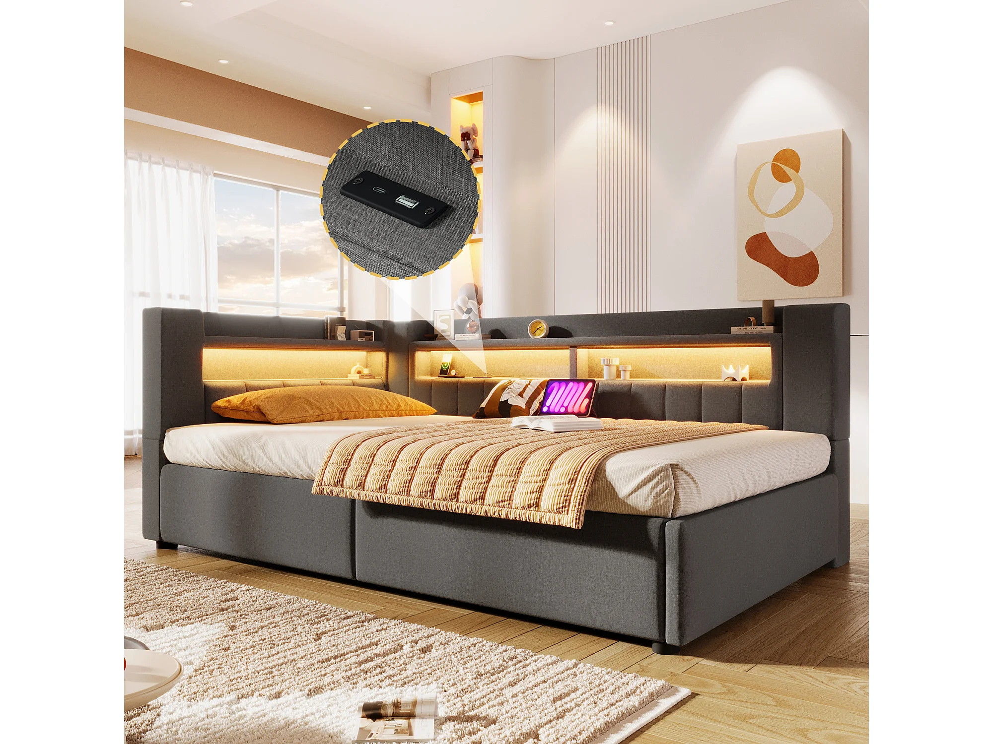 Kinderslaapbank met hydraulische opbergruimte - 90 x 200 cm - met USB + Type-C + LED's + opbergruimte - linnen - grijs