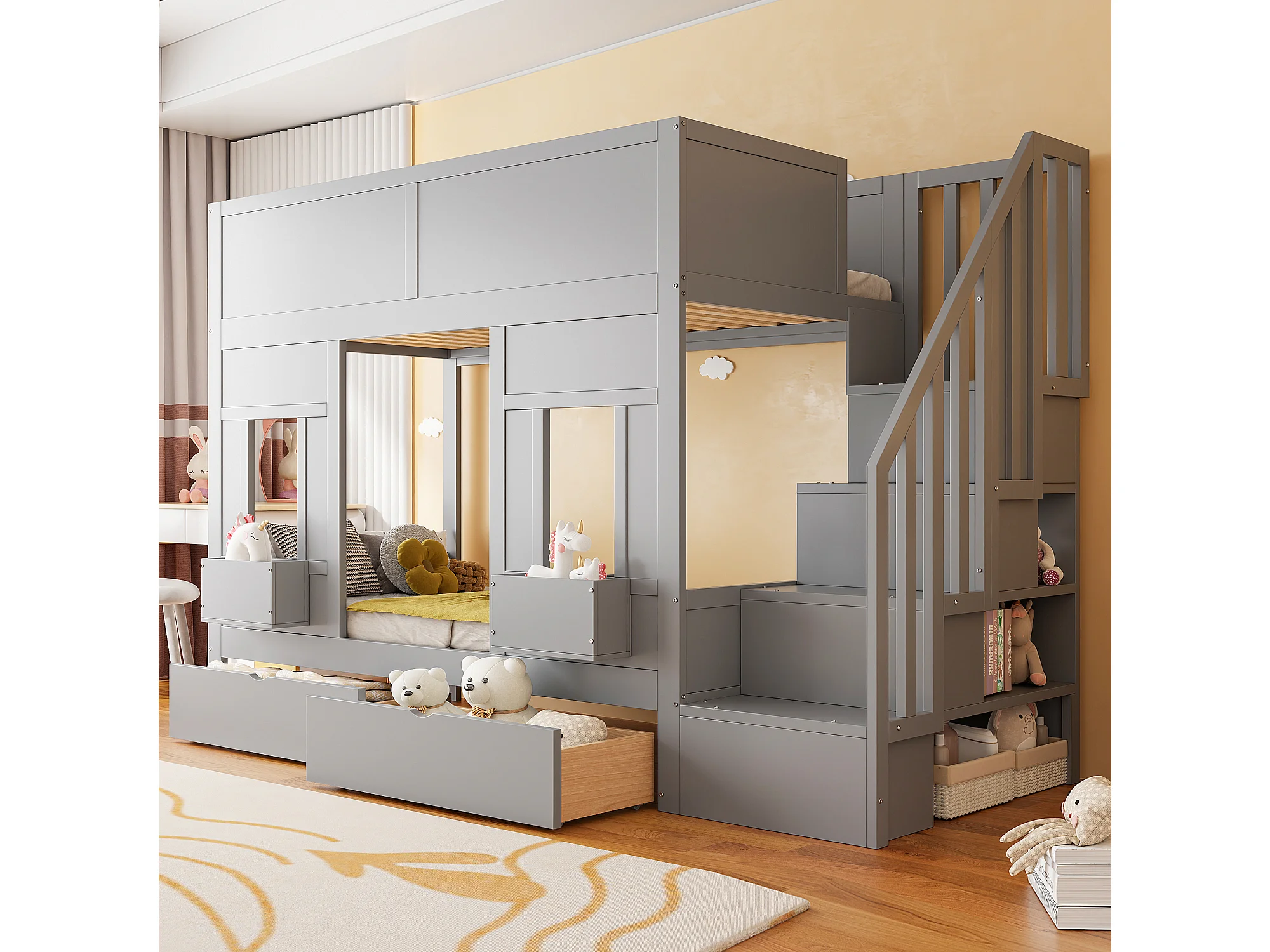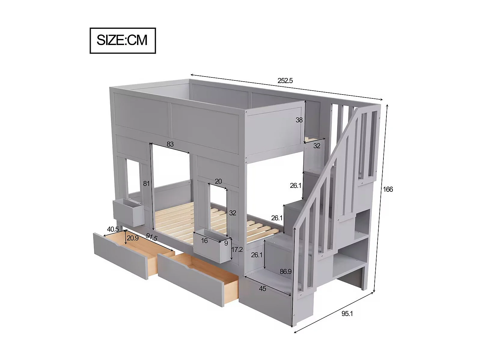 Kinderstapelbed - 2 x 90 x 200 cm - met opbergladder + lades + veiligheidsrail - hout - grijs