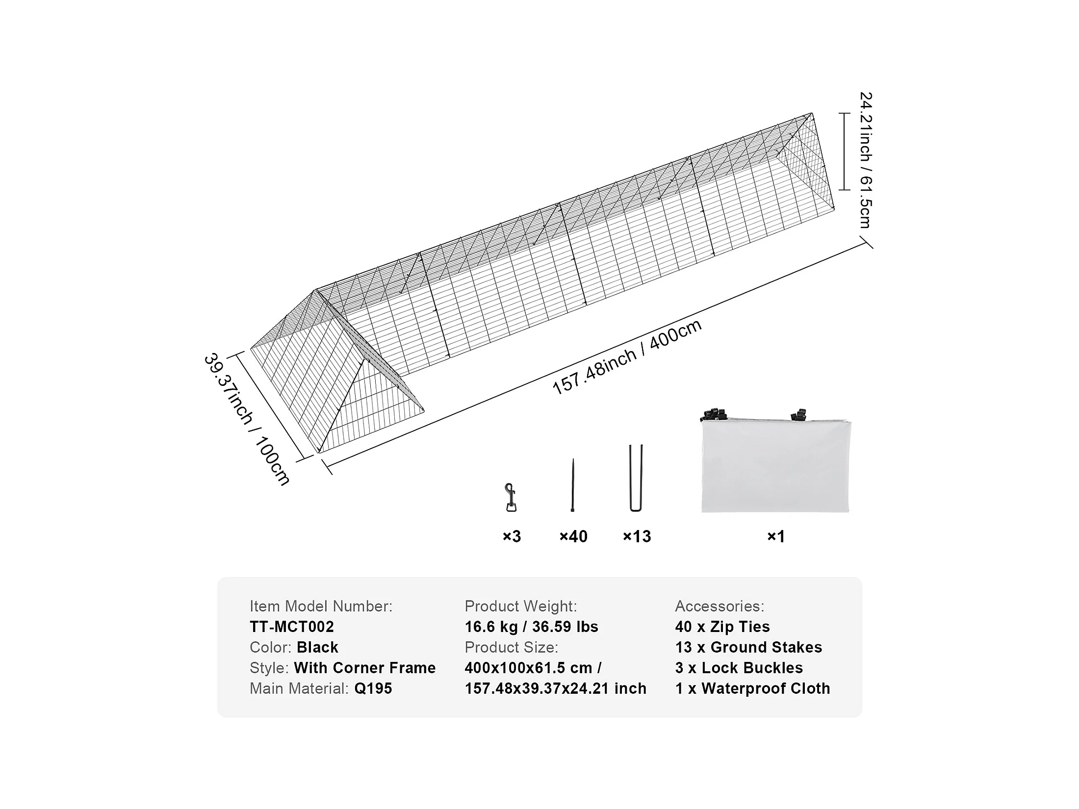 Kipkooihek SucceBuy, 400 x 100 x 61cm, Draagbare Buitentunnel, Groen, voor Kippen, Eenden, Konijnen, Groen