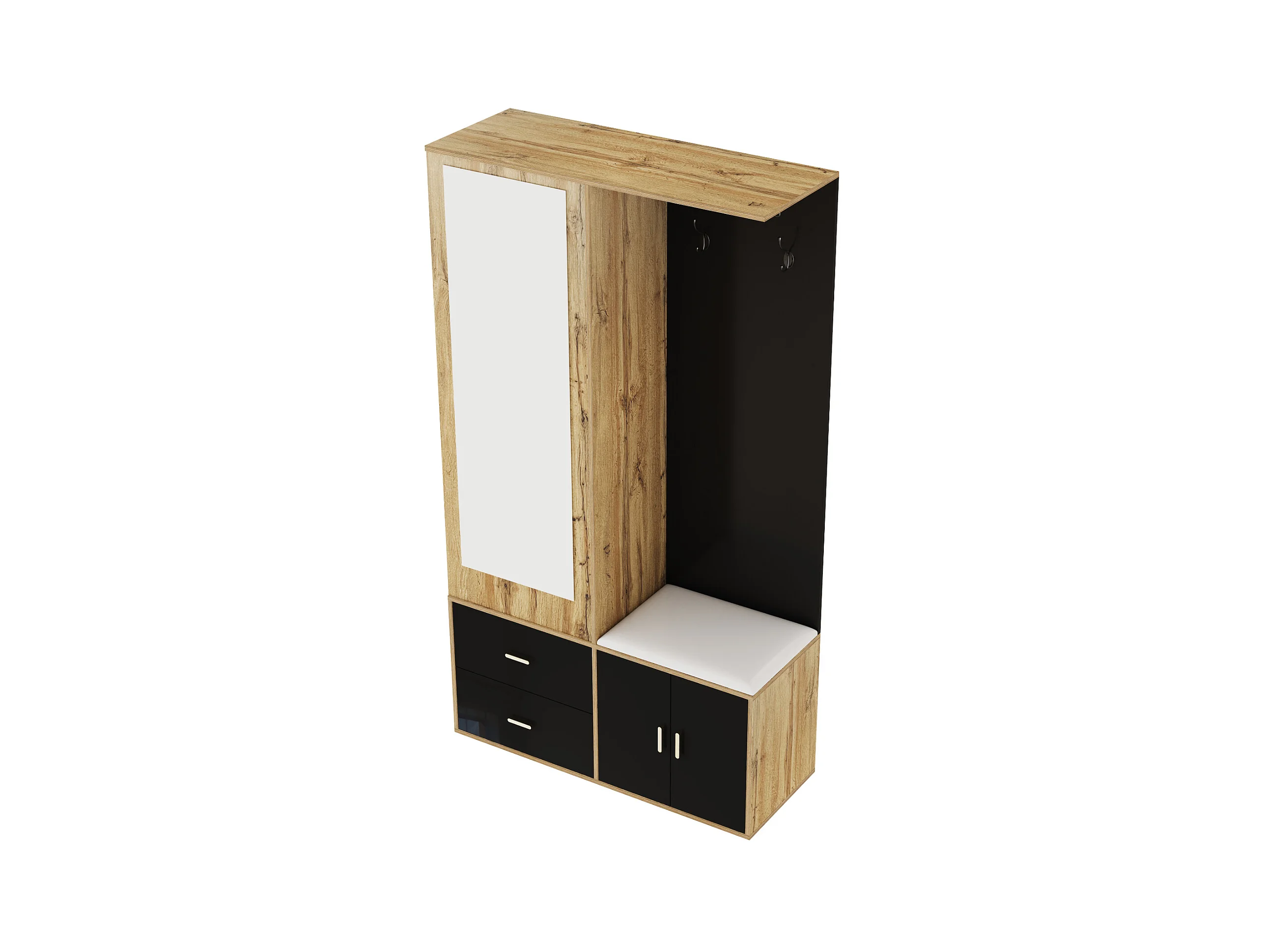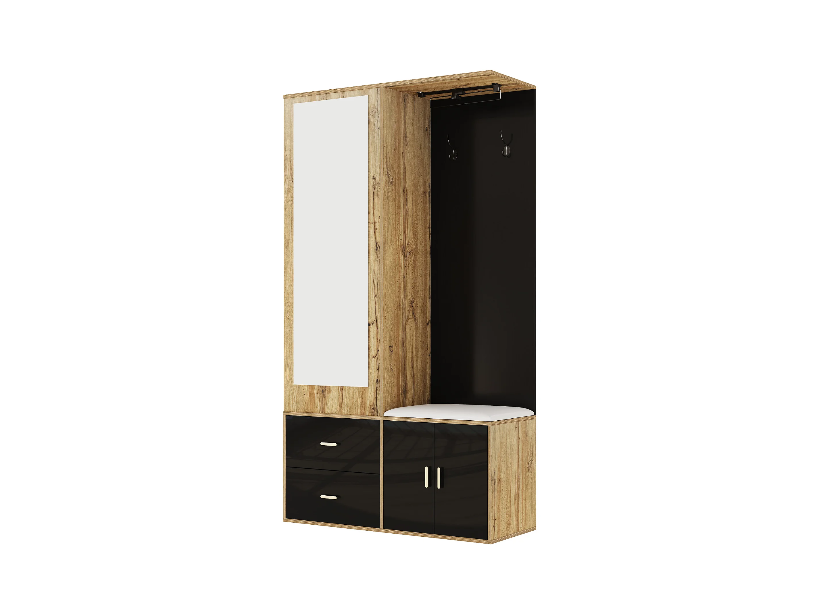 Garderobeset 100×38×191 cm - met kapstok en schoenenkast - haakjes en 1 spiegel - naturel + zwart