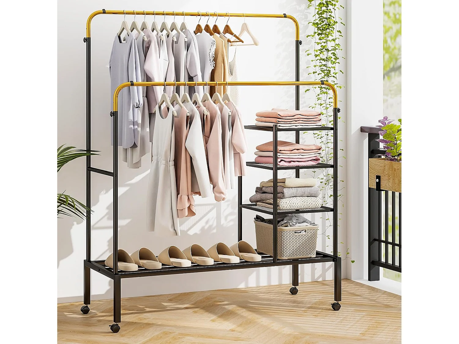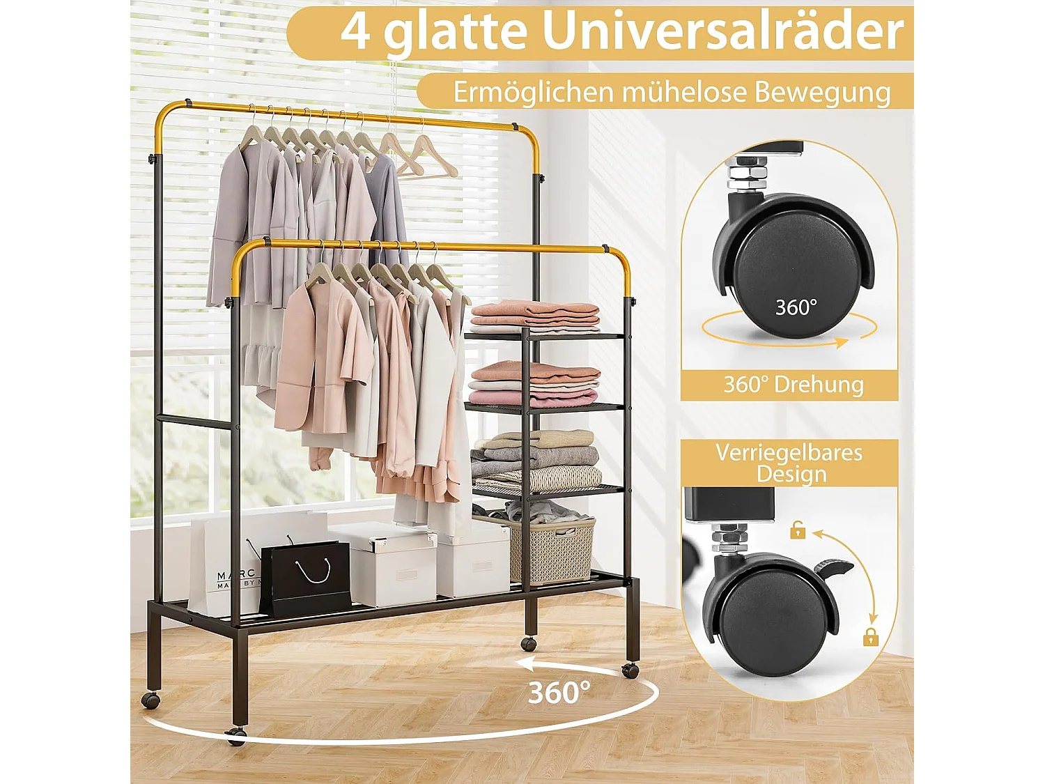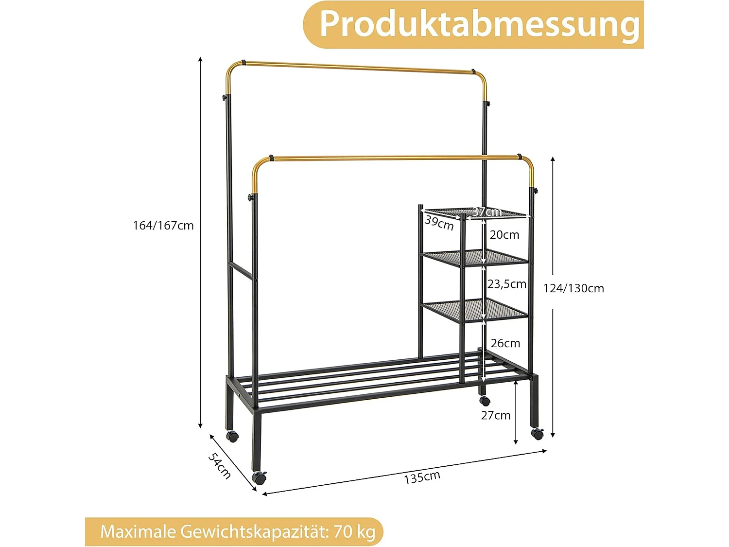 Kledingrek met 2 kledingstangen, wasrek op wieltjes, kapstok in hoogte verstelbaar met 3 lagen zijplanken, mantelstandaard van metaal, 135 x 54 x 170 cmVL32466