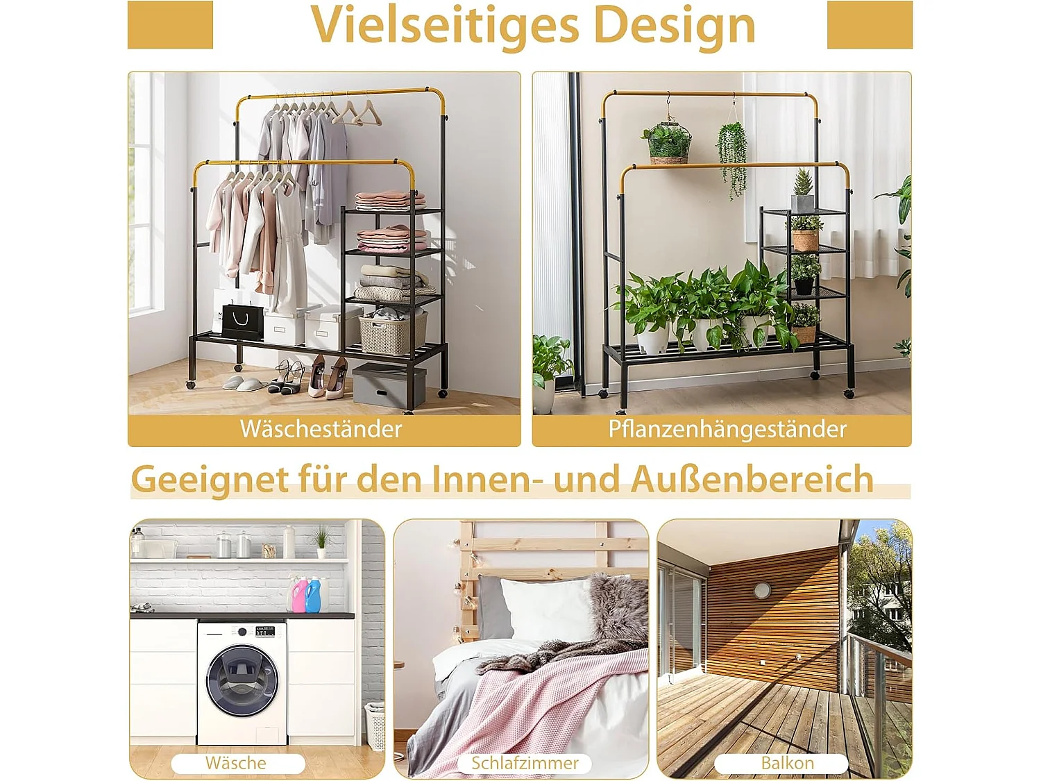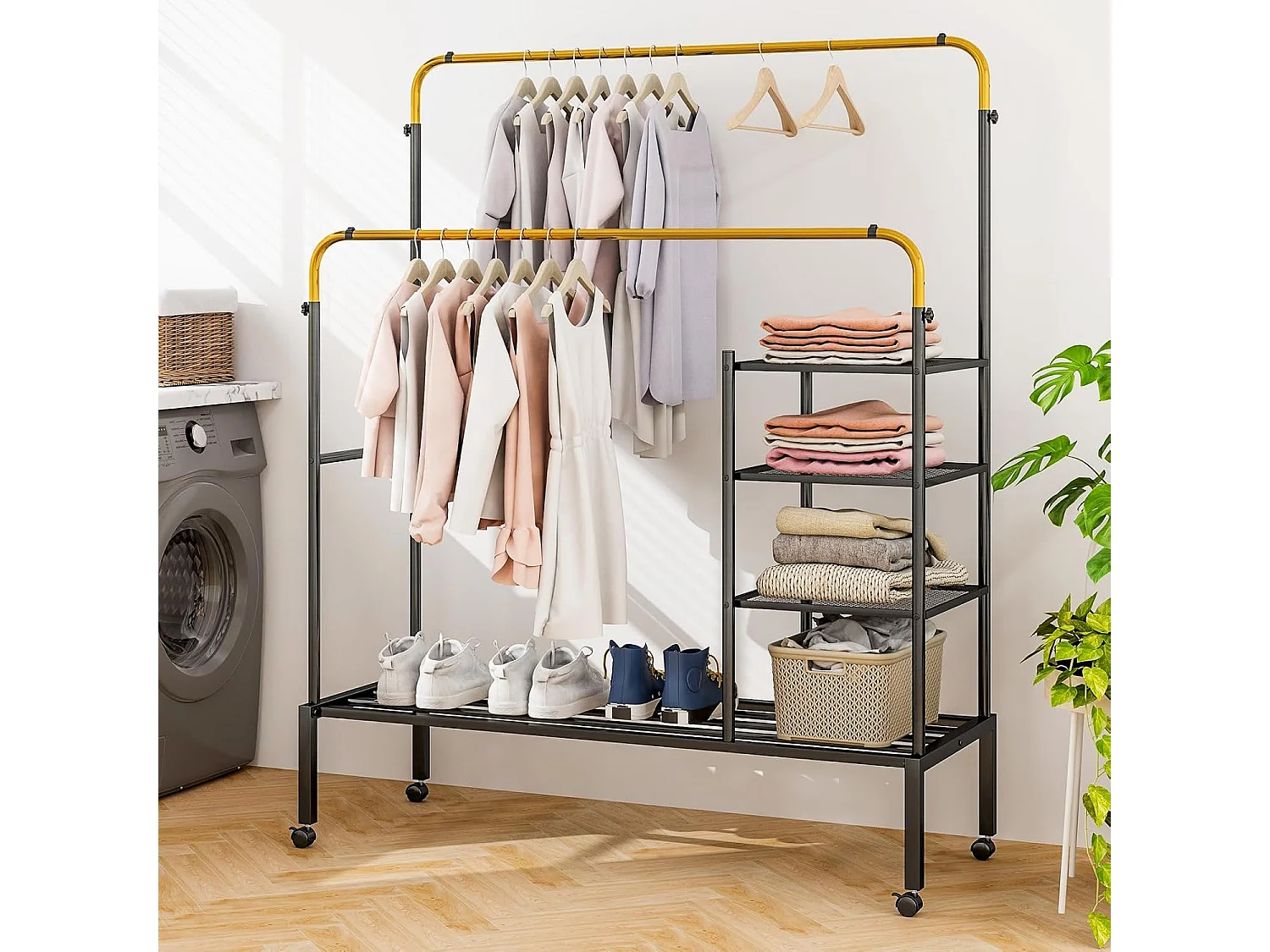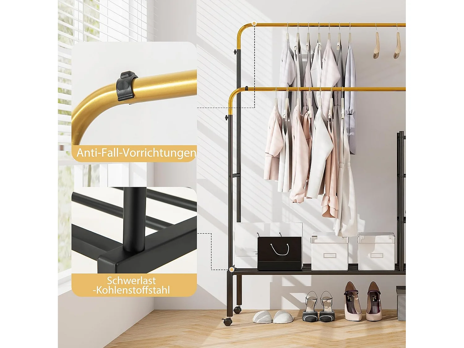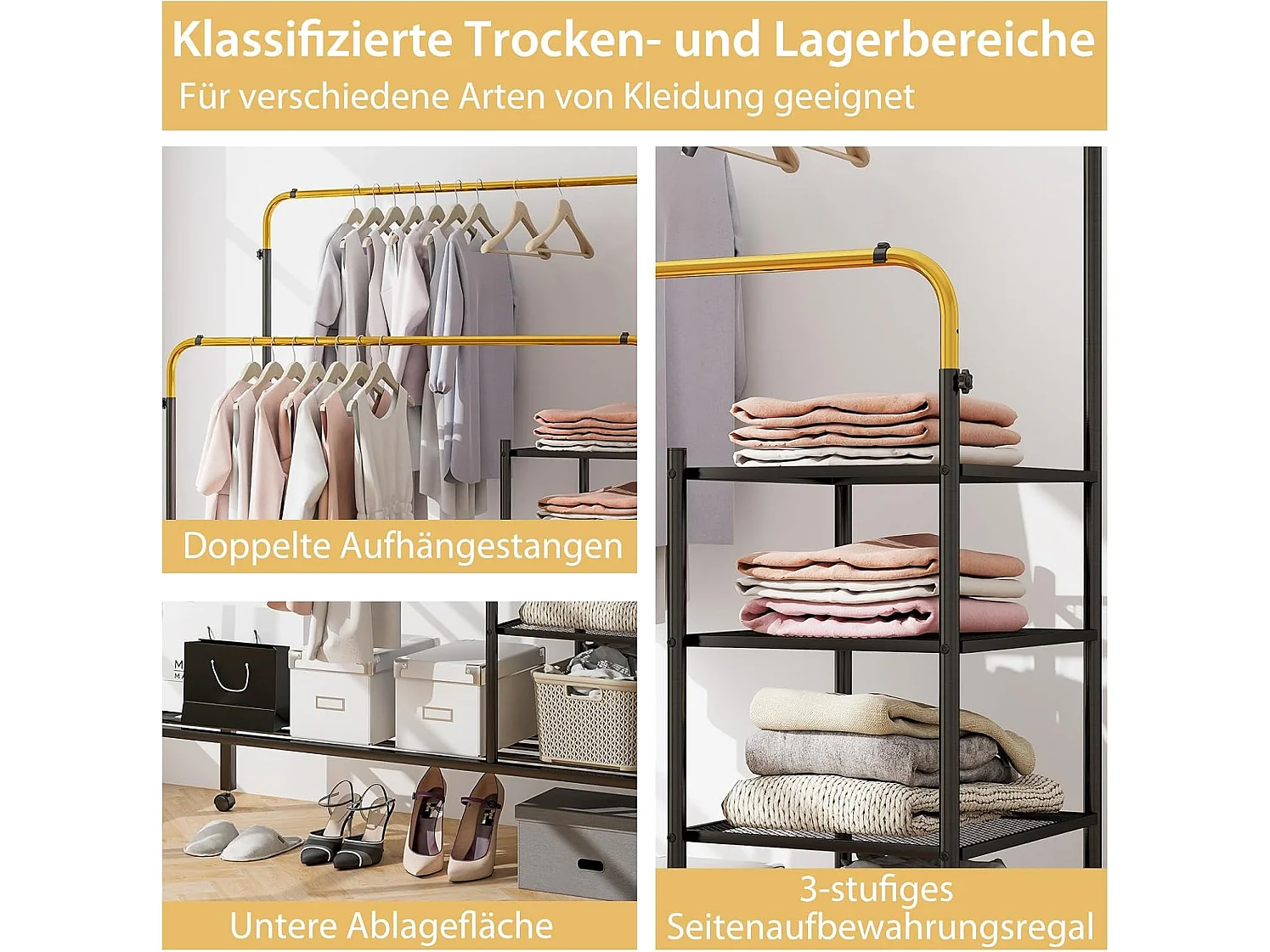 Kledingrek met 2 kledingstangen, wasrek op wieltjes, kapstok in hoogte verstelbaar met 3 lagen zijplanken, mantelstandaard van metaal, 135 x 54 x 170 cmVL32466