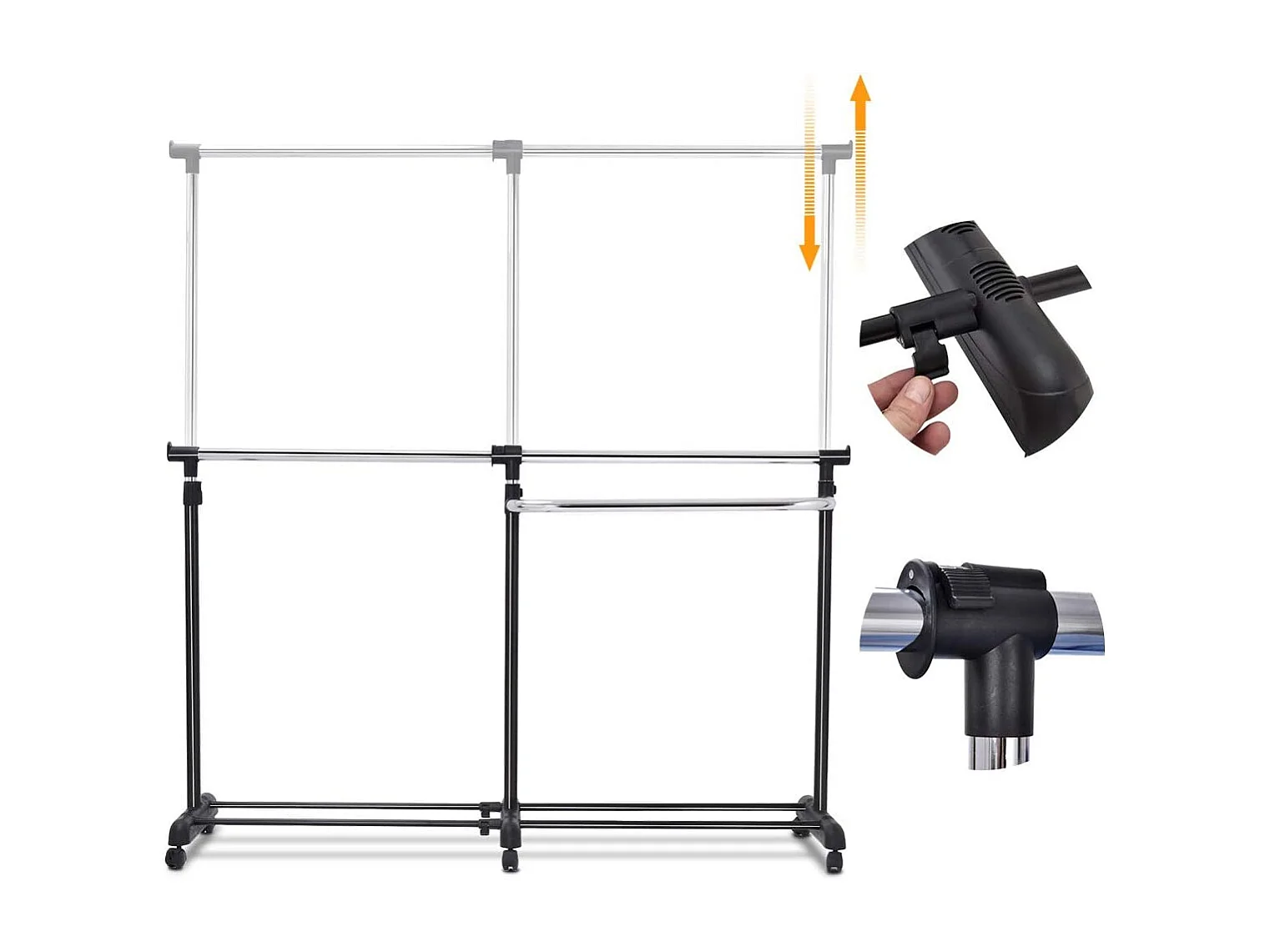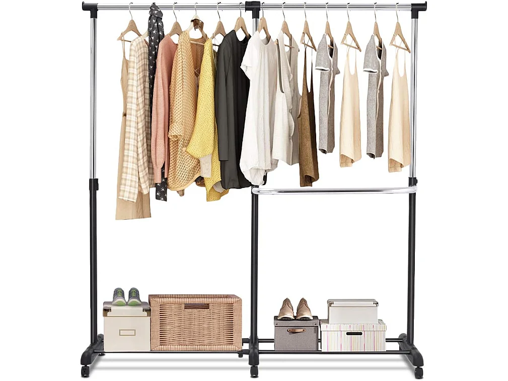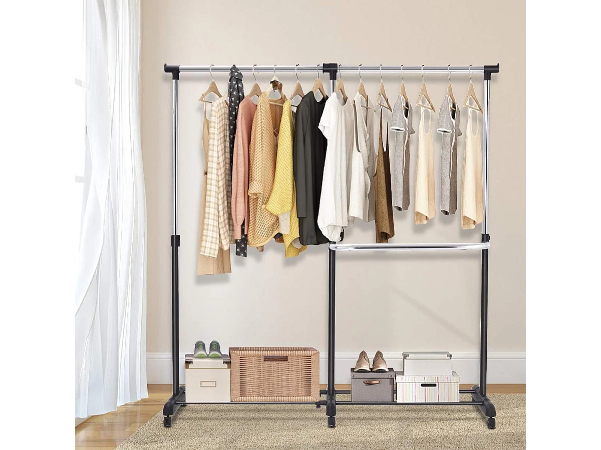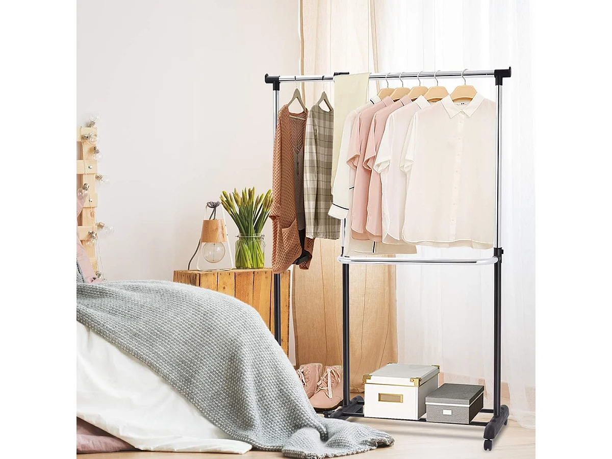 Kledingrek, uittrekbaar, in hoogte verstelbare garderobewagen, kledingstang met 2 enkele stangen,mobiele kledingkast op wielen,(91-160) x 43 x (93-168) cm
