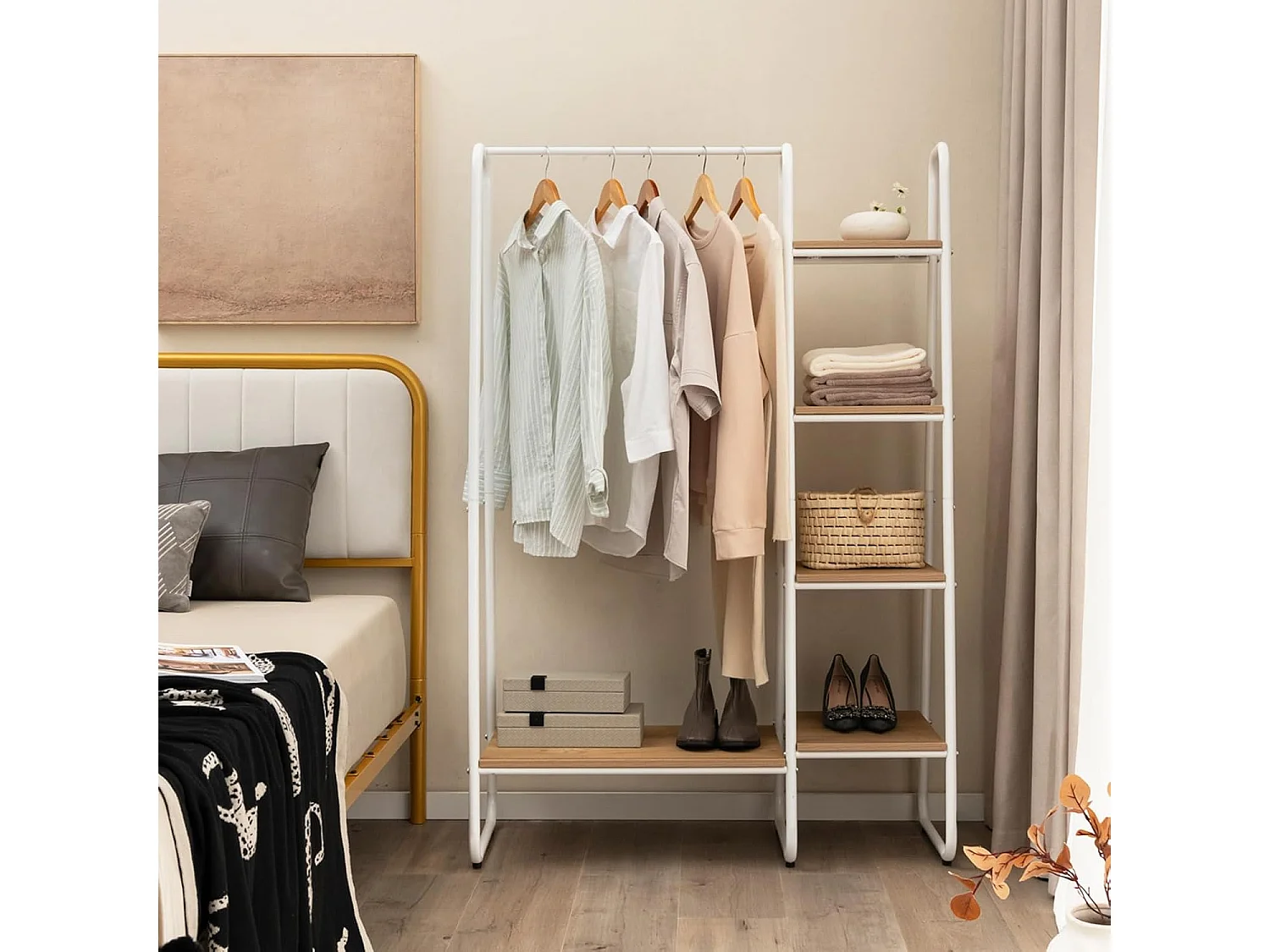 Kledingrek van metaal, vrijstaande garderobe met 4 planken, open kledingrek voor het ophangen van kleding en voor het opbergen van slaapkamer,entree(natuur)VL32545