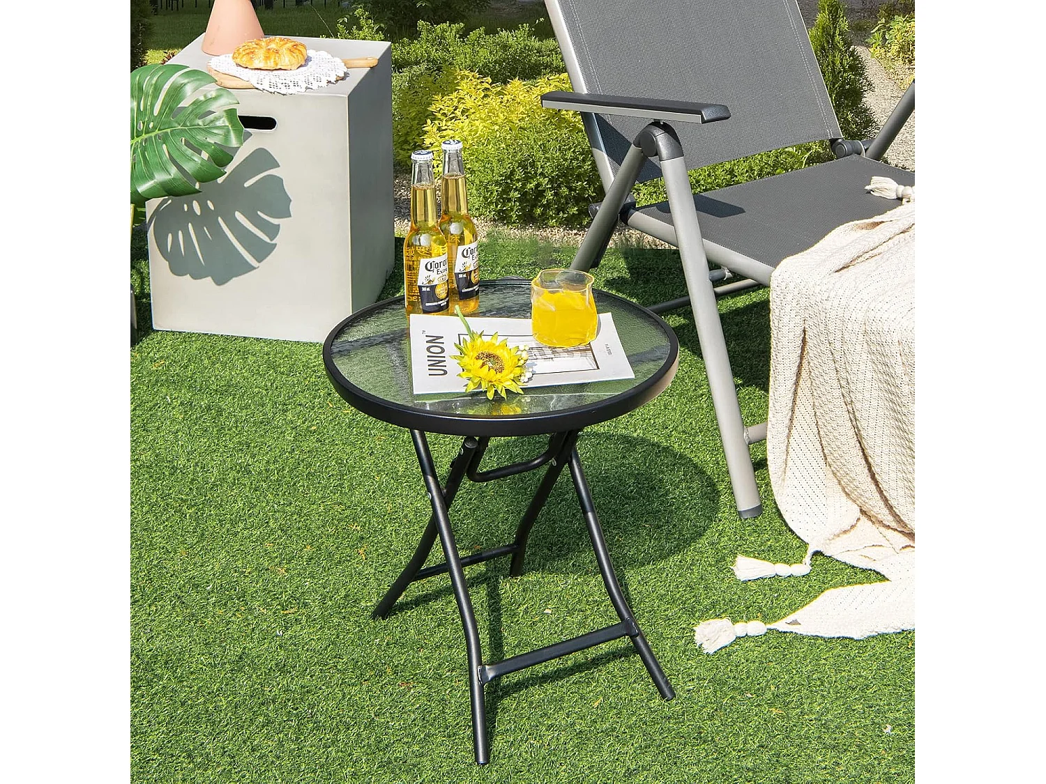 Kleine bistrotafel, inklapbare bijzettafel, ronde tuintafel, diameter 46 cm, salontafel met tafelblad van gehard glas, balkontafel voor terras, balkon, tuin