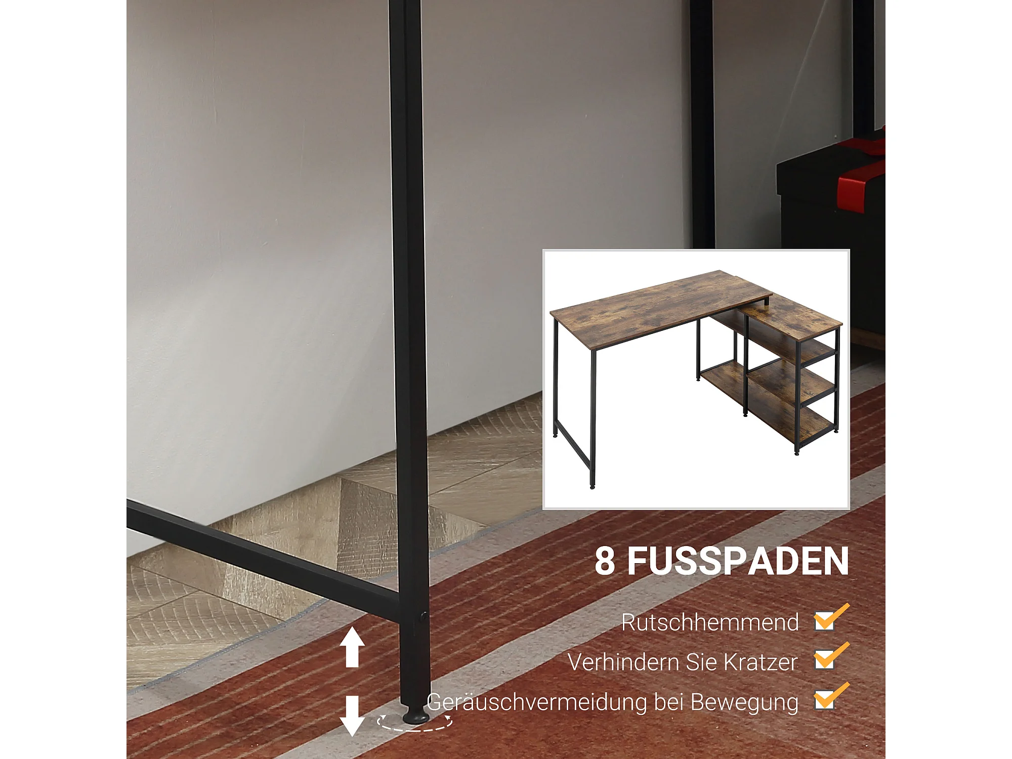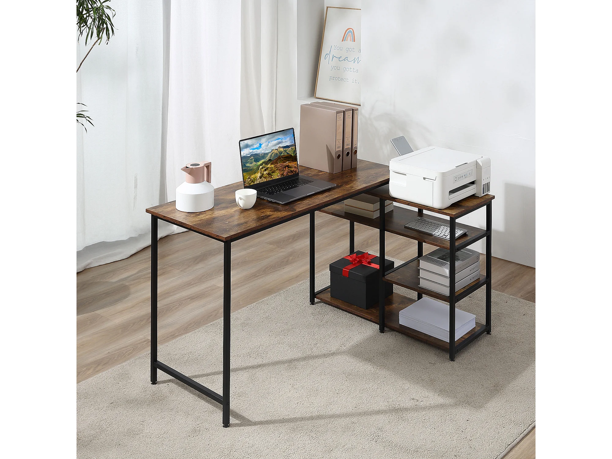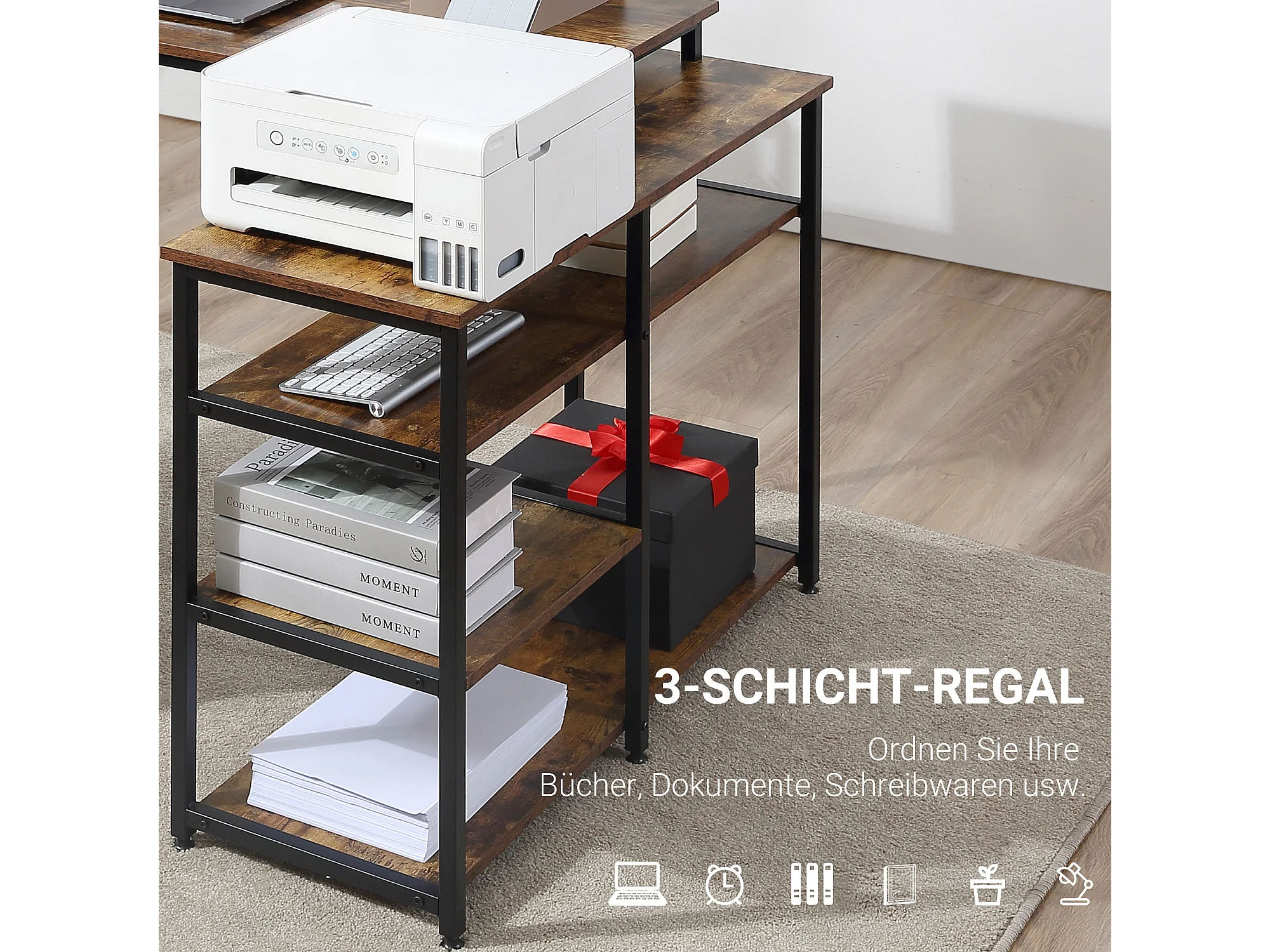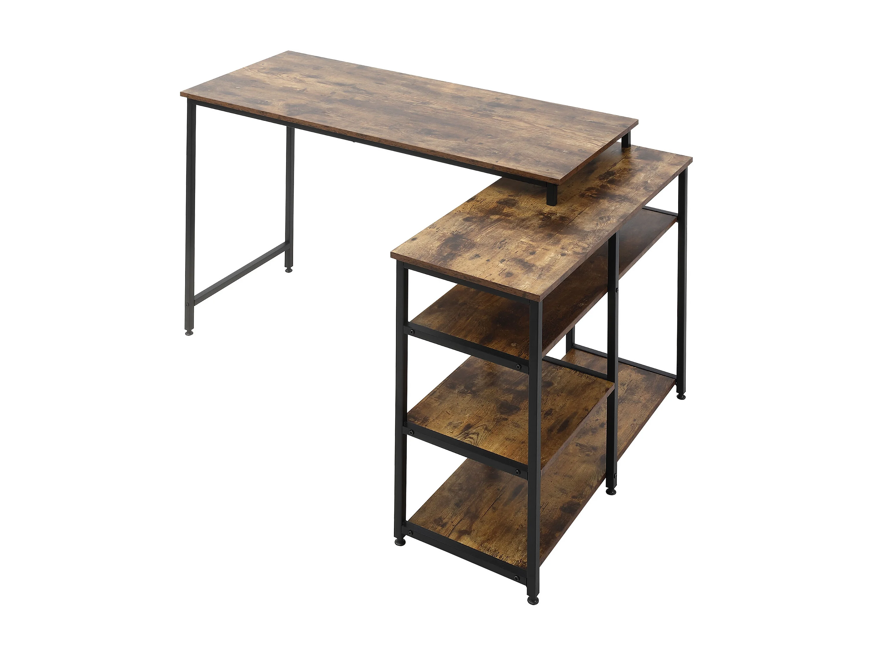 L-vormig hoekbureau met planken en lade, metaal, hout, bruin (135x90x79 cm)