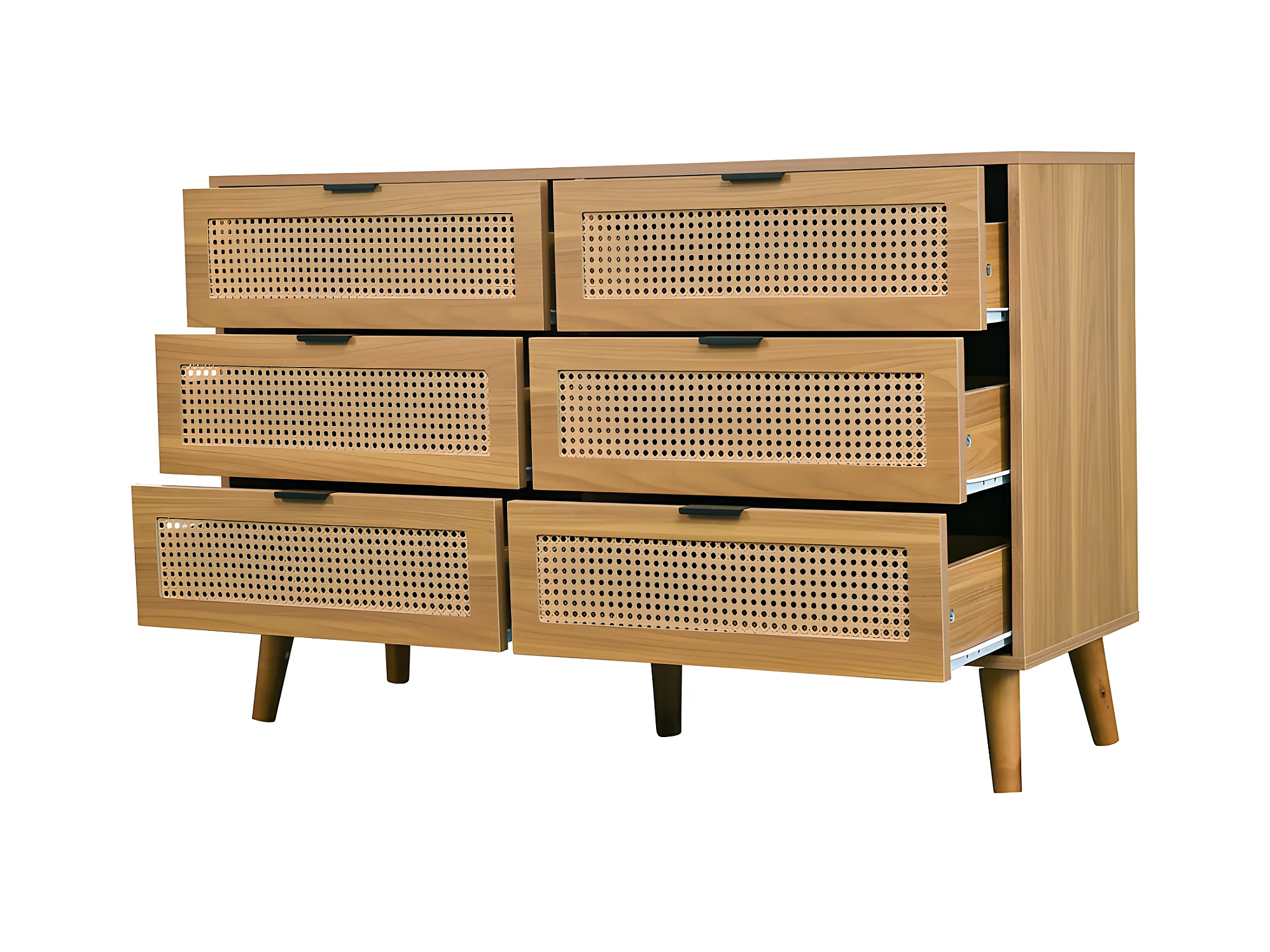 Buffet 120x40x74cm - met 6 lades - rotan decoratie - Metalen poten - MDF + Spaanplaat - Bruin