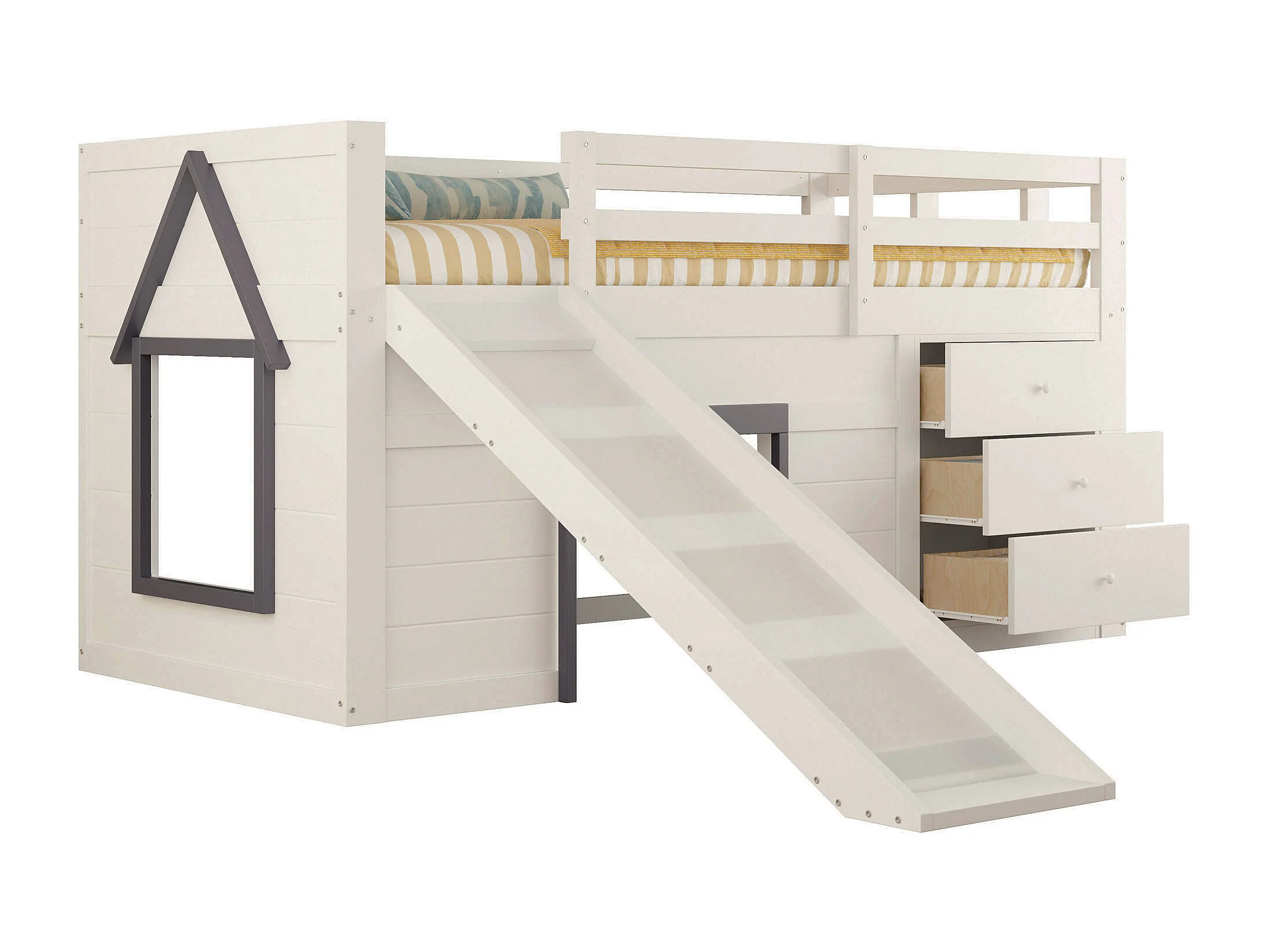 Laag hoogslaper 90x200 cm met glijbaan, 3 lades en 2 deuren, MDF en grenen, crème (213x95x107 cm)